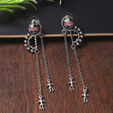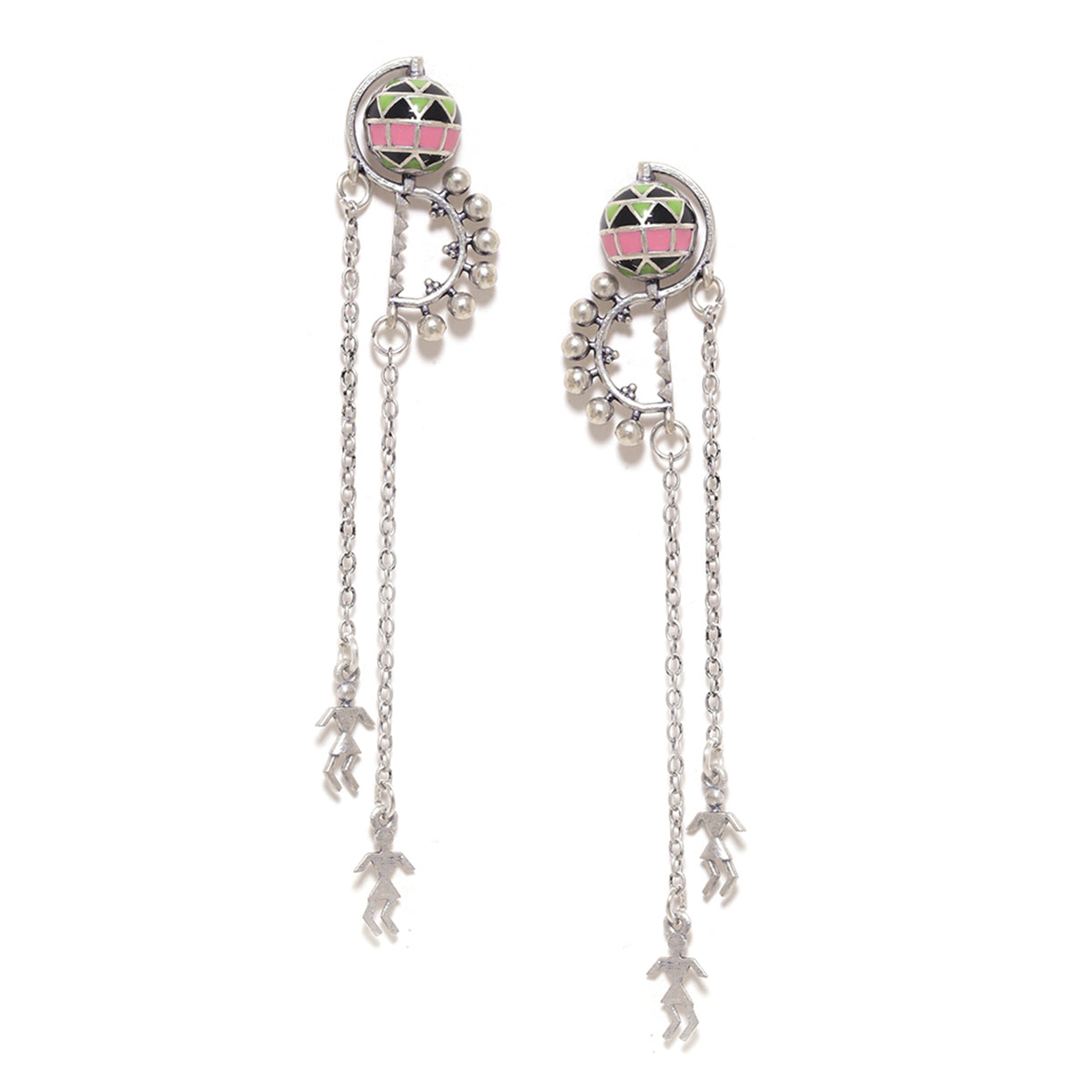 Drop earrings featuring tribal inspired motifs, fashioned after classic prints in Warli art. Oxidised silver plated and made from brass. Perfect match for Indo-Western attire.