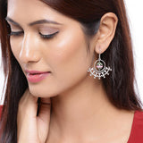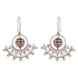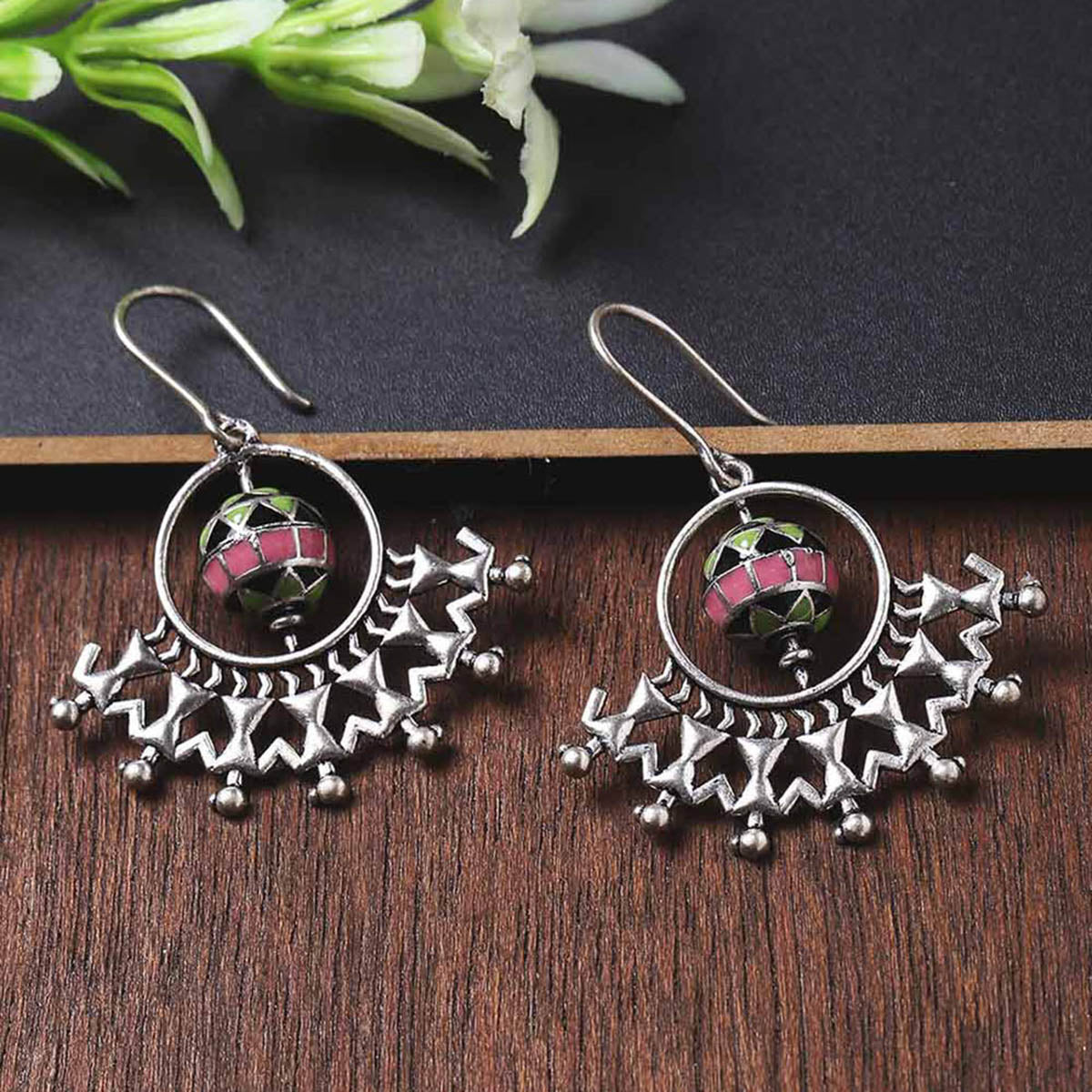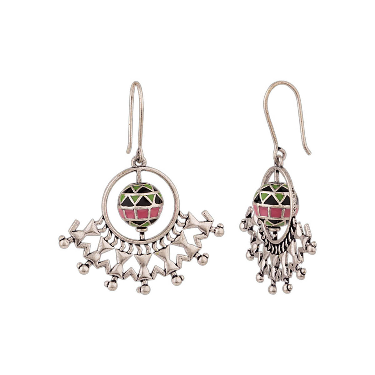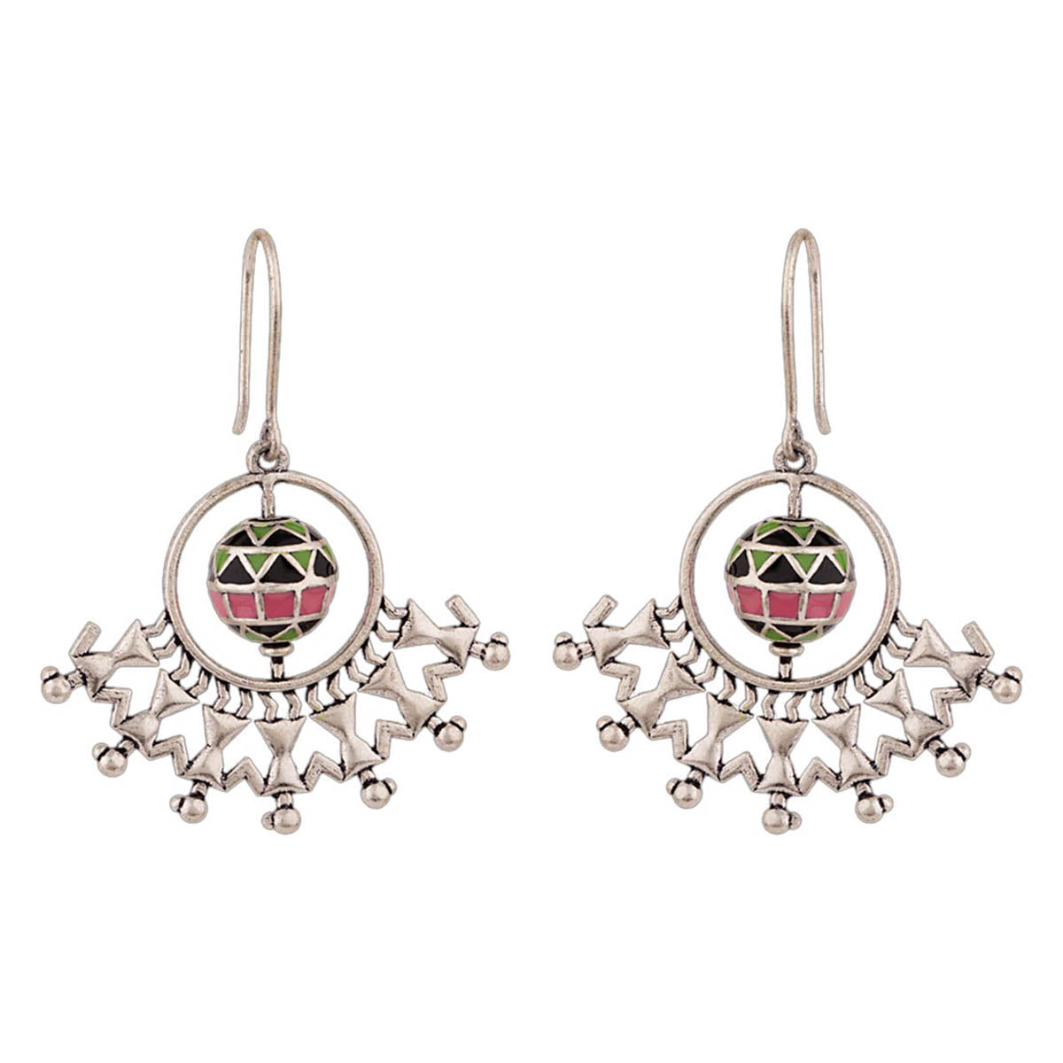 Warli art inspired tribal motifs and the popular fidget spinner toy design adorn these earrings. Oxidised silver plated and made from brass. Wear with ethnic attire.