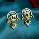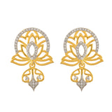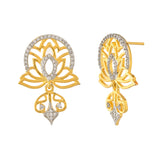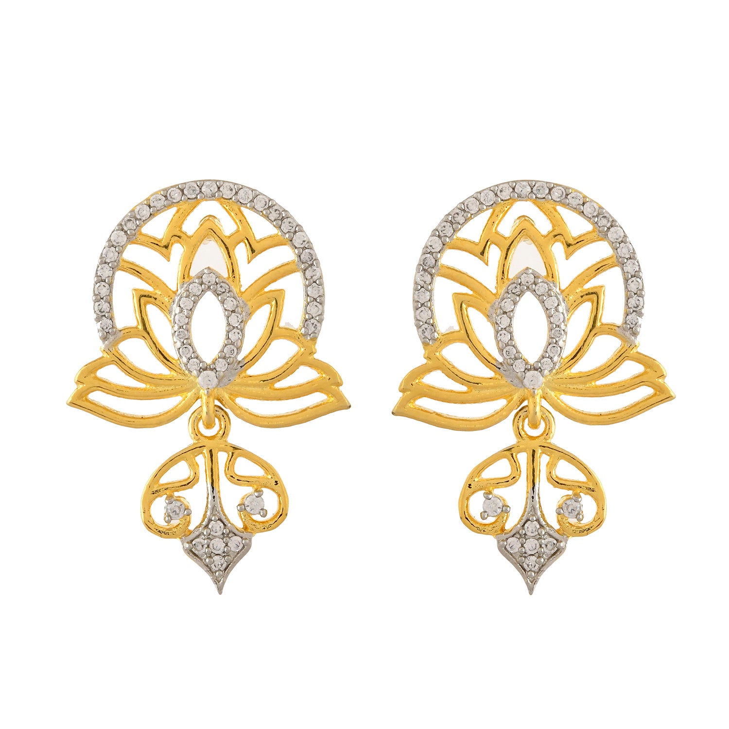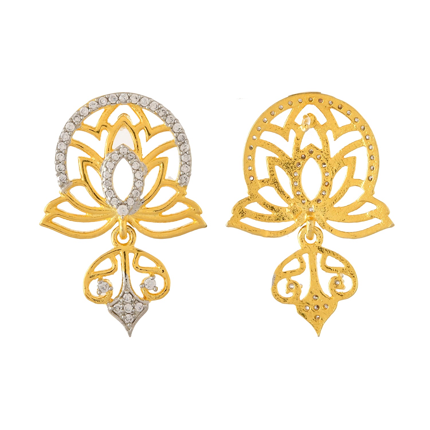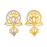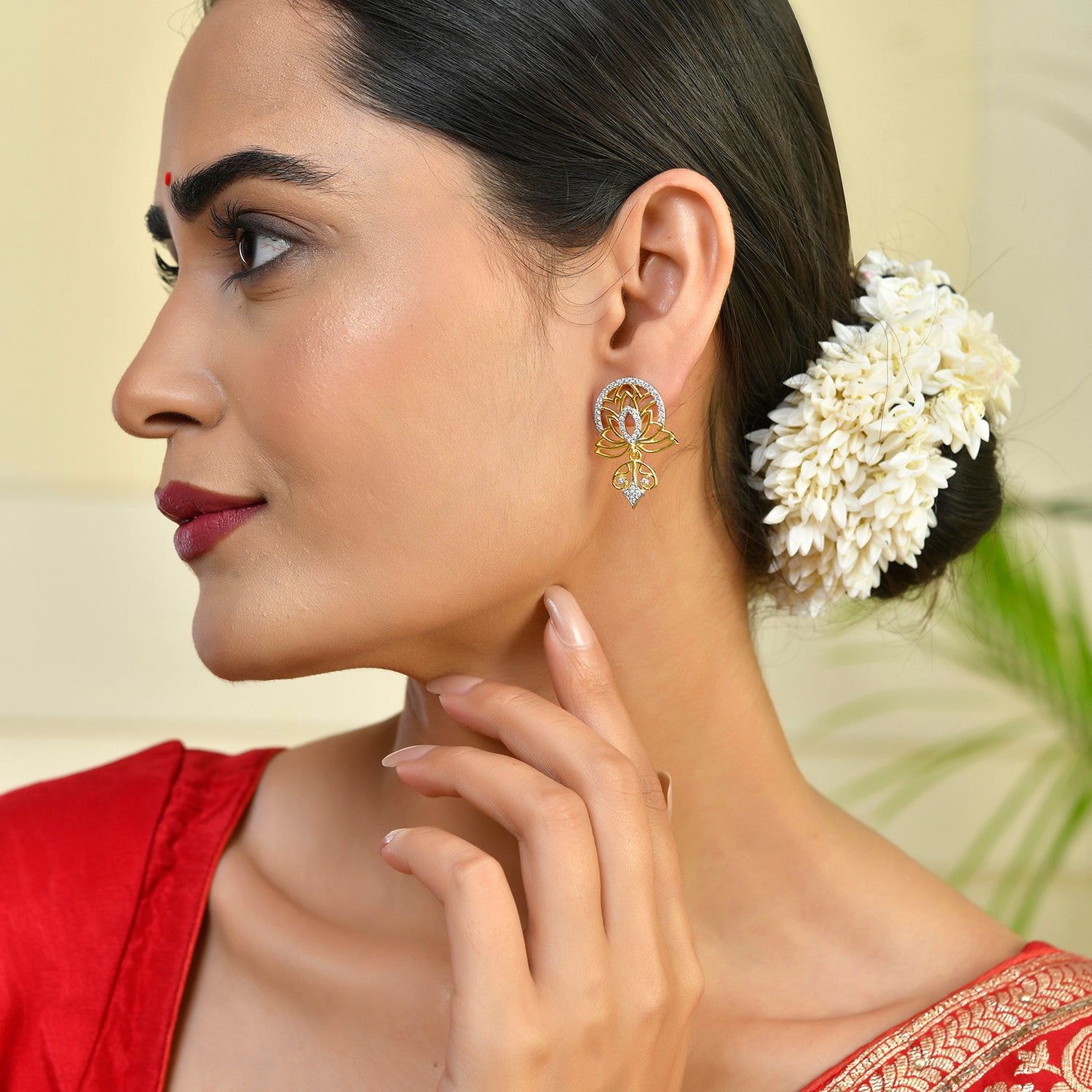 Elevate your style with the Alpana Divine Lotus Drop Earrings, a masterpiece from Voylla's Alpana Collection. This exquisite pair of drop earrings features a delicate lotus motif, crafted with intricate detailing, and a dual-tone plating of gold and rhodium. The earrings are adorned with American diamonds (CZ) and a smaller, teardrop-shaped element, adding a touch of glamour. This stylish pair is perfect for women aged 20+ who appreciate authentic, yet contemporary style, making it an excellent gift for wives, mothers, friends, and loved ones on special occasions like Diwali, Puja, Rakhi, and Rakshabandhan.