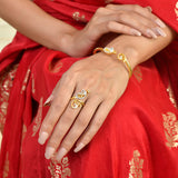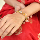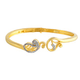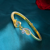 Elevate your style with the Alpana Paisley Open Hinge Bracelet, a masterpiece from Voylla's Alpana Collection. This exquisite women's bracelet features a stunning gold-plated design with intricate paisley patterns, adorned with sparkling American diamonds (CZ) that add a luxurious dual-tone effect with gold and rhodium plating. The bangle has an open hinge design, making it adjustable and comfortable for various wrist sizes. This stylish bracelet is perfect for women aged 20+ who appreciate authentic, yet contemporary style, making it an excellent gift for wives, mothers, friends, and loved ones on special occasions like Diwali, Puja, Rakhi, and Rakshabandhan.
