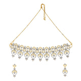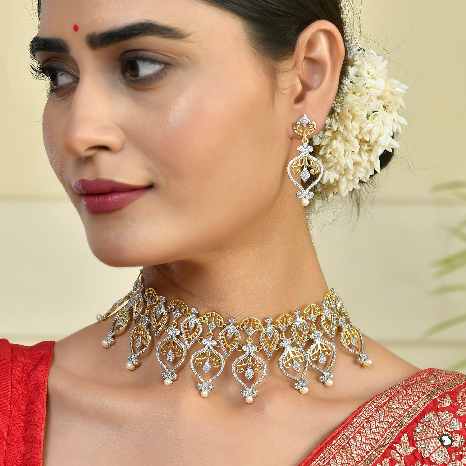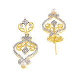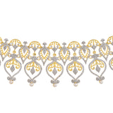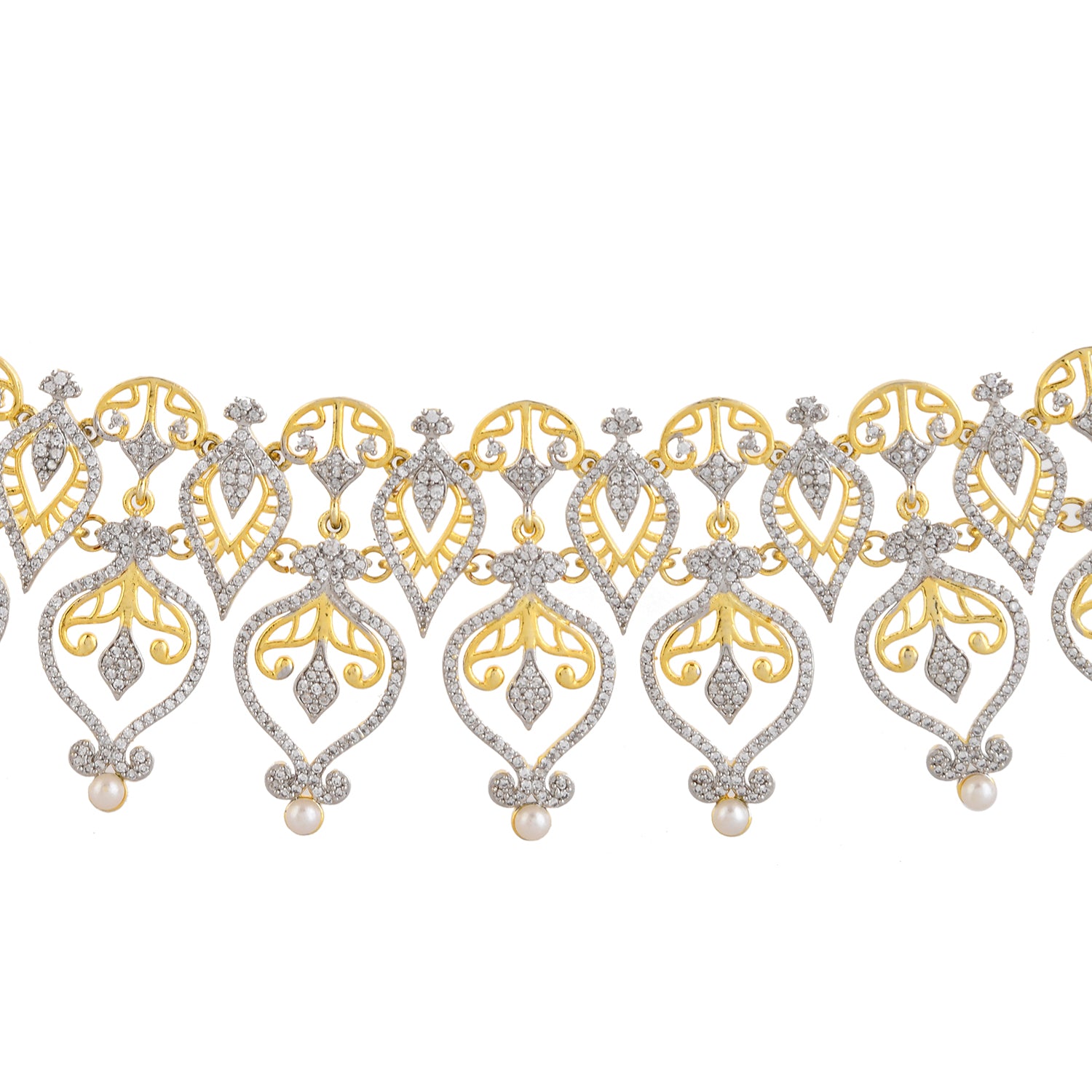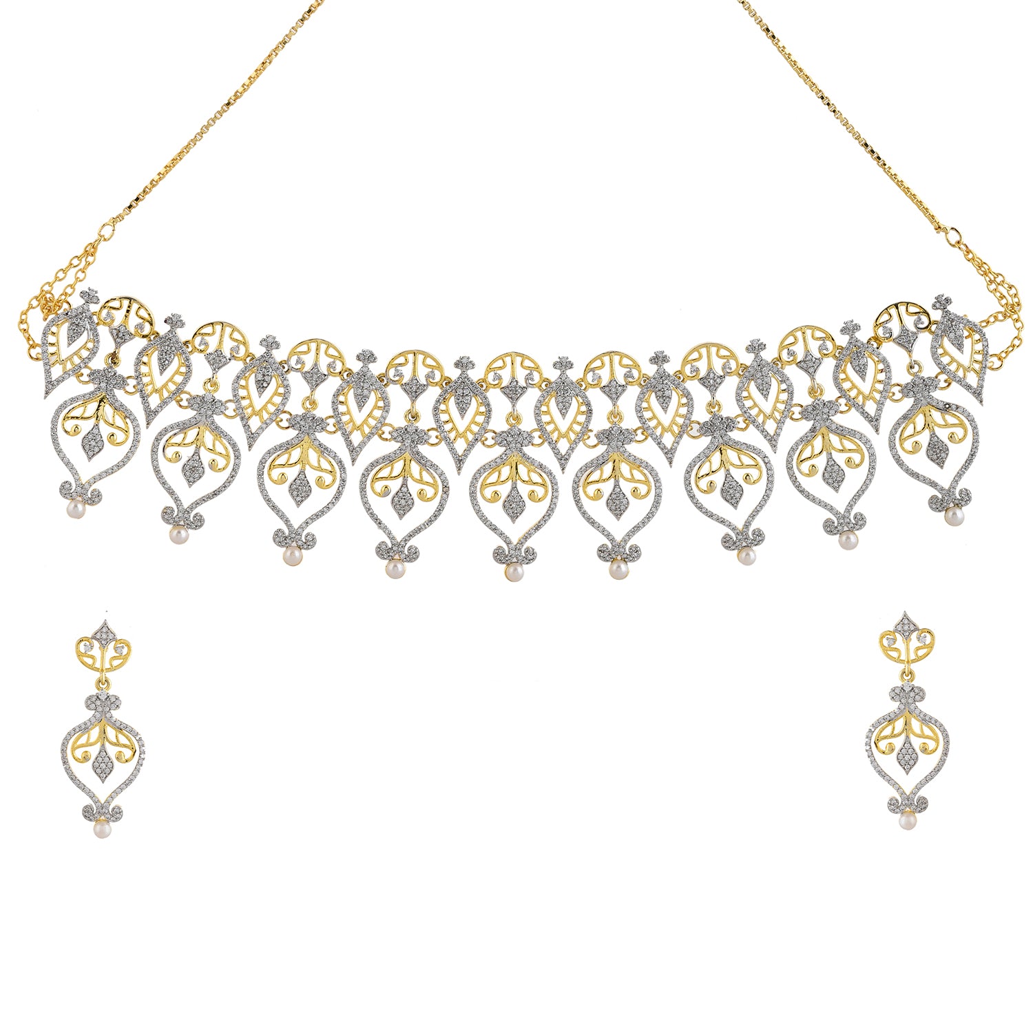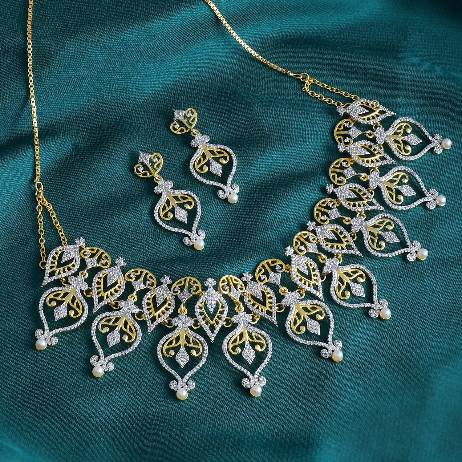Elevate your style with the Alpana Regal Paisley Petals Necklace Set, a masterpiece from Voylla's Alpana Collection. This exquisite women's necklace set is a testament to the fusion of traditional artistry and modern elegance, making it a perfect accessory for any occasion. The necklace set features an intricate design inspired by traditional Bengali Alpana art, with elaborate paisley and floral motifs forming a cascading pattern. The central piece consists of multiple tear-drop shaped elements with intricate filigree work, while the side pieces gradually diminish in size towards the chain. The earrings match the necklace with a single large paisley motif, featuring filigree work, CZ studding, and a pearl drop at the bottom.The jewelry set features a dual-tone plating, with a gold tone visible in the filigree work and outer borders, and a rhodium (silver-toned) finish present in the CZ-studded areas, creating a brilliant contrast. The set is adorned with small, clear stones, likely cubic zirconia (CZ) or American diamonds, set throughout the design. Tiny pearl-like beads are incorporated into the design, both in the necklace chain and as accents on the pendants.This Alpana Regal Paisley Petals Necklace Set is a versatile piece that can be worn on various occasions, from festive gatherings to casual traditional looks. Its intricate design and the combination of gold, sparkling stones, and pearls make it a perfect accessory for women seeking a statement piece that bridges tradition and modernity. This necklace set is perfect for women aged 20+ who appreciate authentic, yet contemporary style. It makes an excellent gift for wives, mothers, friends, and loved ones on special occasions like Diwali, Puja, Rakhi, and Rakshabandhan.