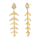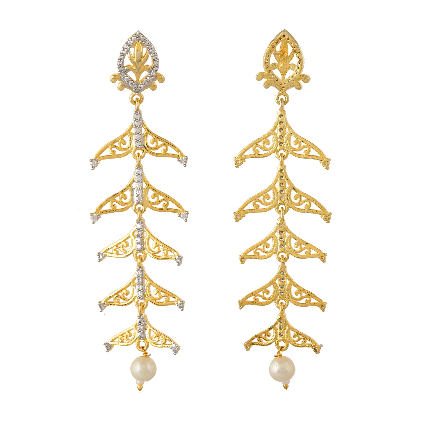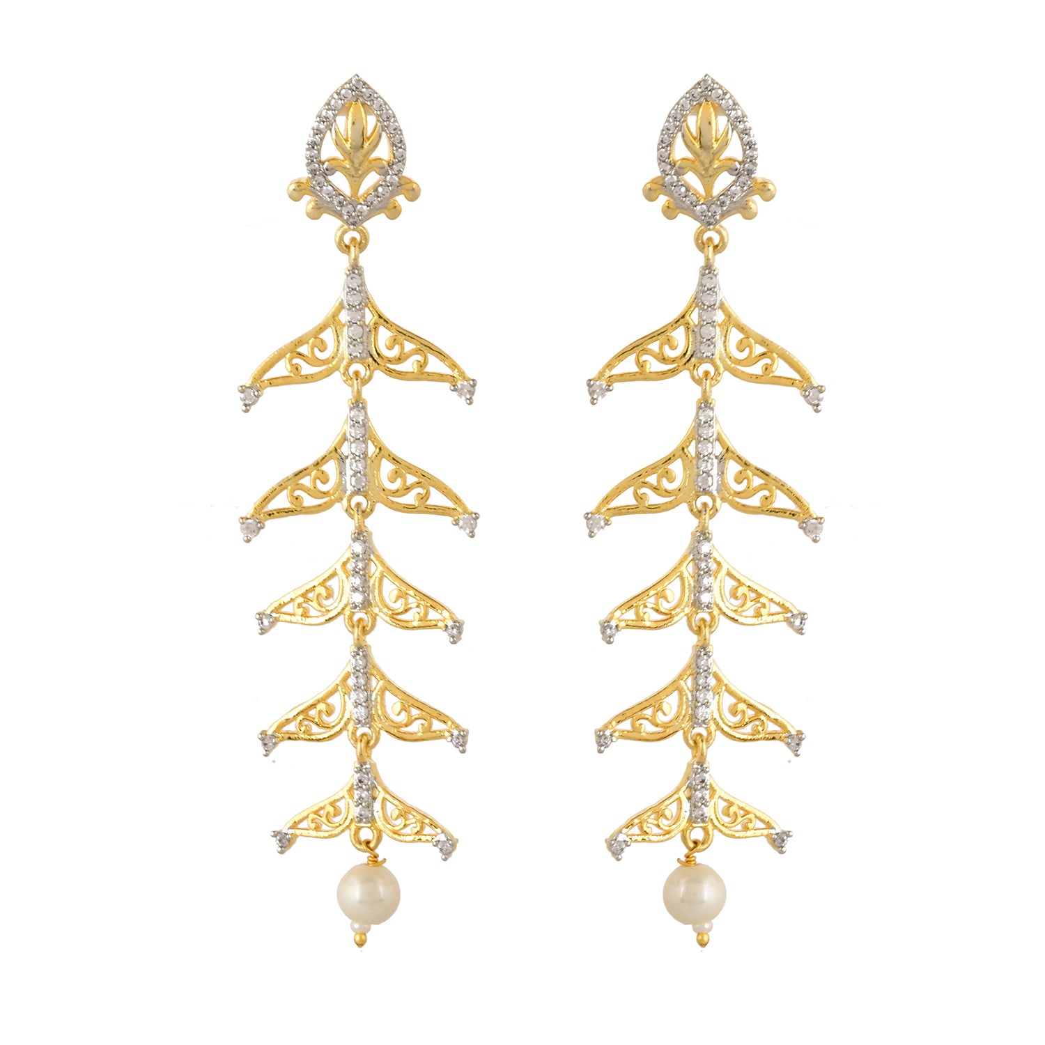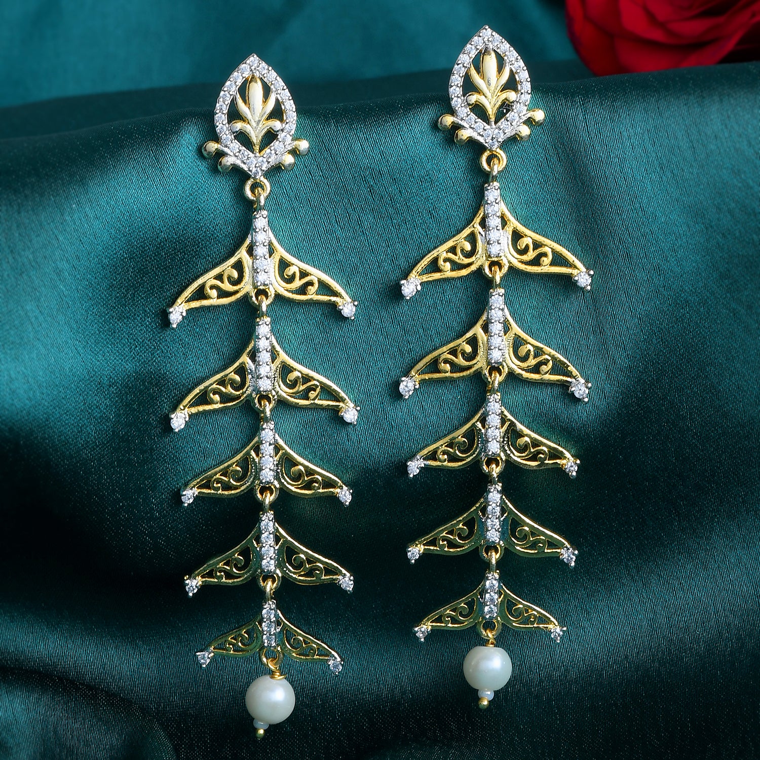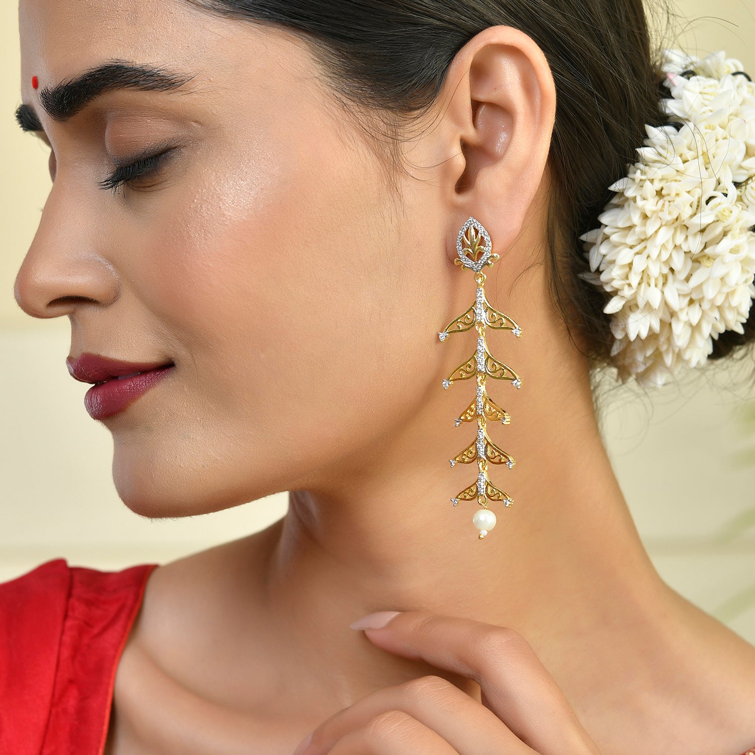 Elevate your style with the Alpana Regal Sheen Dangler Earrings, a masterpiece from Voylla's Alpana Collection. This exquisite pair of dangler earrings features an intricate tree-like structure, reminiscent of traditional Alpana art, crafted with a dual-tone plating of gold and rhodium. The earrings are adorned with American diamonds (CZ) and a single, lustrous pearl at the bottom, adding a touch of elegance. This stylish pair is perfect for women aged 20+ who appreciate authentic, yet contemporary style, making it an excellent gift for wives, mothers, friends, and loved ones on special occasions like Diwali, Puja, Rakhi, and Rakshabandhan.