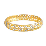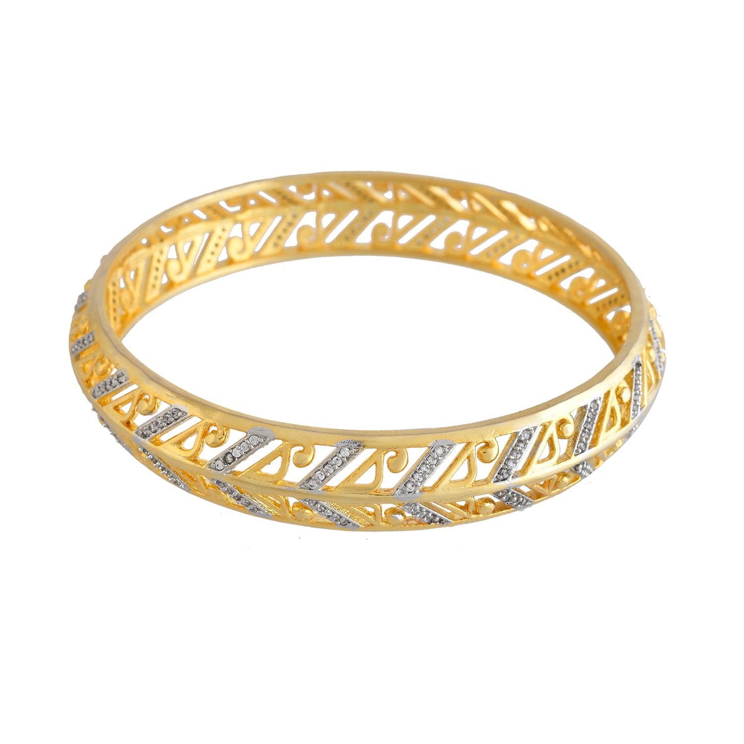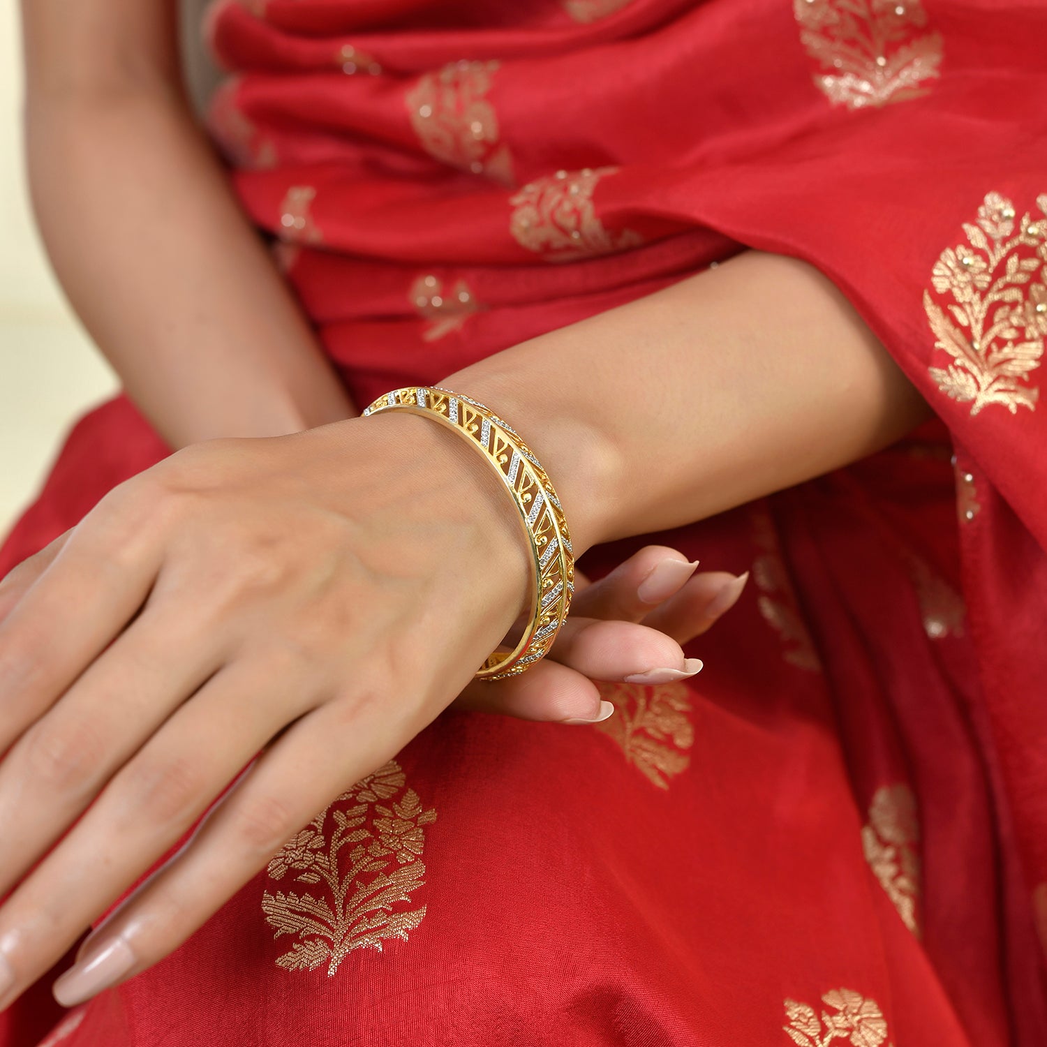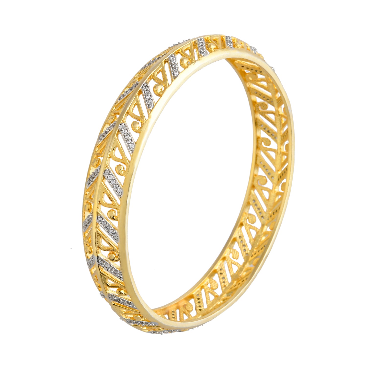 Elevate your style with the Alpana Timeless Elegance Bangle, a masterpiece from Voylla's Alpana Collection. This exquisite women's bangle features a stunning dual-tone design, combining gold and rhodium plating, with an intricate filigree pattern reminiscent of traditional Alpana art, featuring delicate geometric shapes and floral motifs. The bangle is adorned with American diamonds (CZ) that add a sparkling, contrasting element to the gold background, making it a perfect accessory for women aged 20+ who appreciate authentic, yet contemporary style. This stylish bangle is ideal for weddings, festivals, and other special occasions, and makes an excellent gift for wives, mothers, friends, and loved ones on special occasions like Diwali, Puja, Rakhi, and Rakshabandhan.