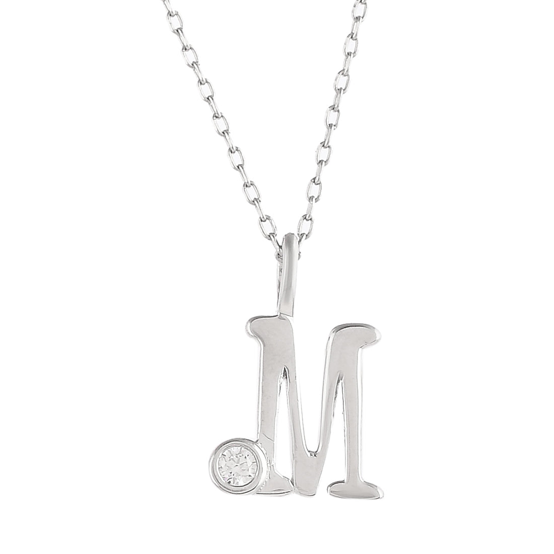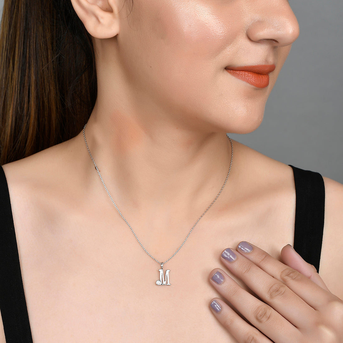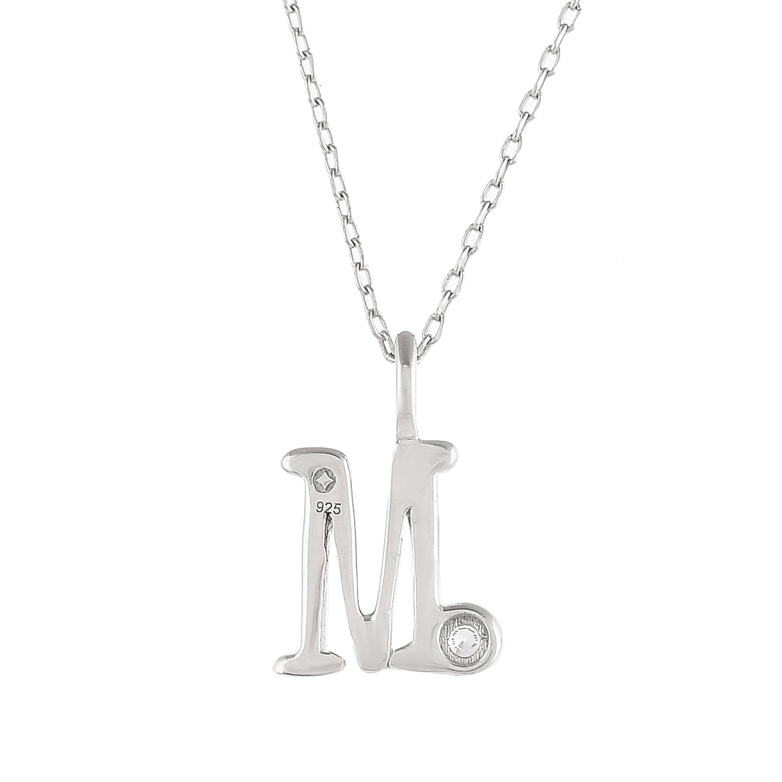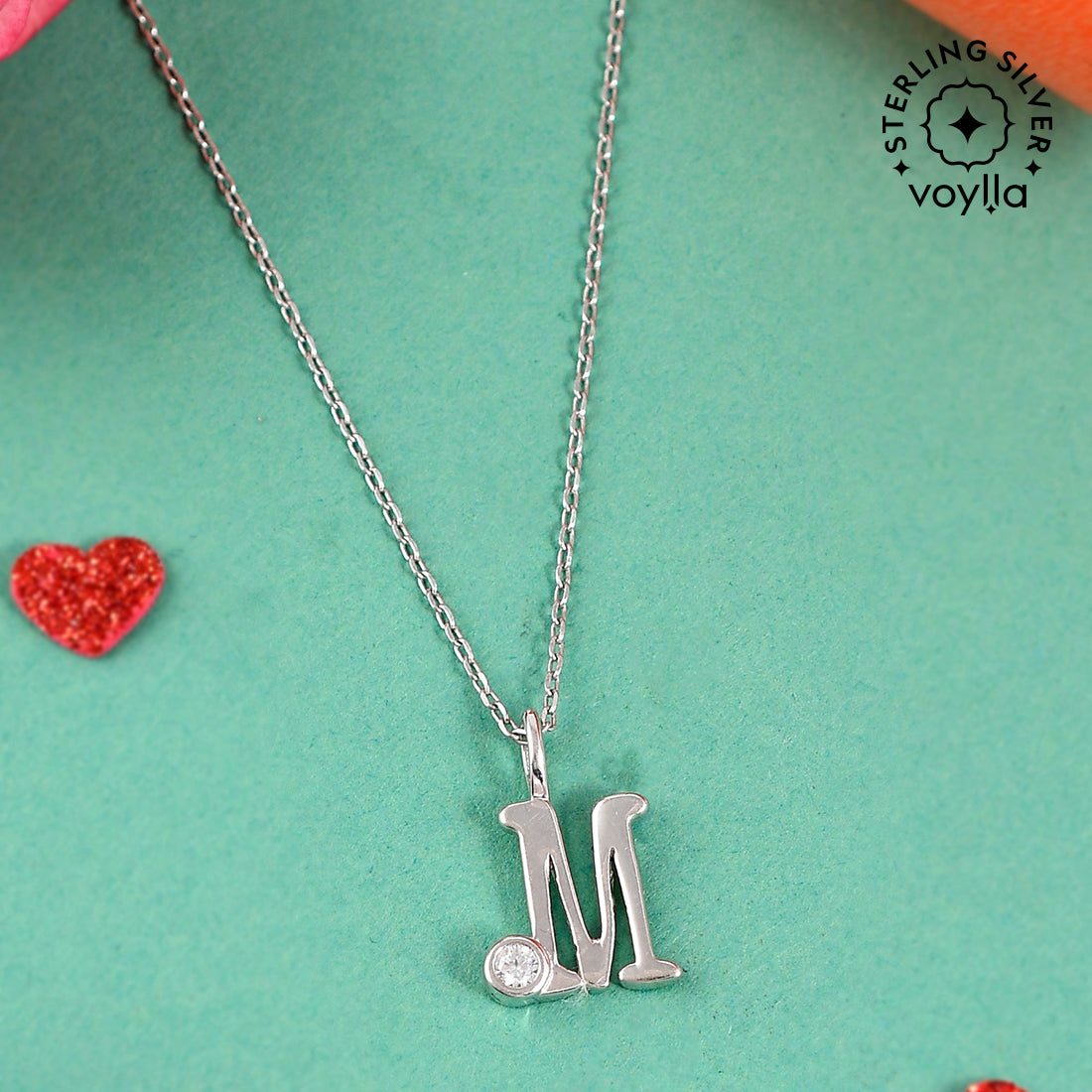 Minimalistic Alphabet M pendant with silver chains,studded with cubic zircons.Crafted in 925 Silver with a High Polish Finish .