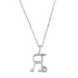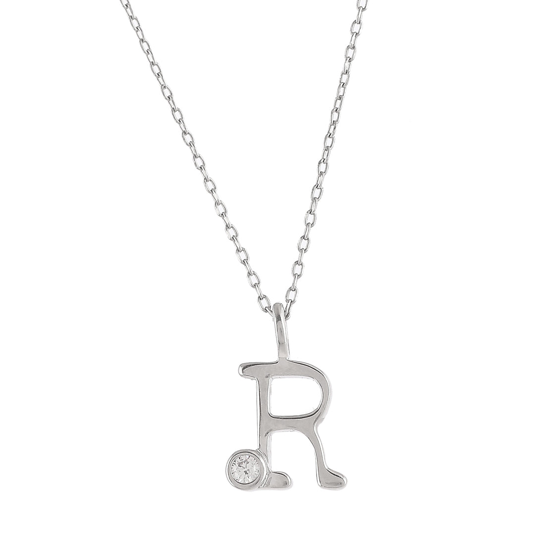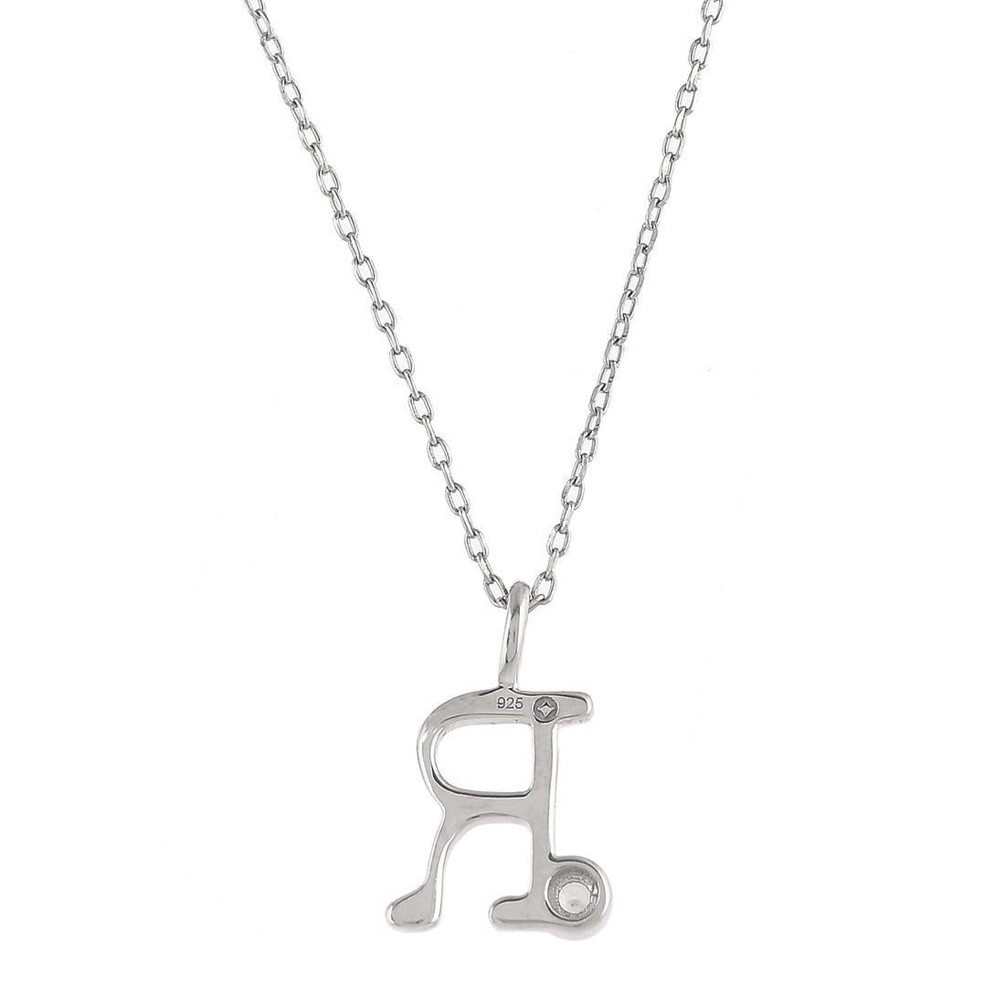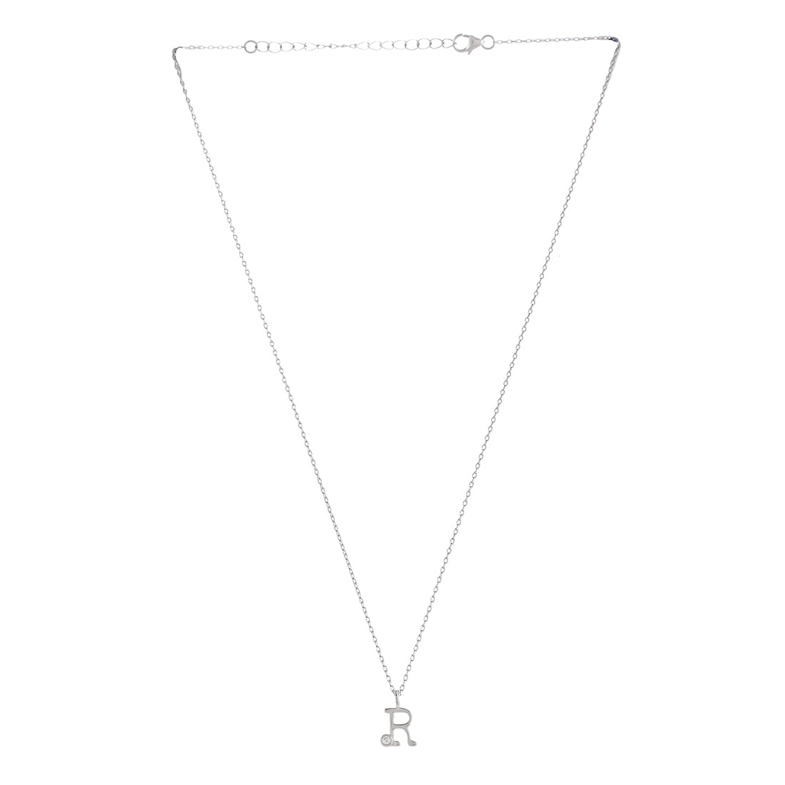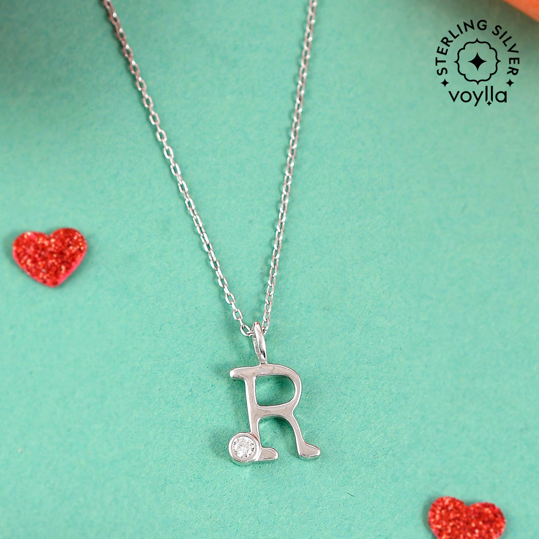 Minimalistic Alphabet R pendant with silver chains,studded with cubic zircons.Crafted in 925 Silver with a High Polish Finish .