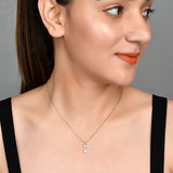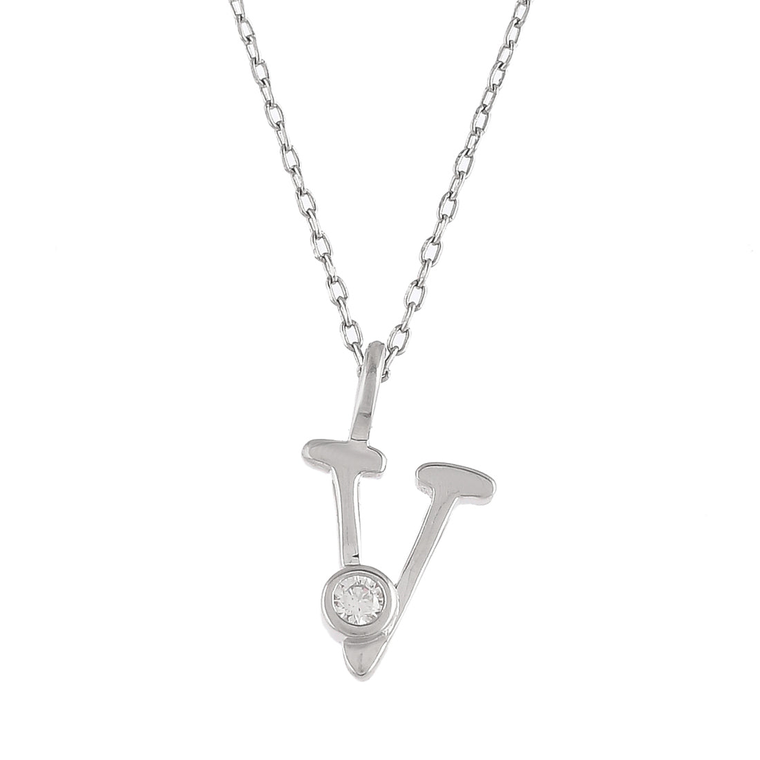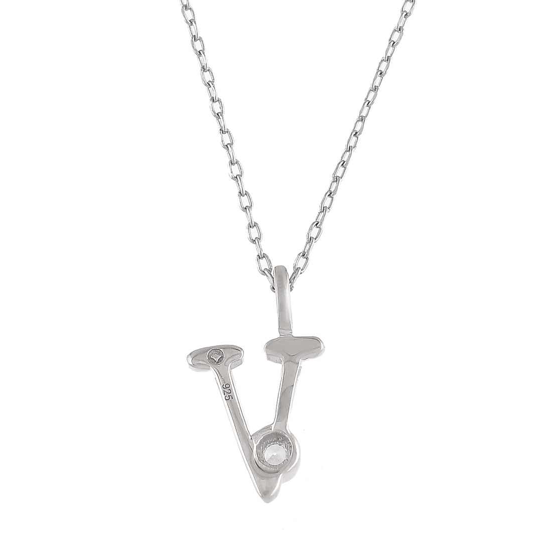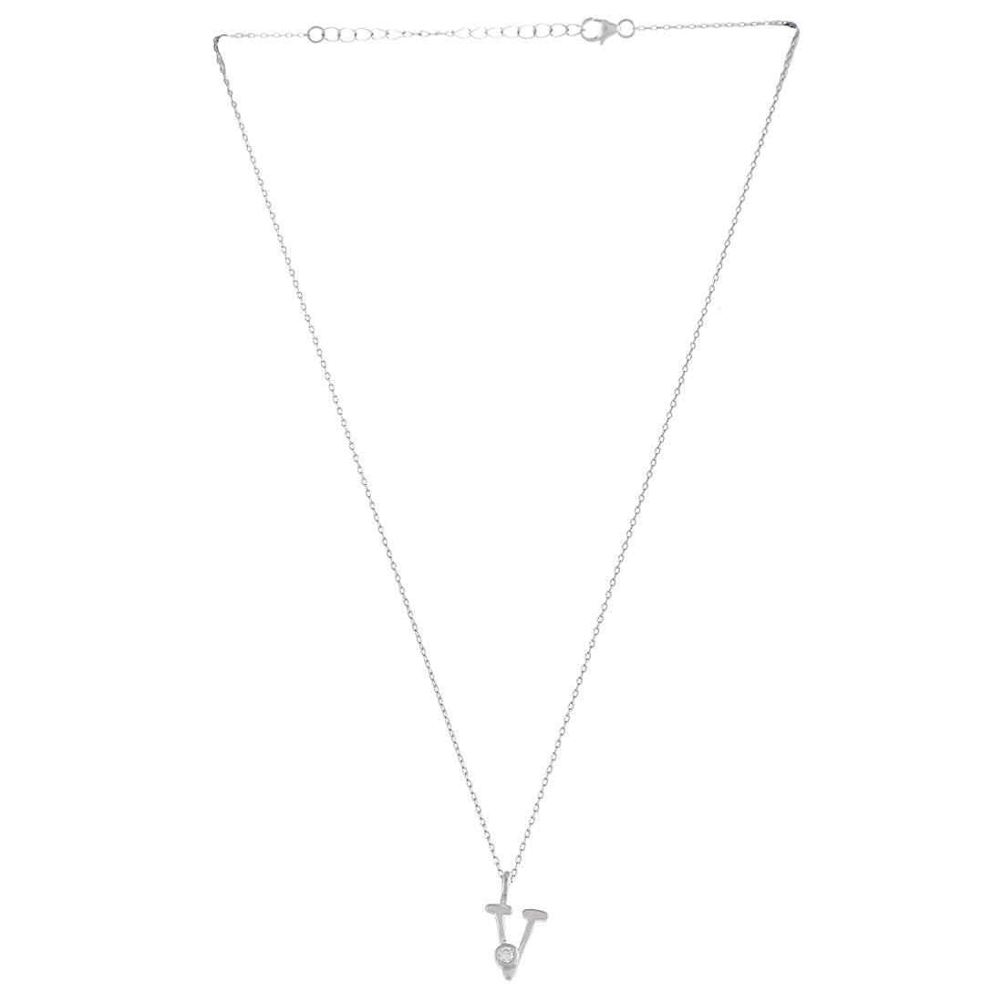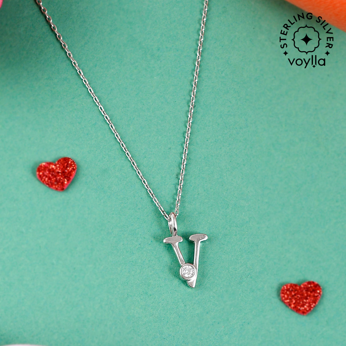 Minimalistic Alphabet V pendant with silver chains,studded with cubic zircons.Crafted in 925 Silver with a High Polish Finish .