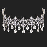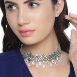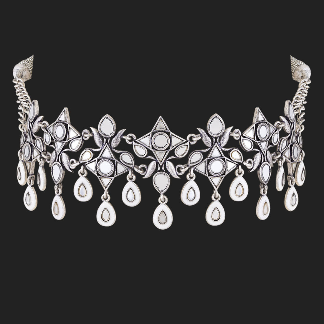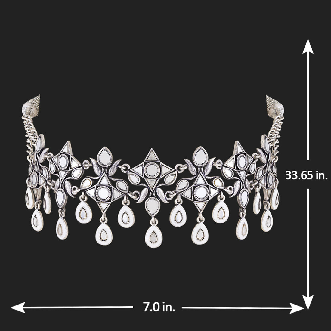 Choker style necklace inspired by the beauty of Sheesh Mahal and fashioned from brass into an antique design. Oxidized silver plated and embellished with mirror details. Pair with ethnic attire. This piece of jewelry comes with the Voylla assurance of quality and durability.