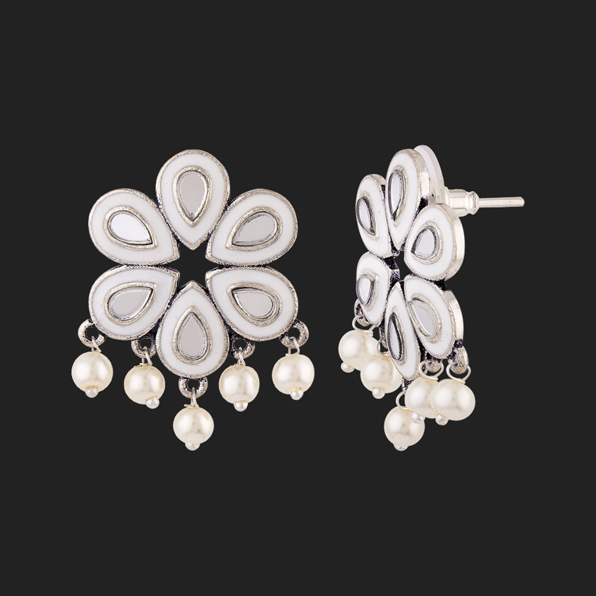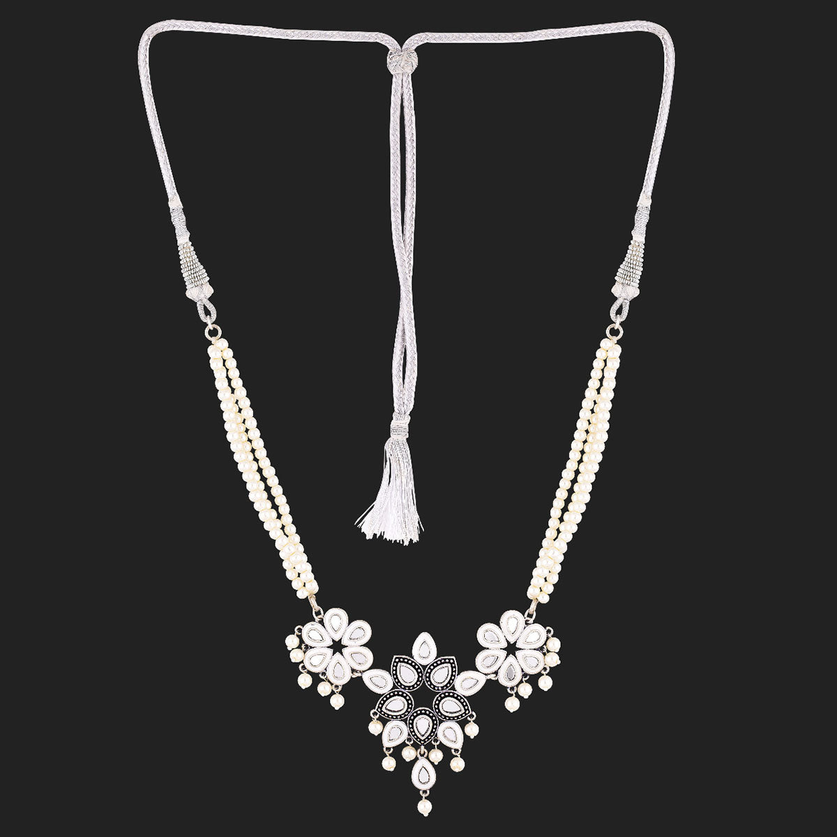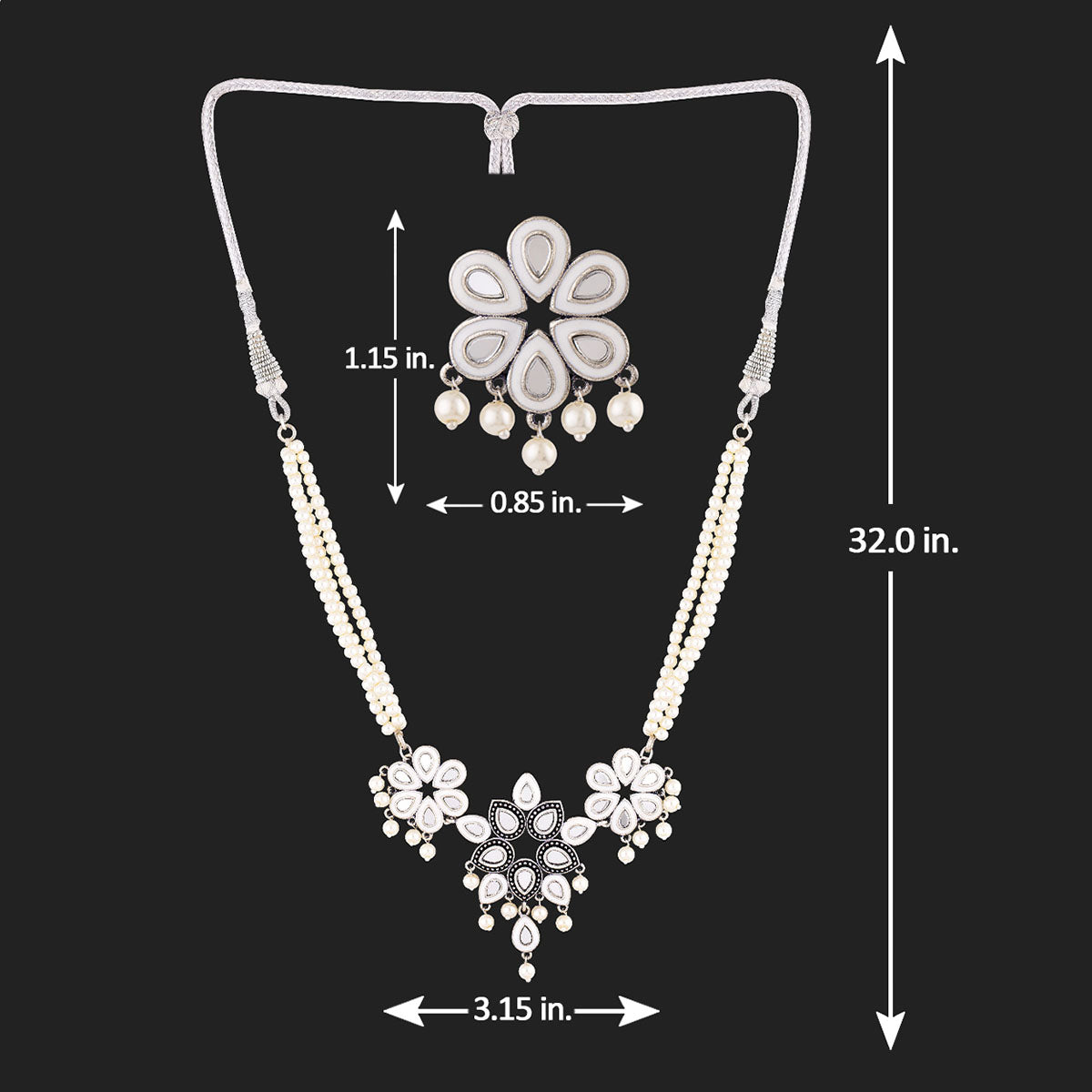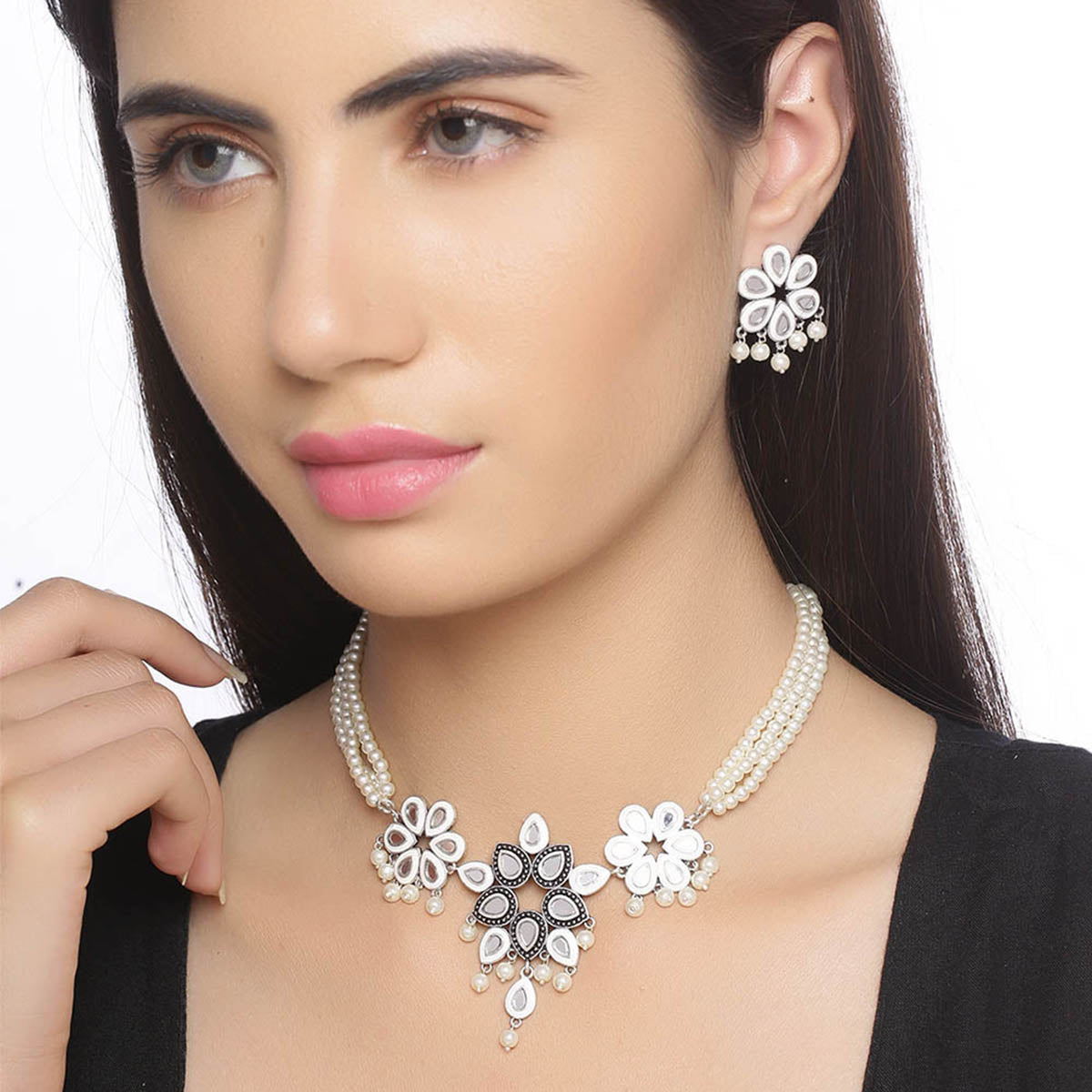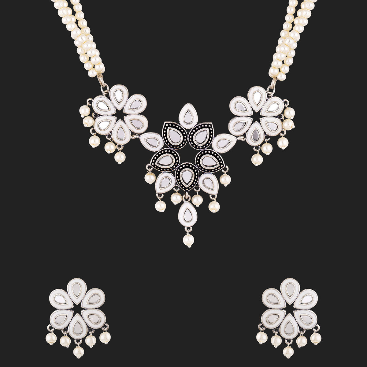 Inspired by the beauty and glitz of Sheesh Mahal, the necklace set has been fashioned out of brass and given an oxidized silver plating. Embellished with mirror details and faux pearls, the set will look splendid with a trendy saree. This piece of jewelry comes with the Voylla assurance of quality and durability. Caring for your fashion jewelry: We, at Voylla, take care of every piece of jewelry so that you don't spend hours caring for them.