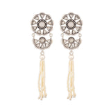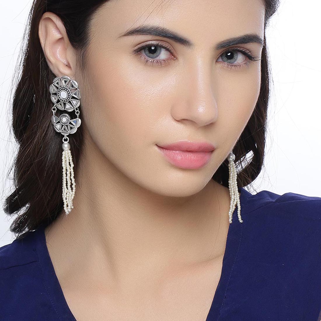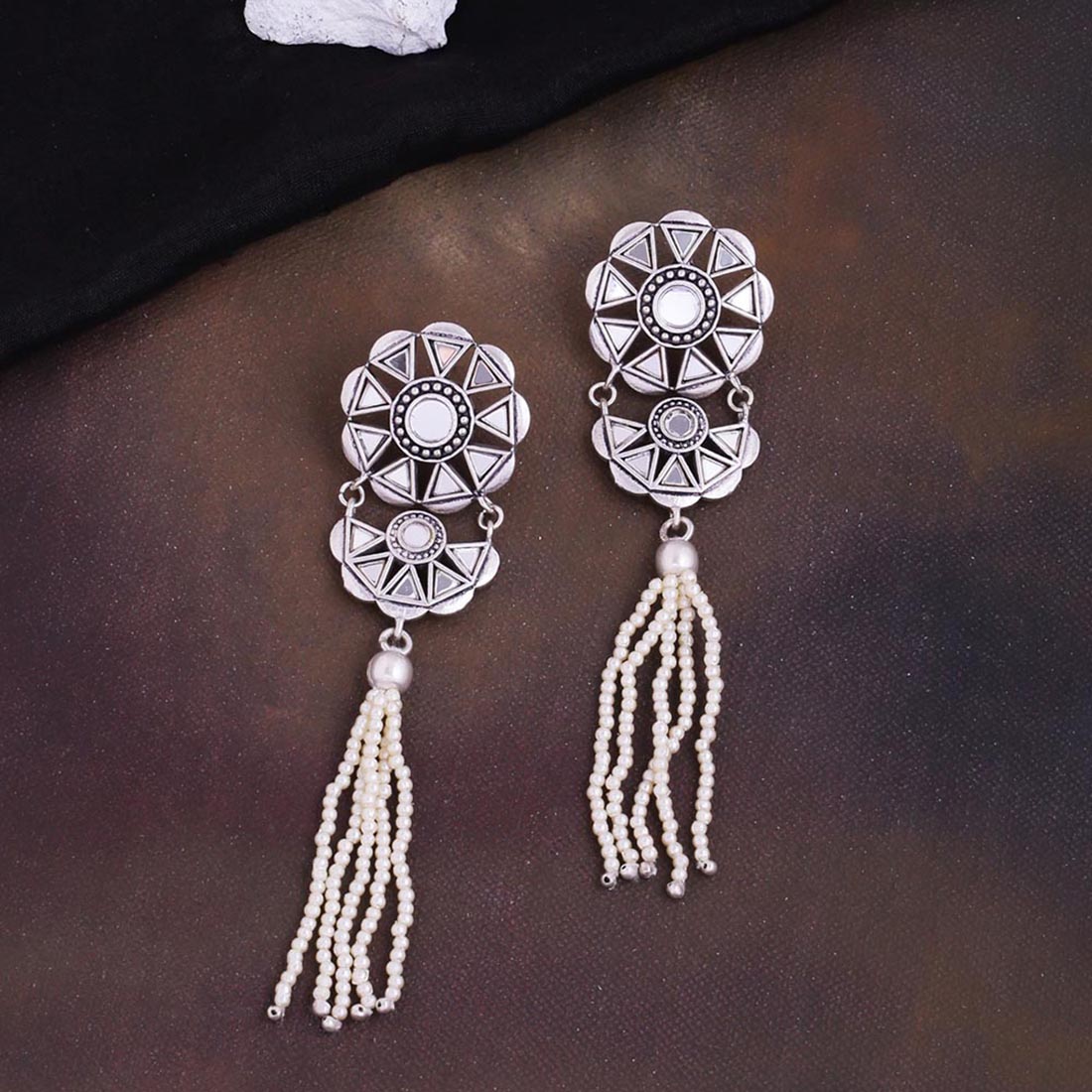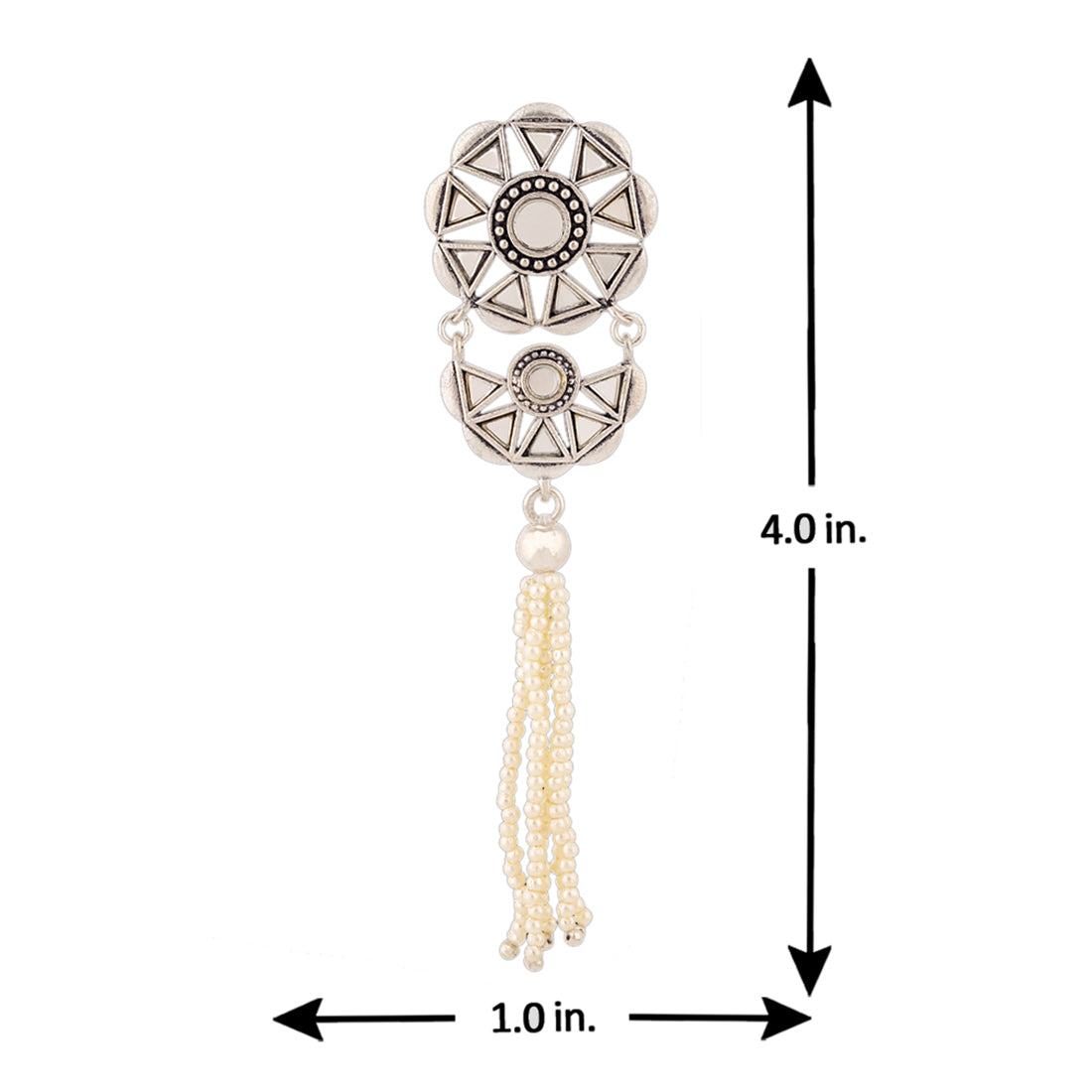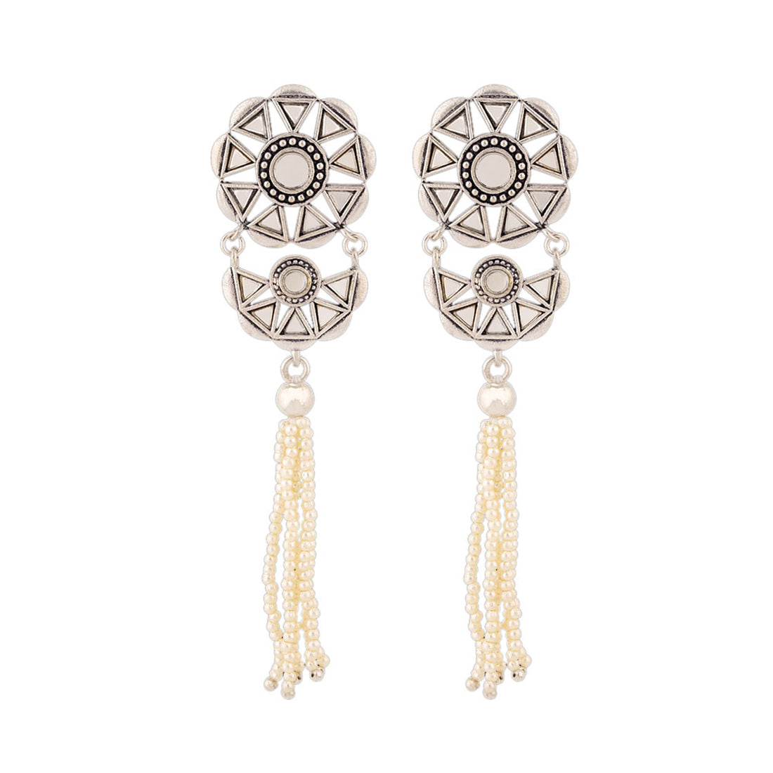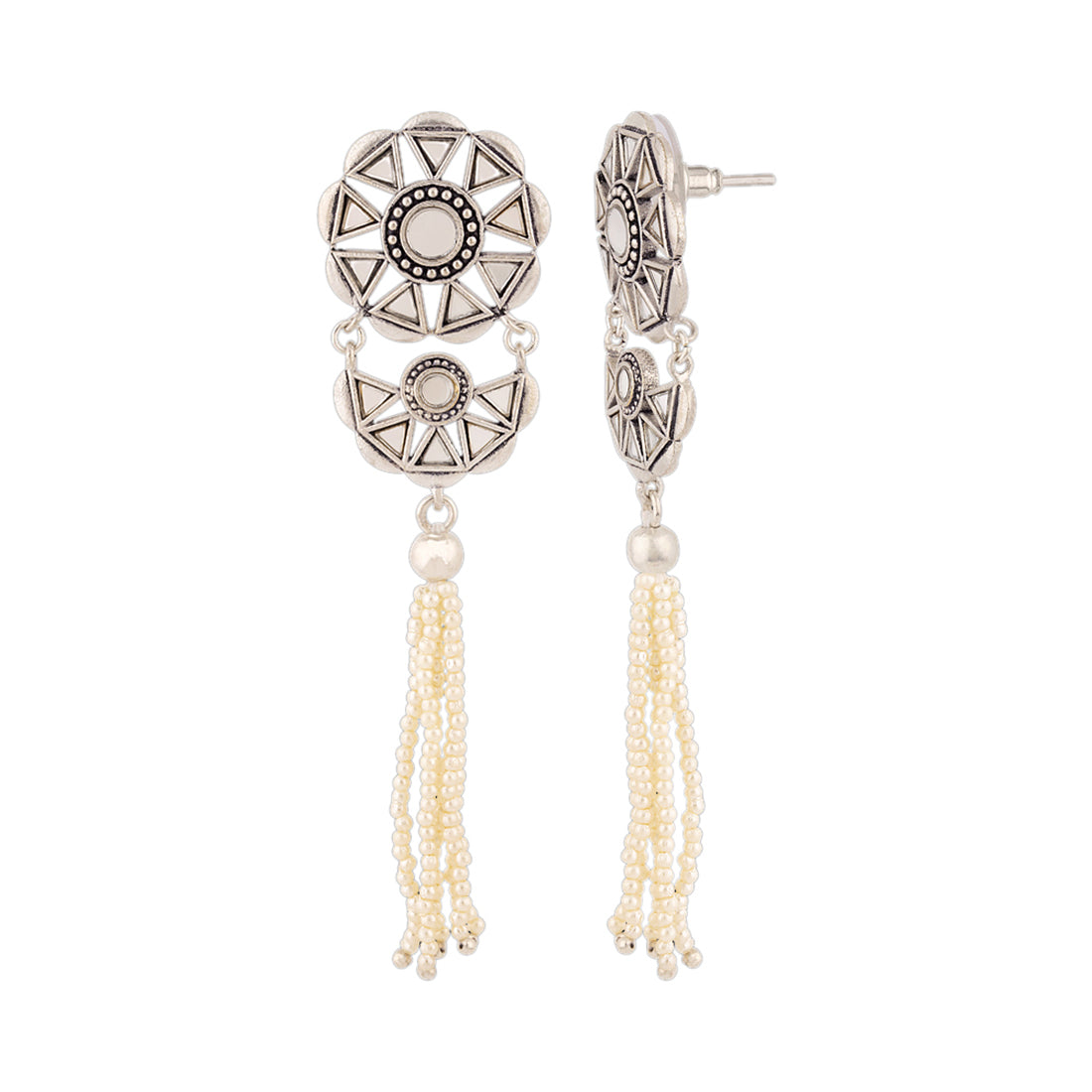 The beauty of Sheesh Mahal has inspired these faux pearls tassels drop earrings, which have been embellished with mirror details. Oxidized silver plated and good for formal and casual wear. This piece of jewelry comes with the Voylla assurance of quality and durability.