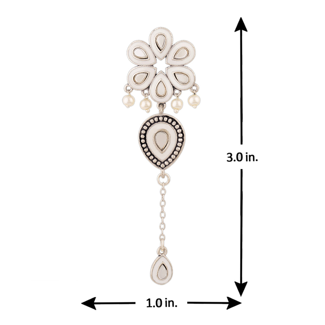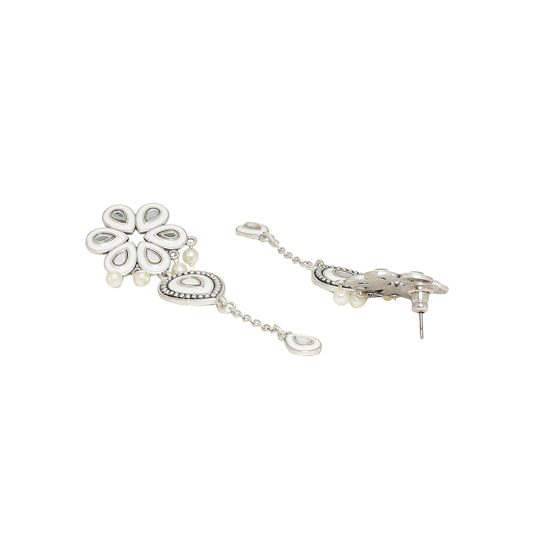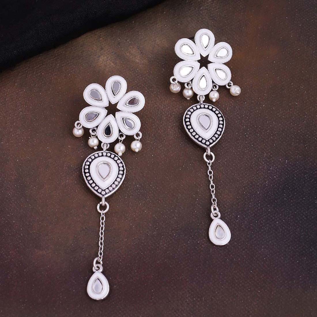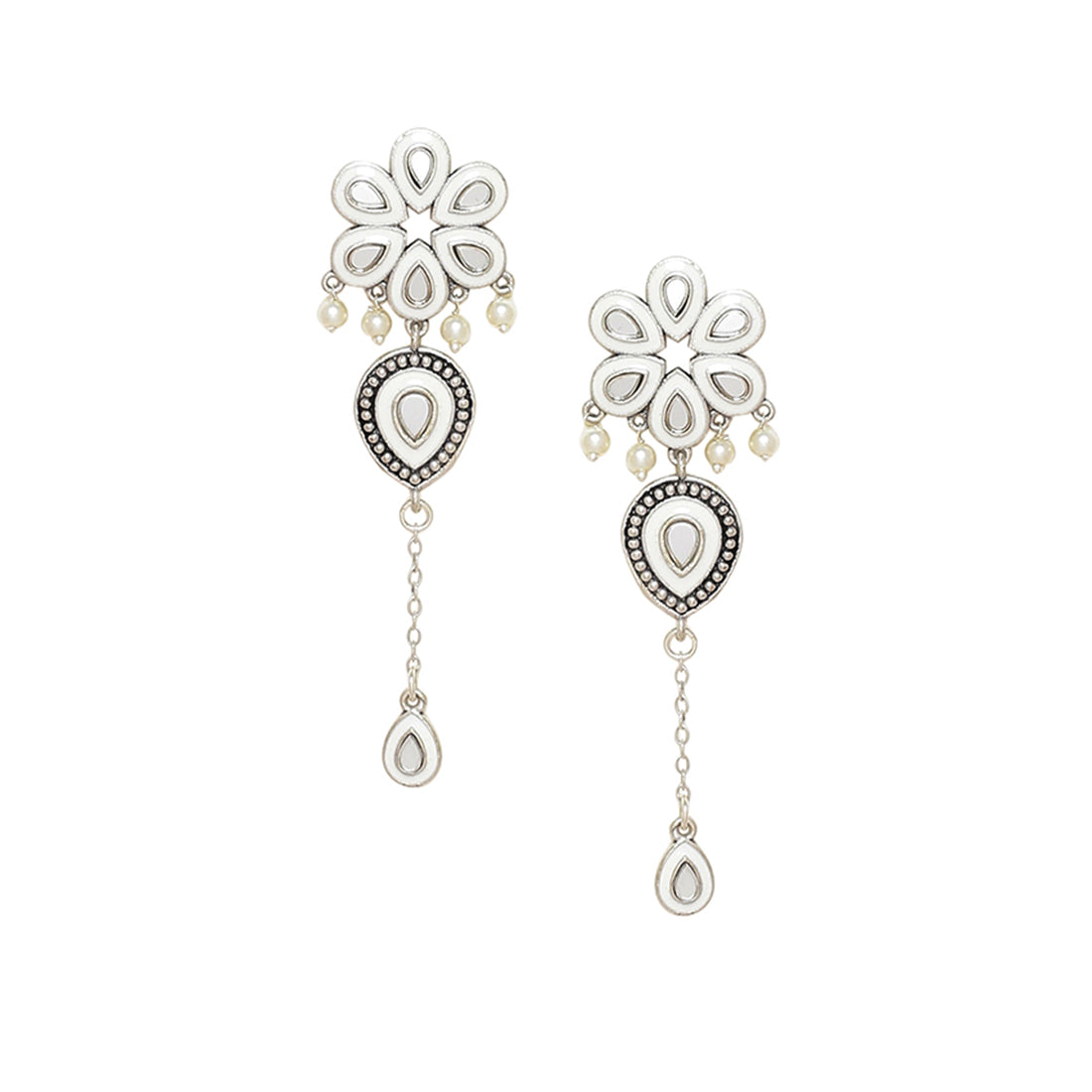 Inspired by the beauty of Sheesh Mahal, these floral drop earrings have been crafted from brass. Embellished with mirror details and oxidized silver plated. Pair with an ethnic summer dress. This piece of jewelry comes with the Voylla assurance of quality and durability.