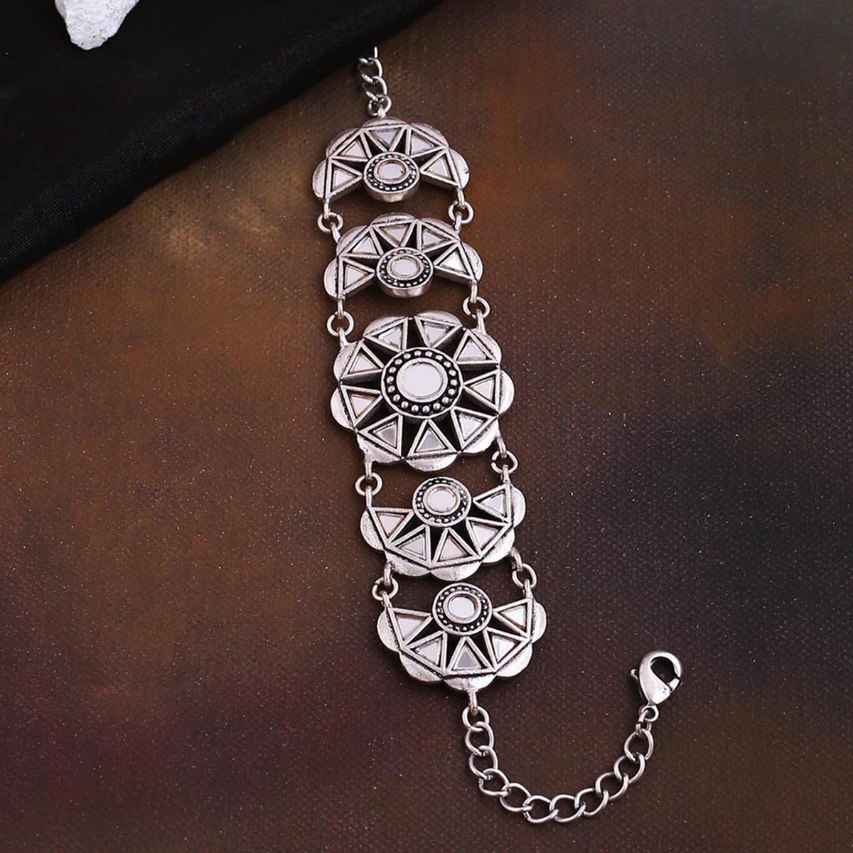 Flowers motifs choker bracelet made from brass and inspired by the beauty and grace of Sheesh Mahal. Oxidized silver plated and embellished with mirror details. Wear with a summer dress. This piece of jewelry comes with the Voylla assurance of quality and durability.