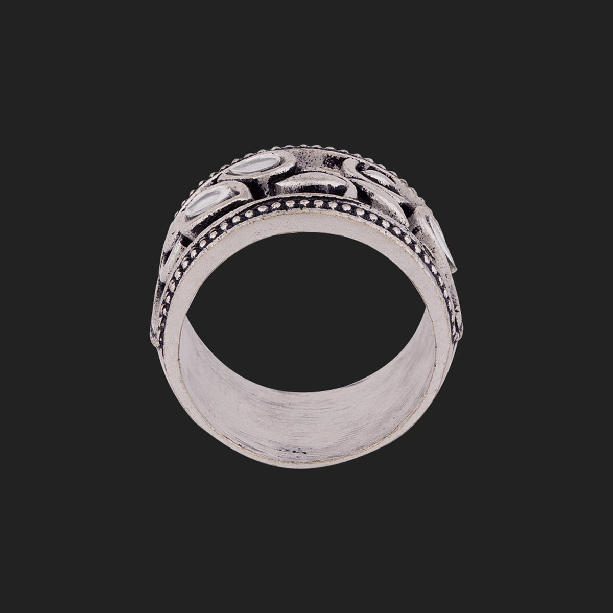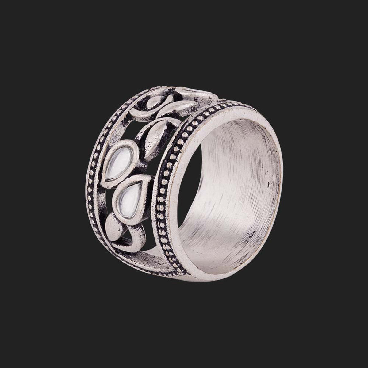 Inspired by the beauty and charm of Sheesh Mahal, the band ring has been adorned with leaves motifs. Made from brass and oxidized silver plated, the statement ring has been embellished with mirrors. A good match for Indo-Western and party looks.