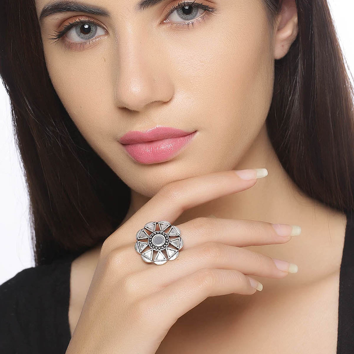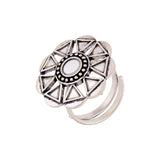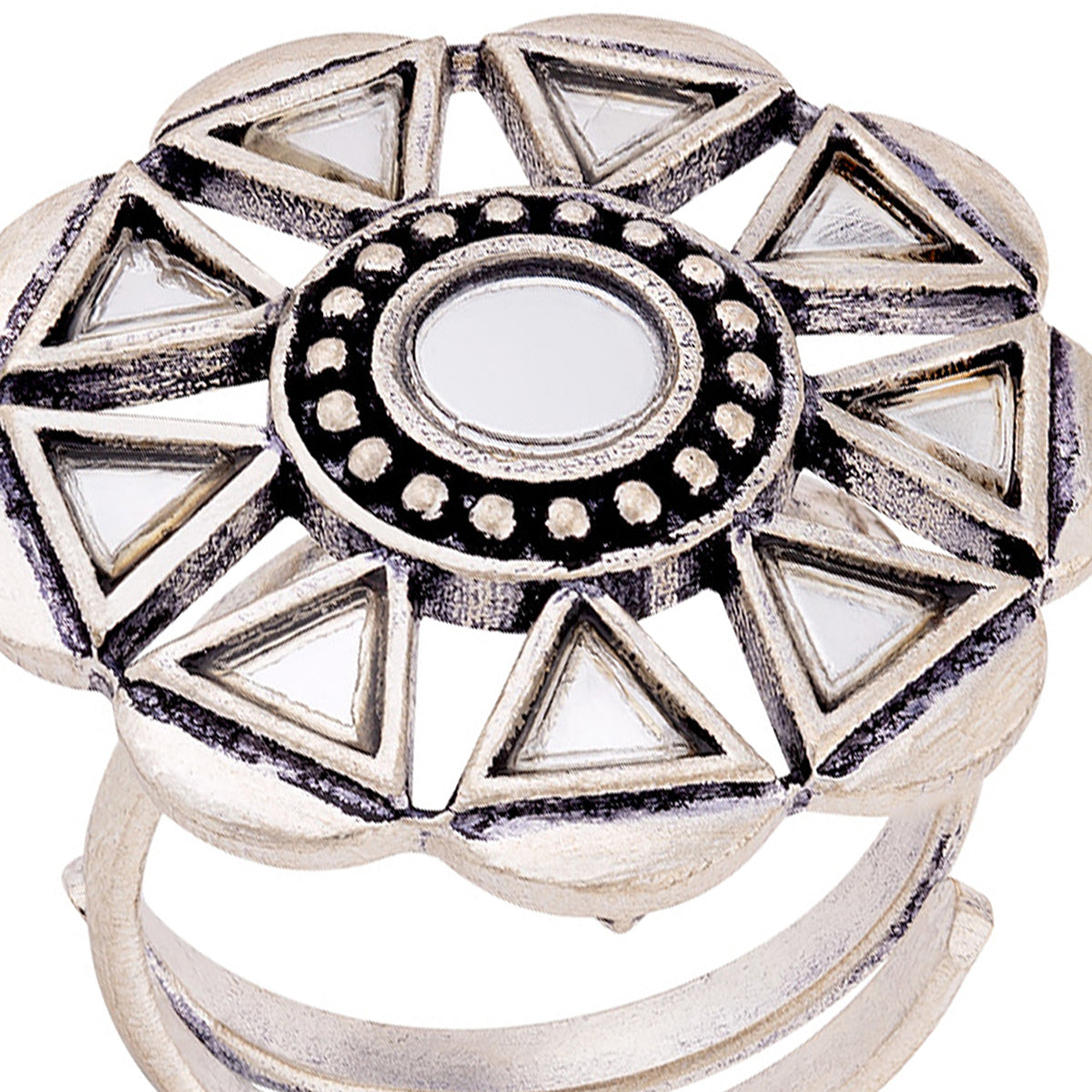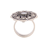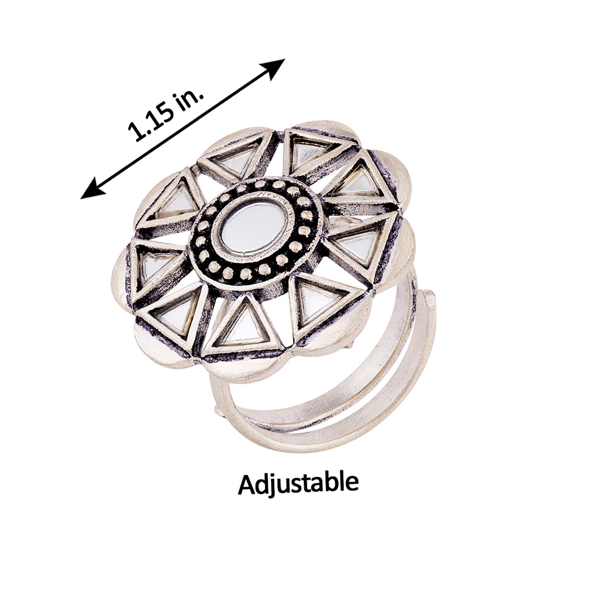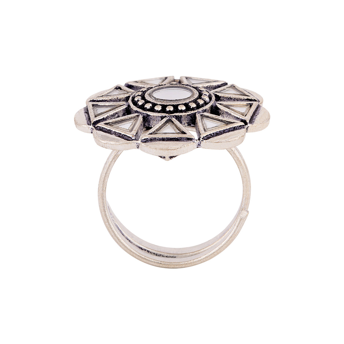Sheesh Mahal's grace, beauty and art have inspired this brass statement ring, which has been given an oxidized silver plating. Embellished with mirror details, the ring is a perfect match for Indo-Western looks. This piece of jewelry comes with the Voylla assurance of quality and durability.