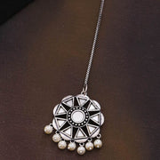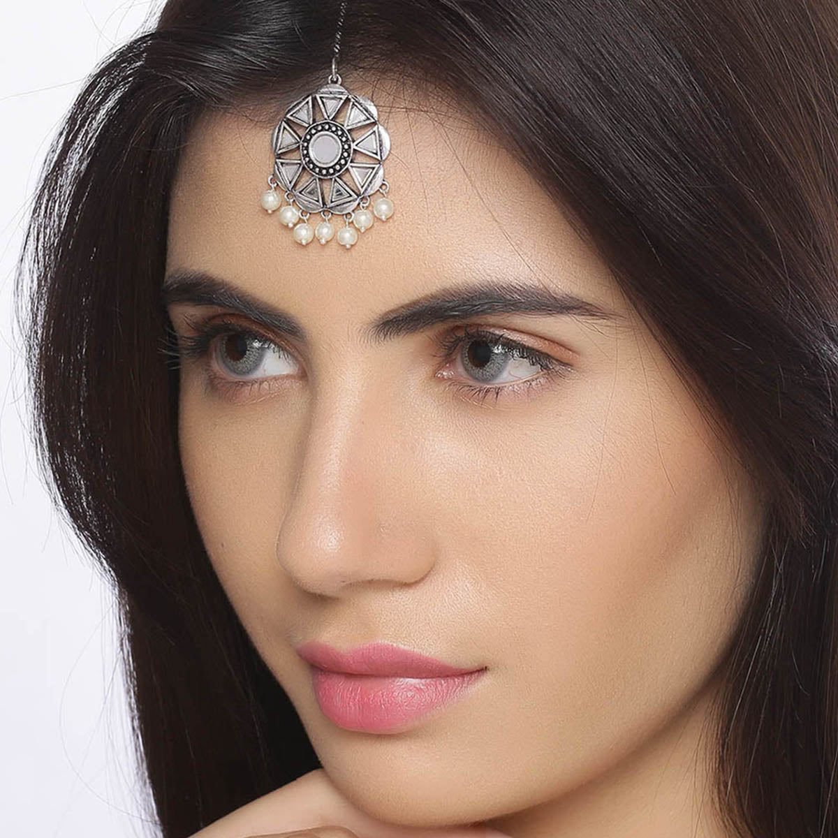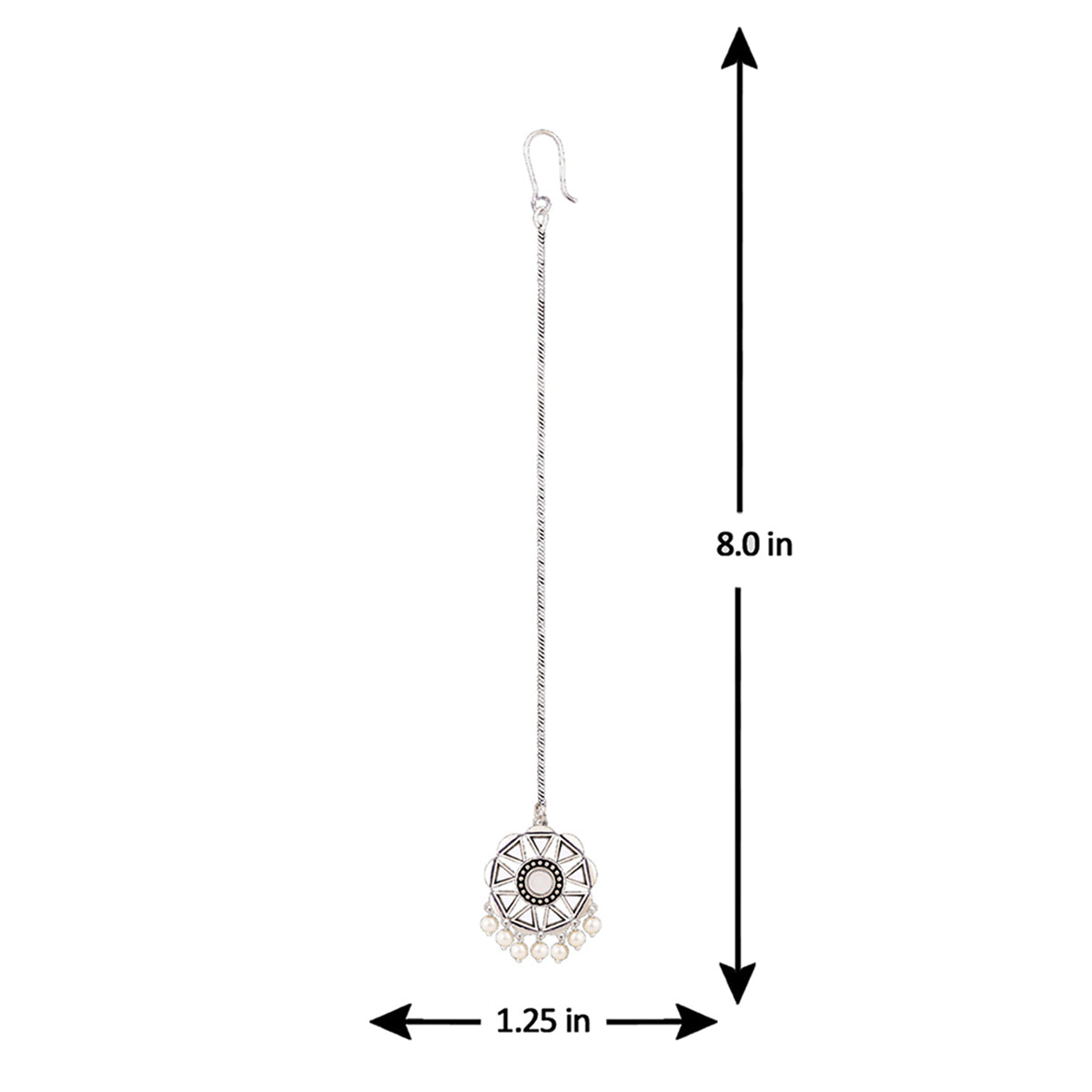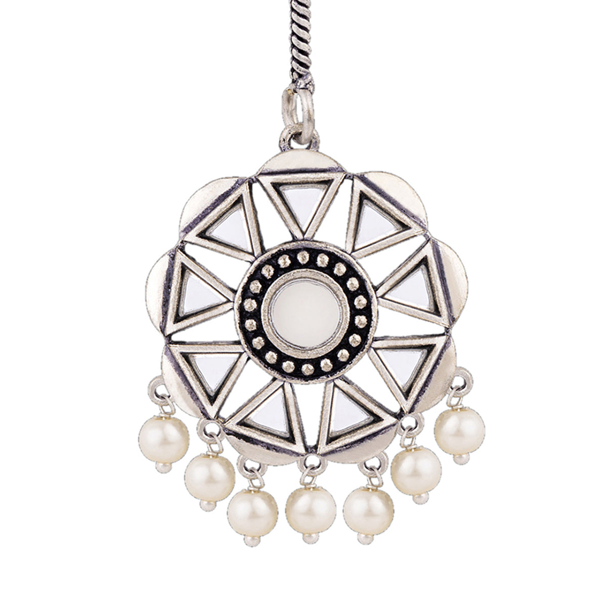 Brass spokes and wheels motifs maang tika with oxidized silver plating, inspired by the glitz and grace of Sheesh Mahal. Delicate mirror details and faux pearls have been used in the embellishments of this tika, which will look splendid with a trendy saree. This piece of jewelry comes with the Voylla assurance of quality and durability.