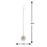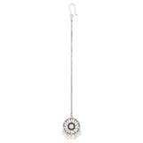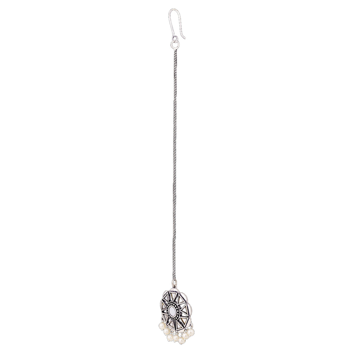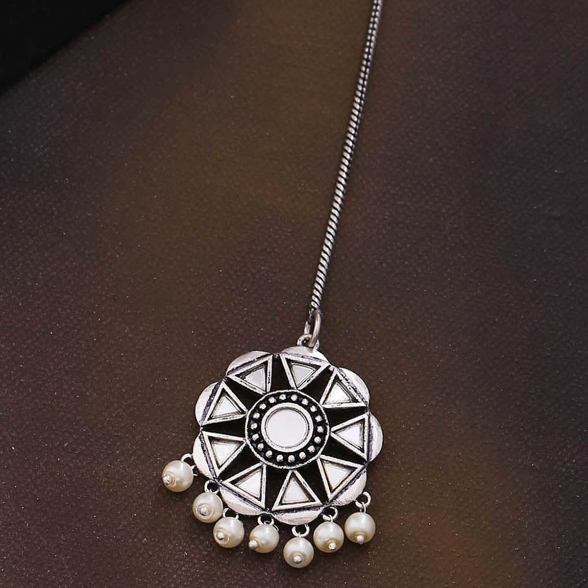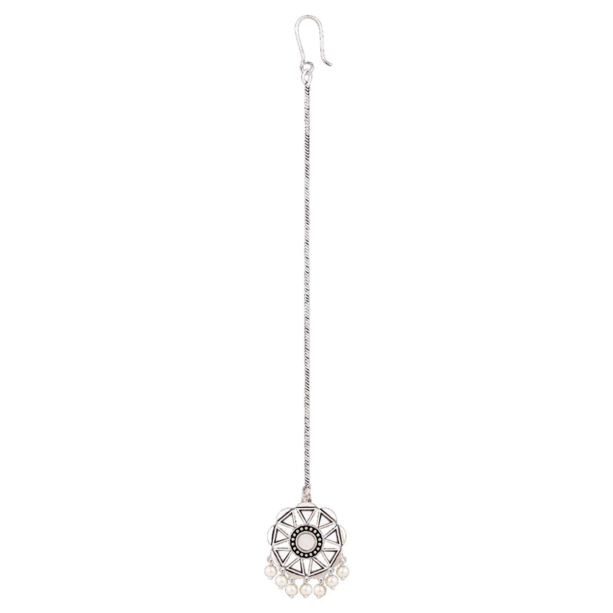 Brass spokes and wheels motifs maang tika with oxidized silver plating, inspired by the glitz and grace of Sheesh Mahal. Delicate mirror details and faux pearls have been used in the embellishments of this tika, which will look splendid with a trendy saree. This piece of jewelry comes with the Voylla assurance of quality and durability.