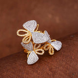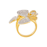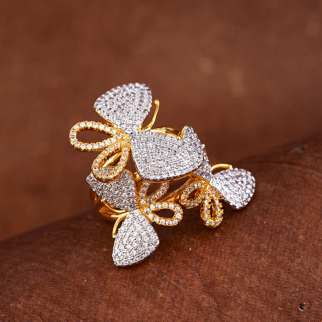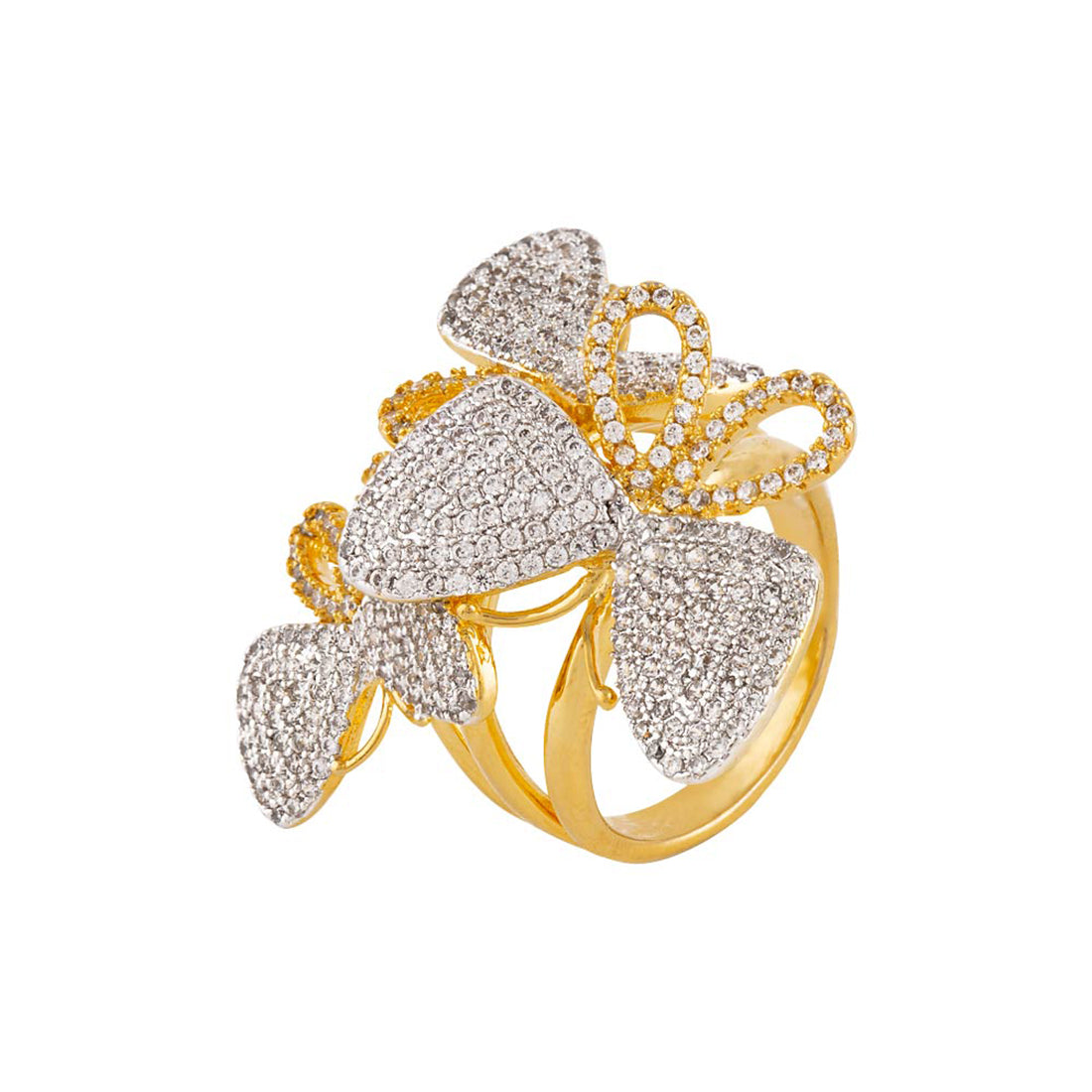 Butterfly motifs adorned ring with zircon gemstones. Brass has been used in the making of this two tone plated ring. Pair with a cocktail dress.