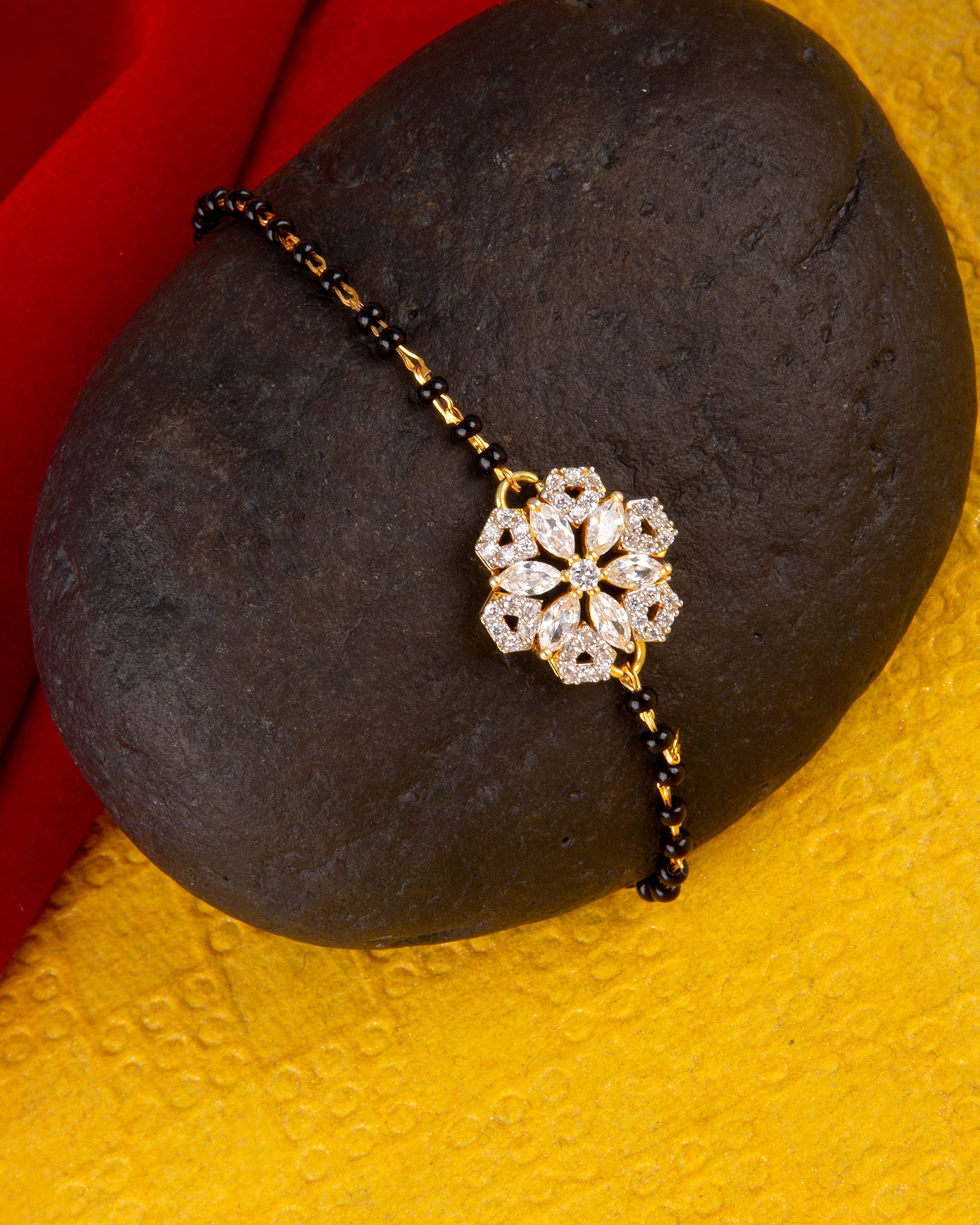 American Diamond CZ Golden Round Brass Black Beaded Mangalsutra Bracelet
