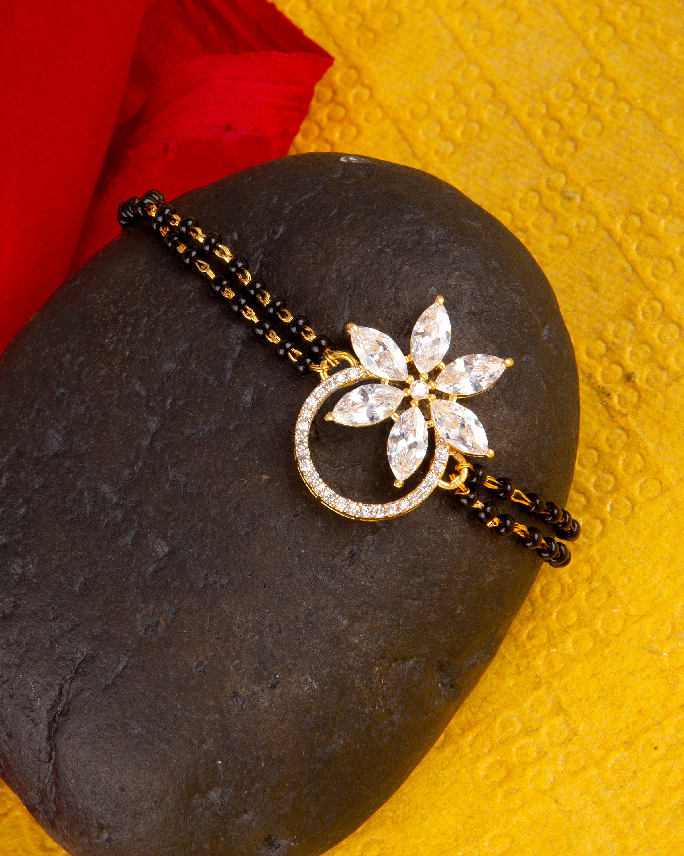 American Diamond CZ Golden Round Brass Black Beaded Mangalsutra Bracelet