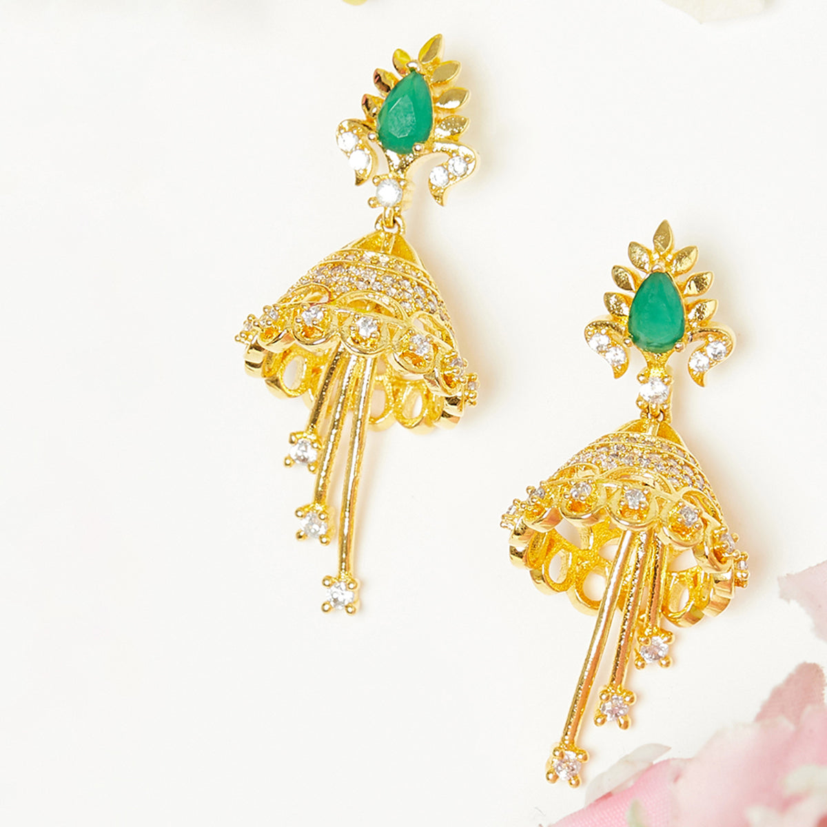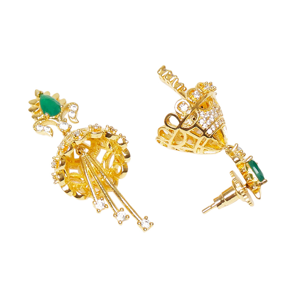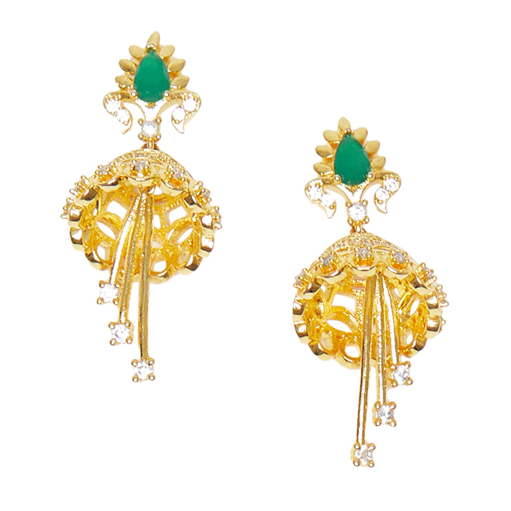 American Diamond CZ Traditional Gold Plated Green & White Brass Jhumka Earrings for Women