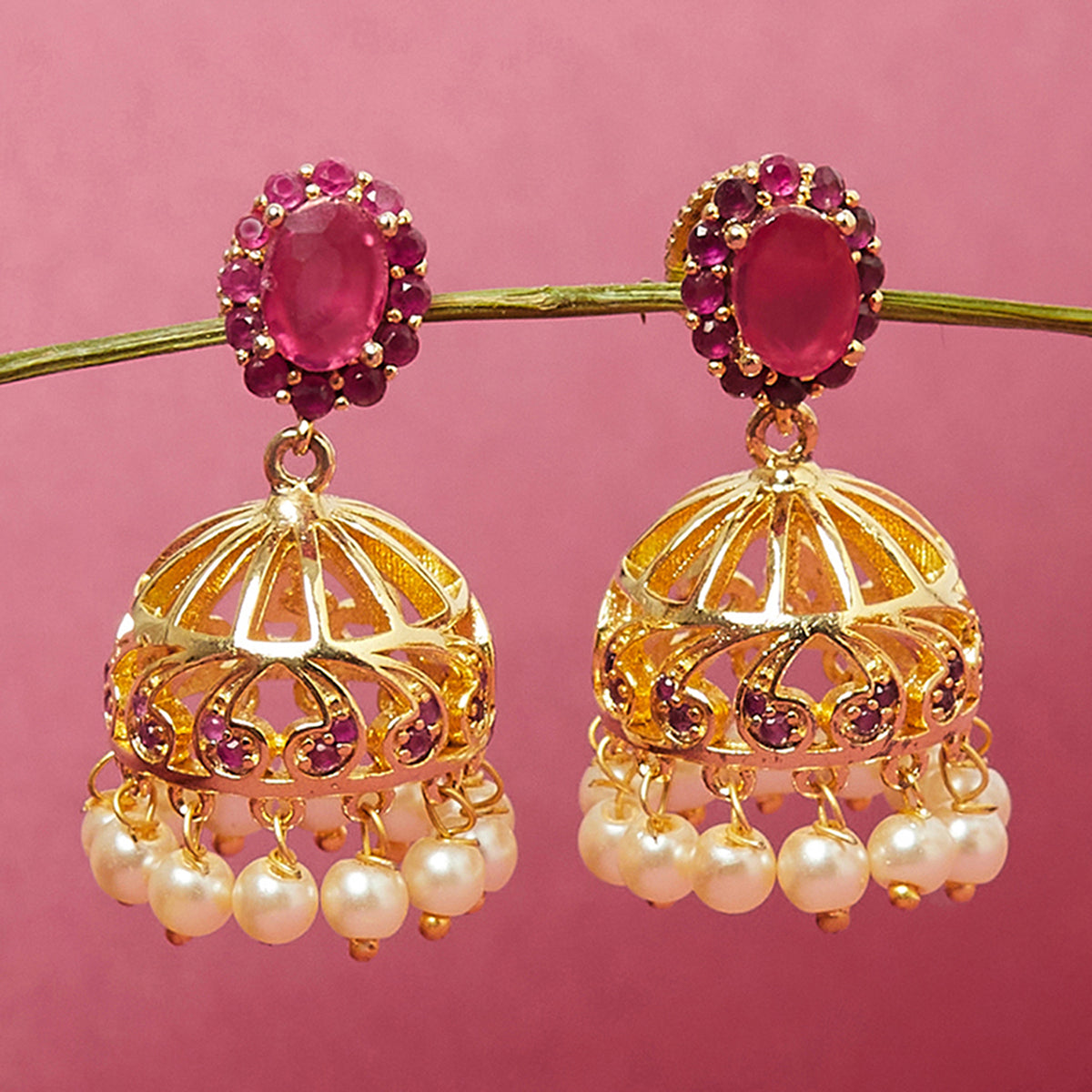 American Diamond CZ Traditional Gold Plated Red Brass Jhumka Earrings for Women