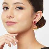 The studs in this piece is in itself a thing of beauty. Get this gold plated jhumki style earrings with ruby like semi-precious stones in the stud with mini stone detailing along with pearl droplets, if you are in the mood for something classy and want to add a splash of colors to your wardrobe.