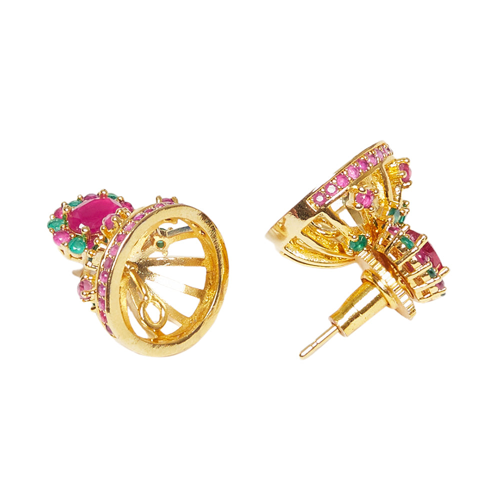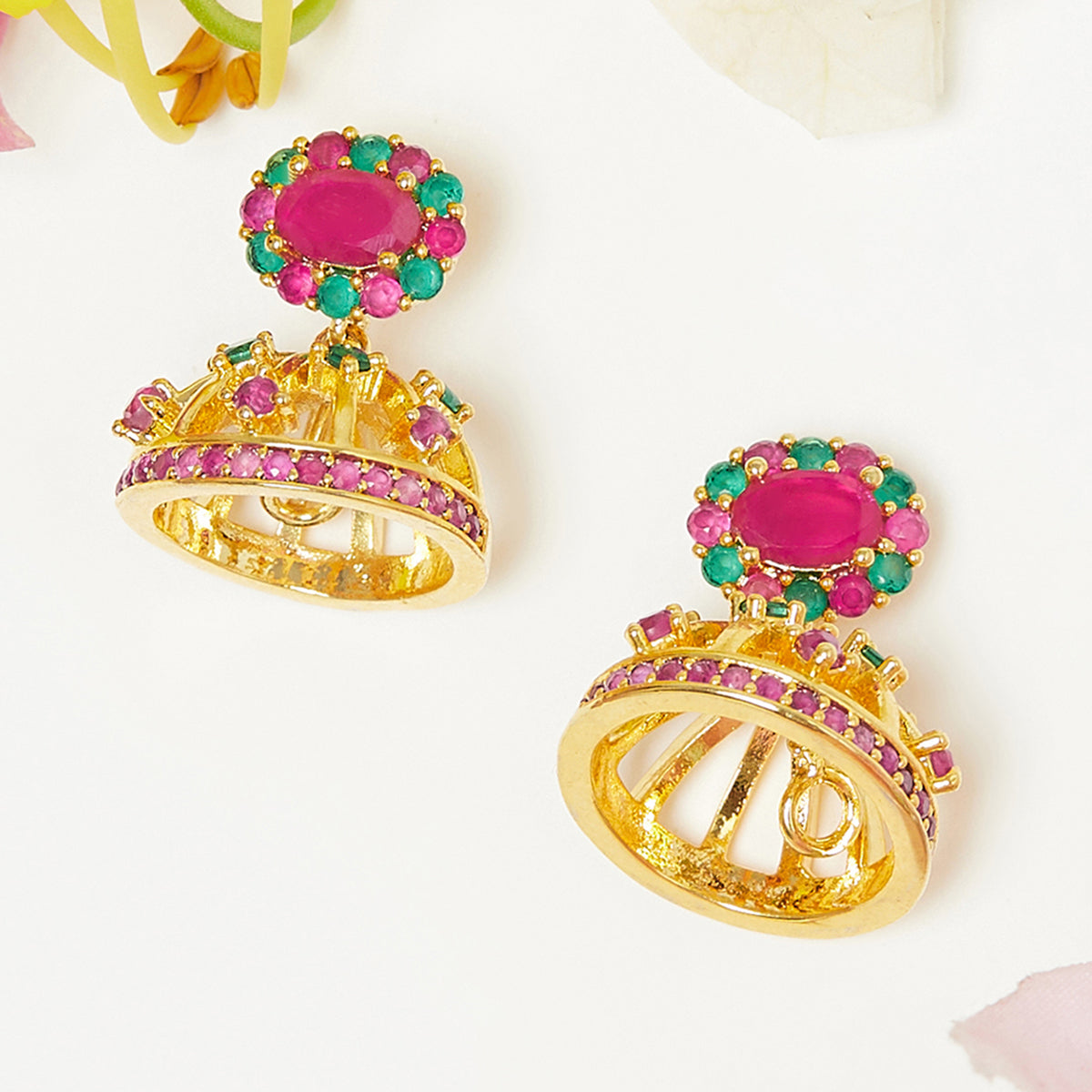 American Diamond CZ Traditional Gold Plated Red & Green Brass Jhumka Earrings for Women