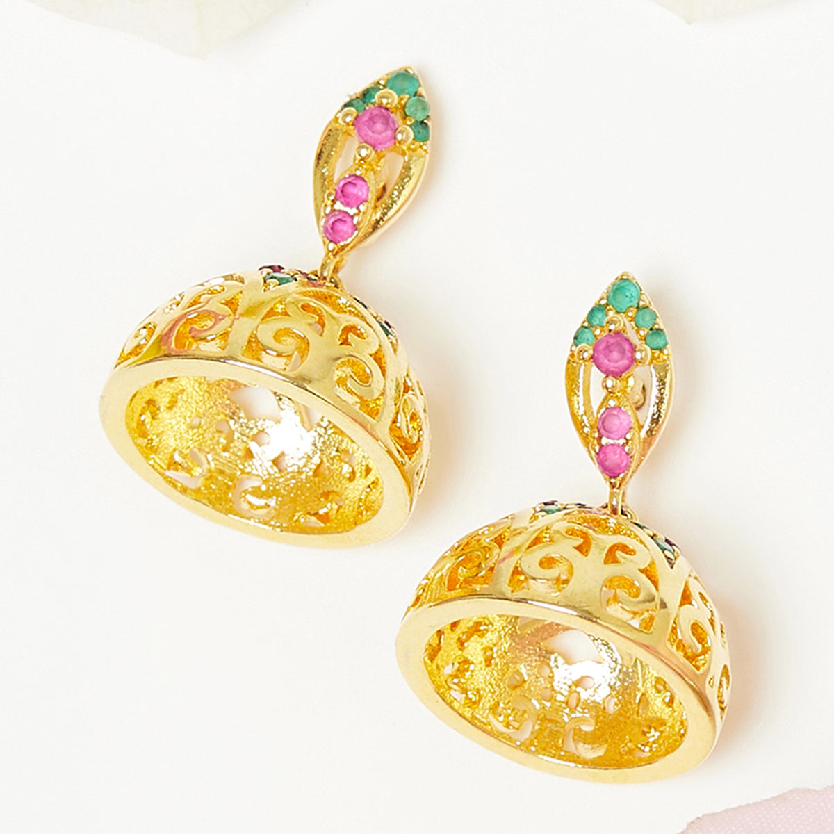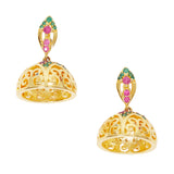American Diamond CZ Traditional Gold Plated Red & Green Brass Jhumka Earrings for Women