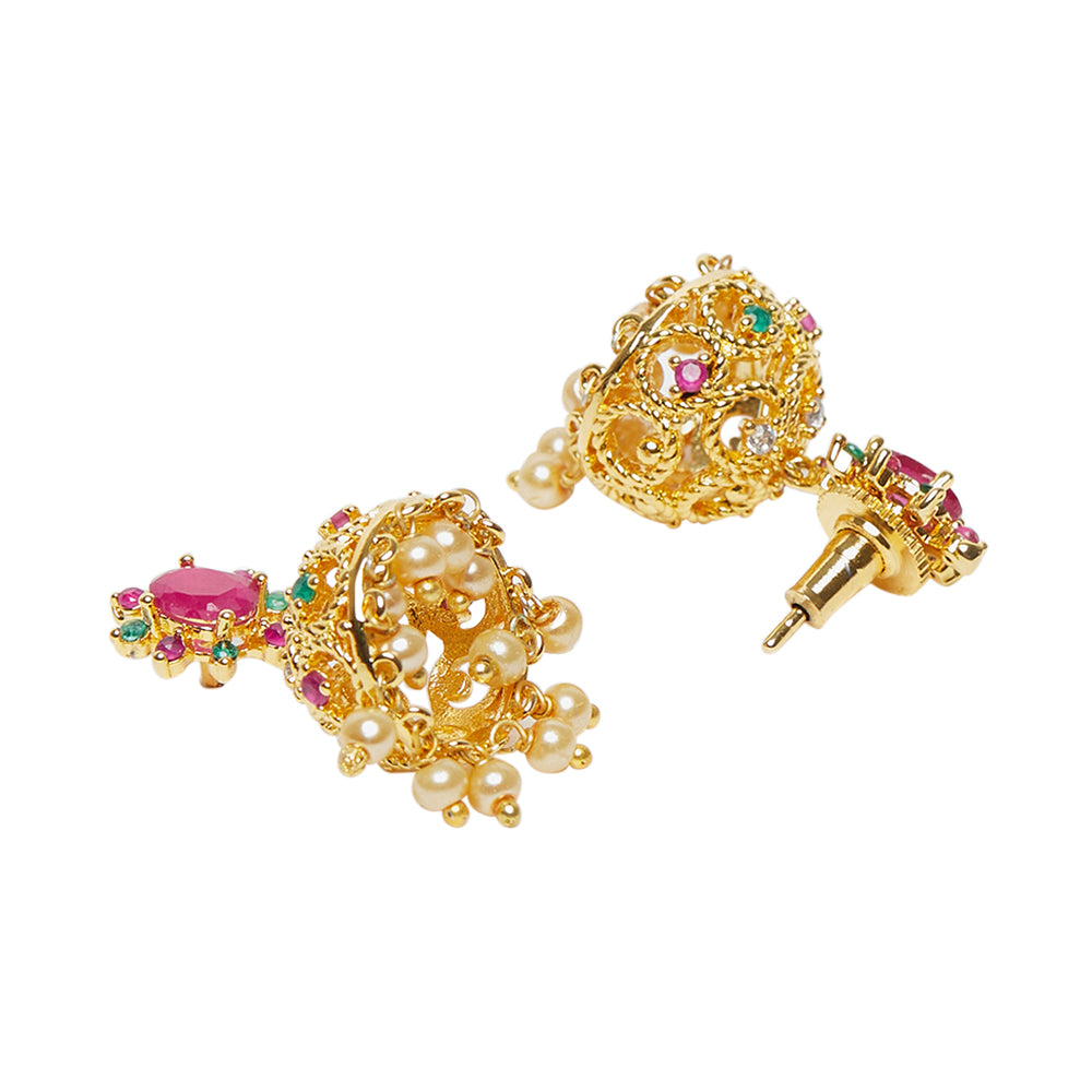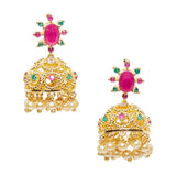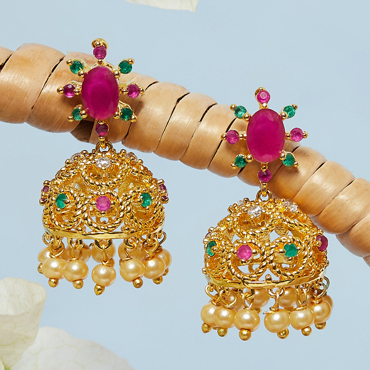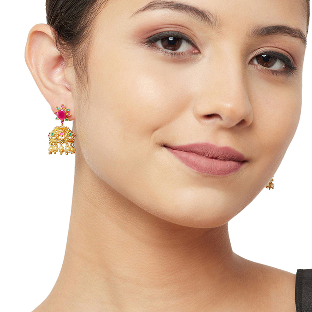 American Diamond CZ Traditional Gold Plated Red & Green Brass Jhumka Earrings for Women