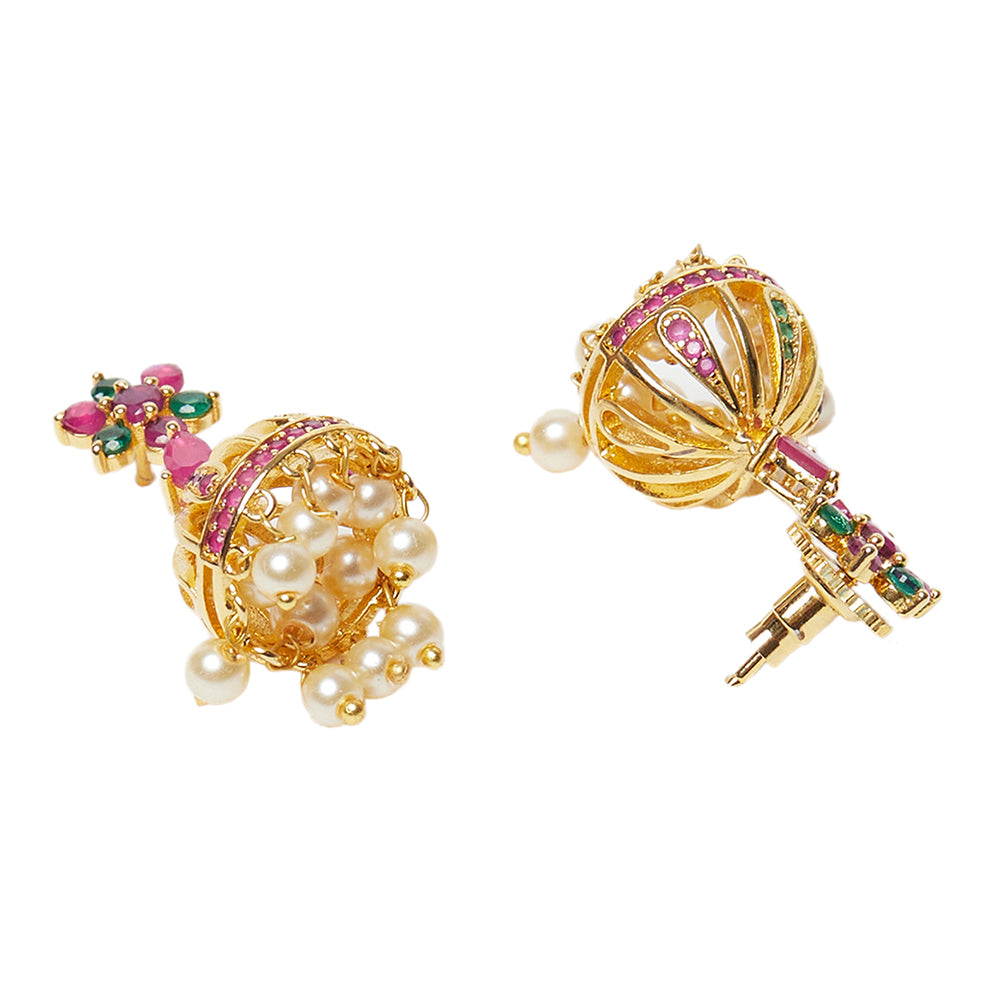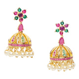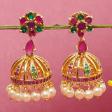 CZ Traditional Gold Plated Red & Green Jhumka Earrings