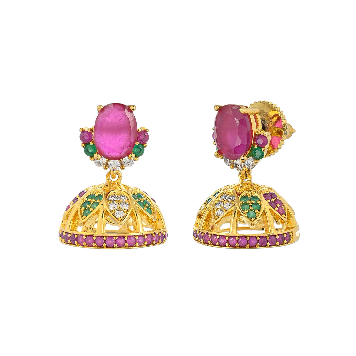 CZ Traditional Gold Plated Red & Green Jhumka Earrings
