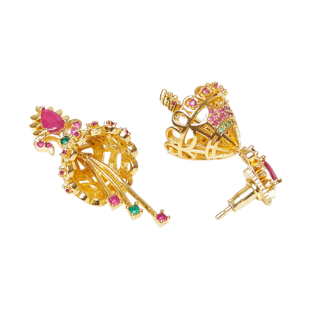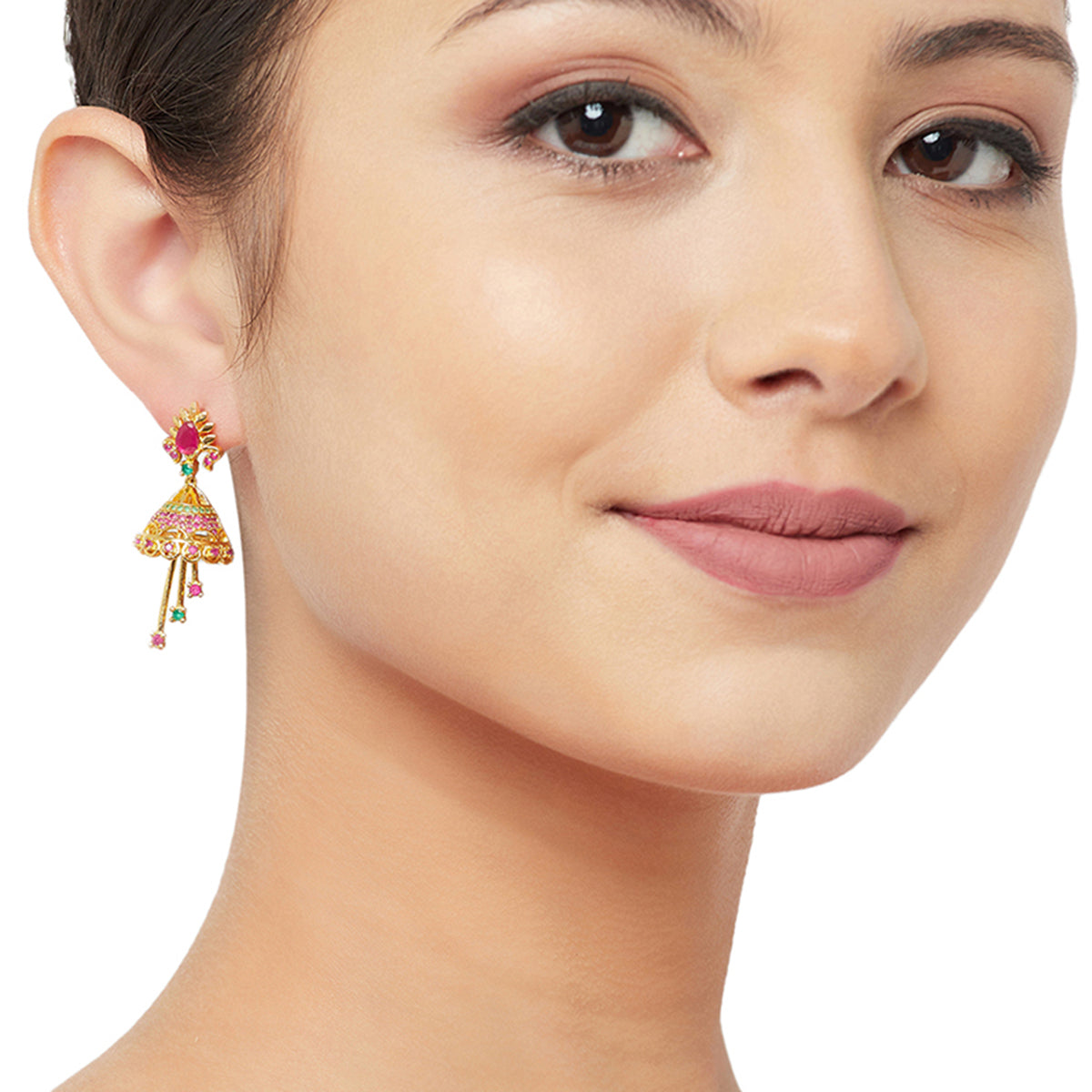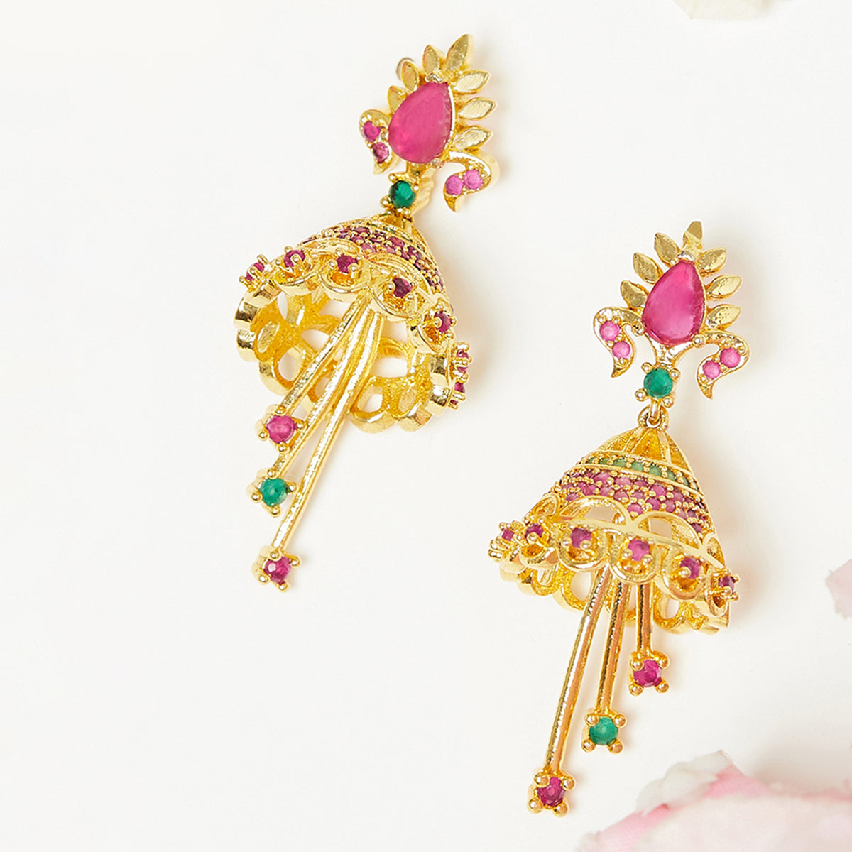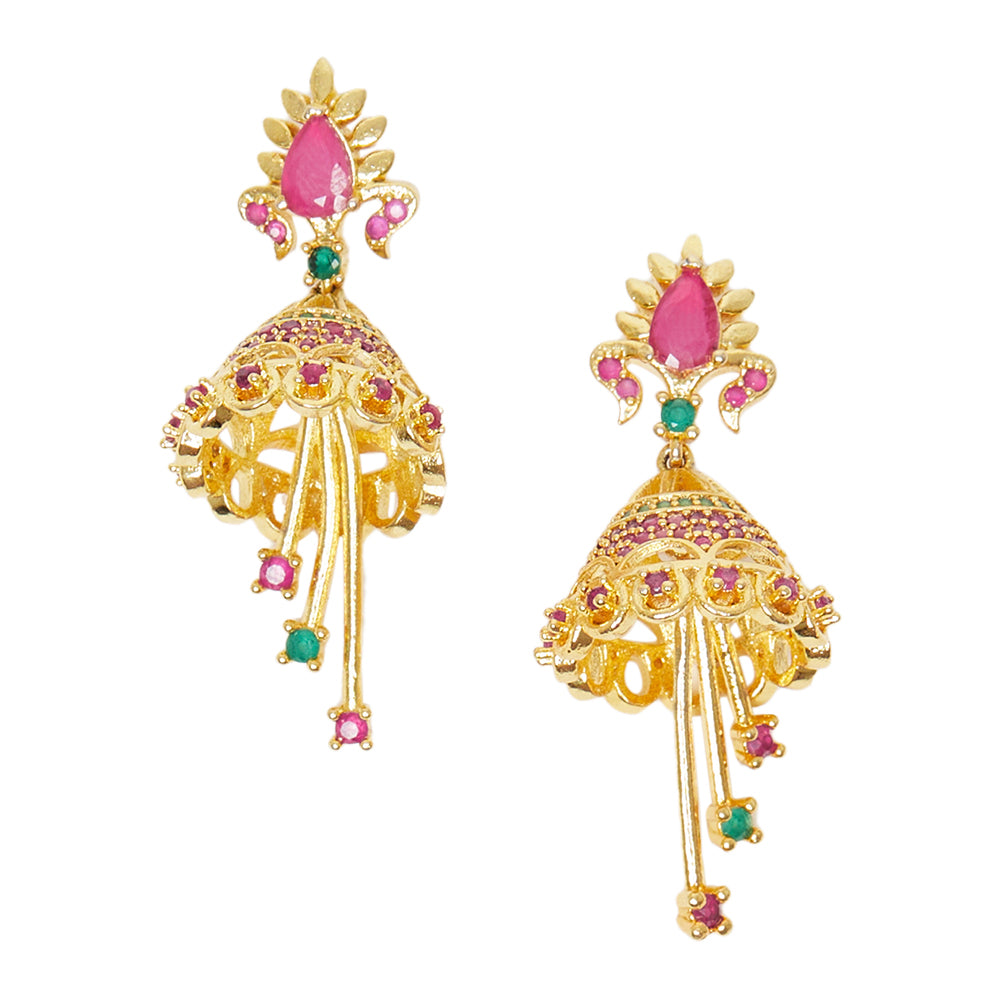 American Diamond CZ Traditional Gold Plated Red & Green Brass Jhumka Earrings for Women