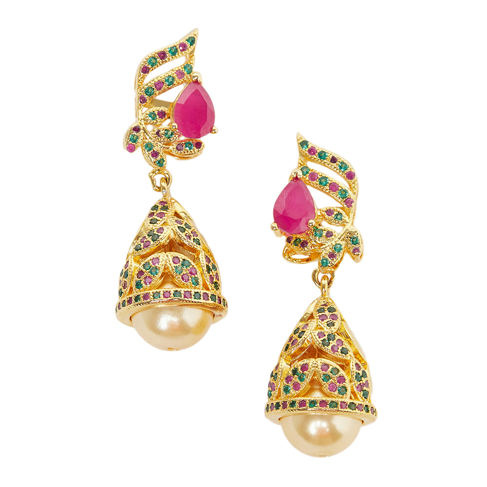 CZ Traditional Gold Plated Red & Green Jhumka Earrings