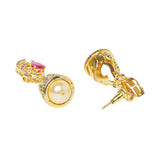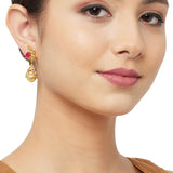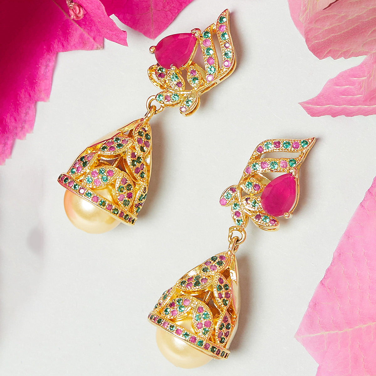 Add a touch of luxury to your wardrobe with Voylla's latest collection of earrings. This gold plated earring with pearl embellishments and ruby-like studs with multi colored stone detailing is something that can increase your style quotient by manifold. Get this both offline and online today!
