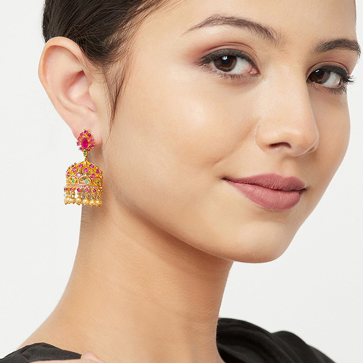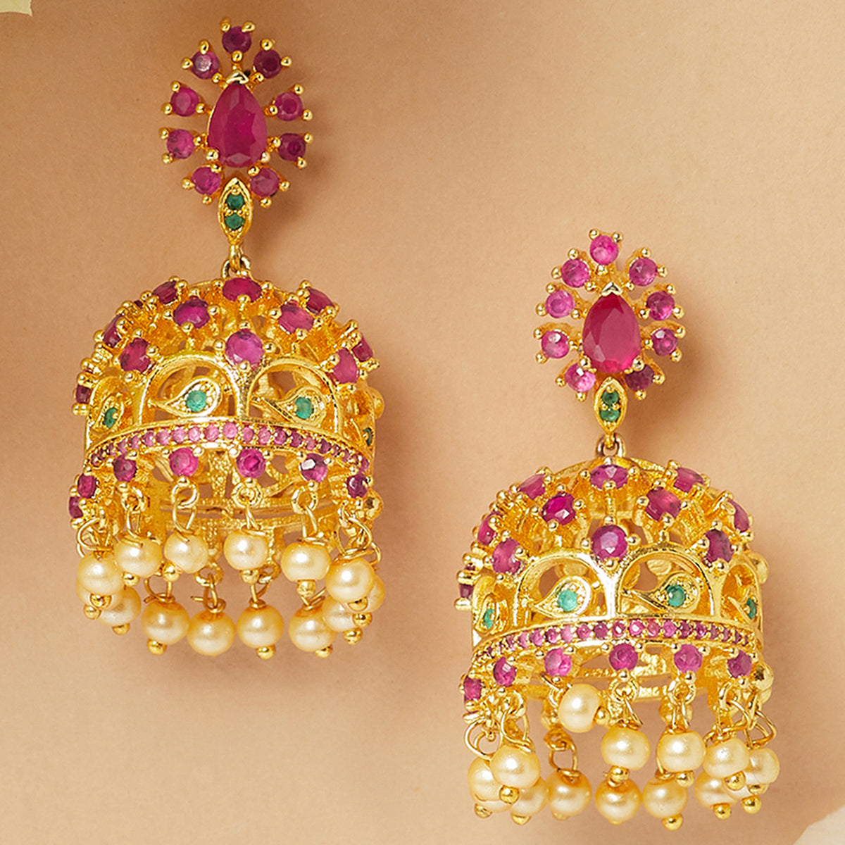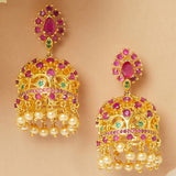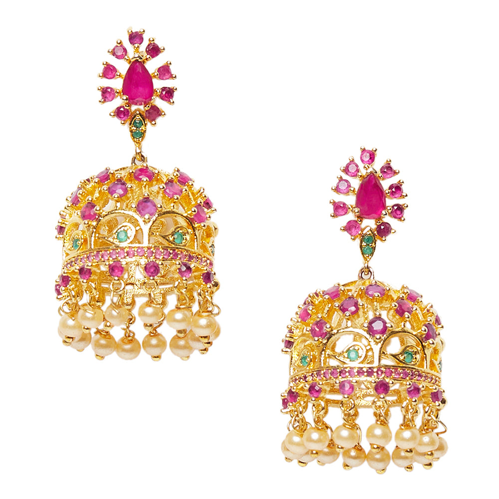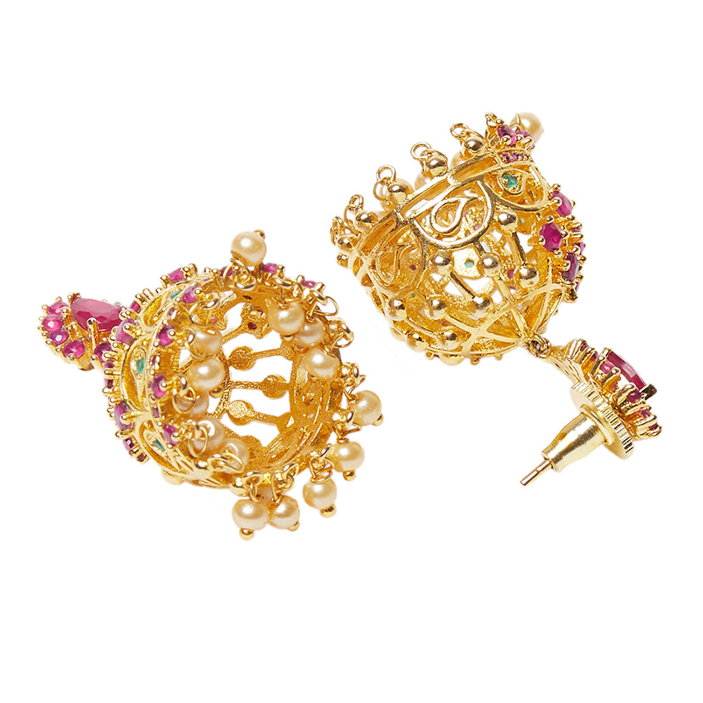 American Diamond CZ Traditional Gold Plated Red & Green Brass Jhumka Earrings for Women