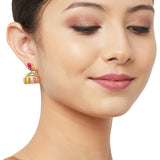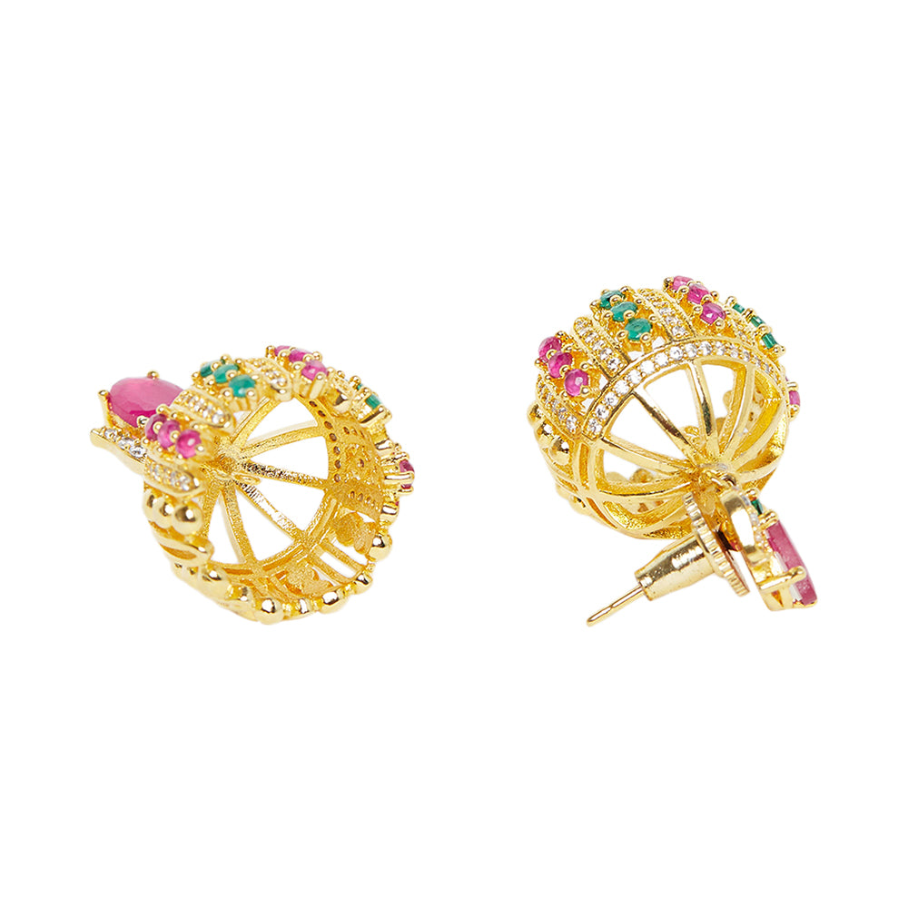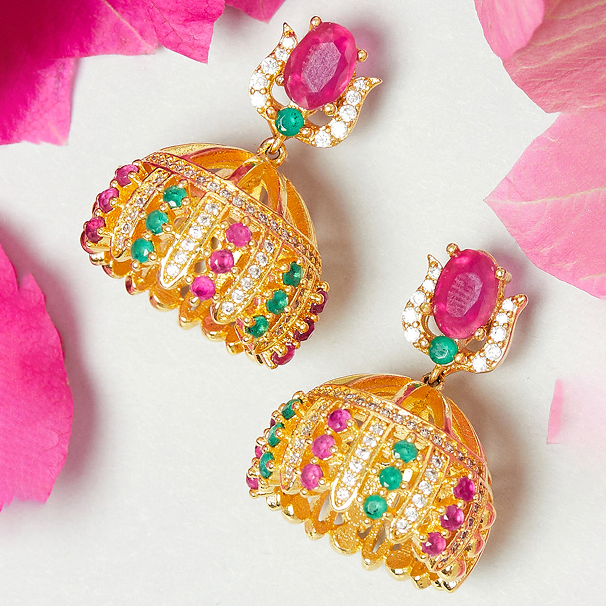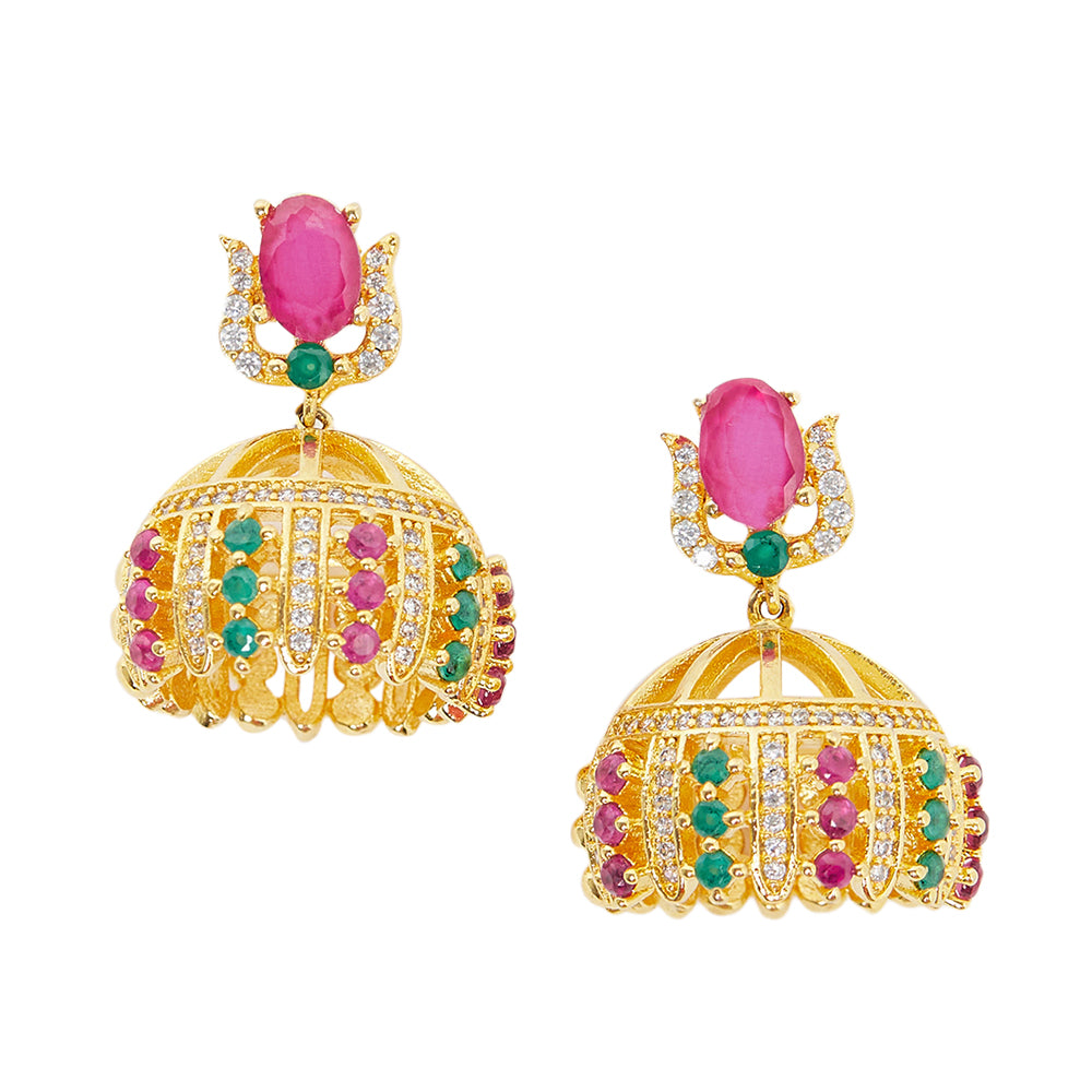 American Diamond CZ Traditional Gold Plated Red & Green Brass Jhumka Earrings for Women
