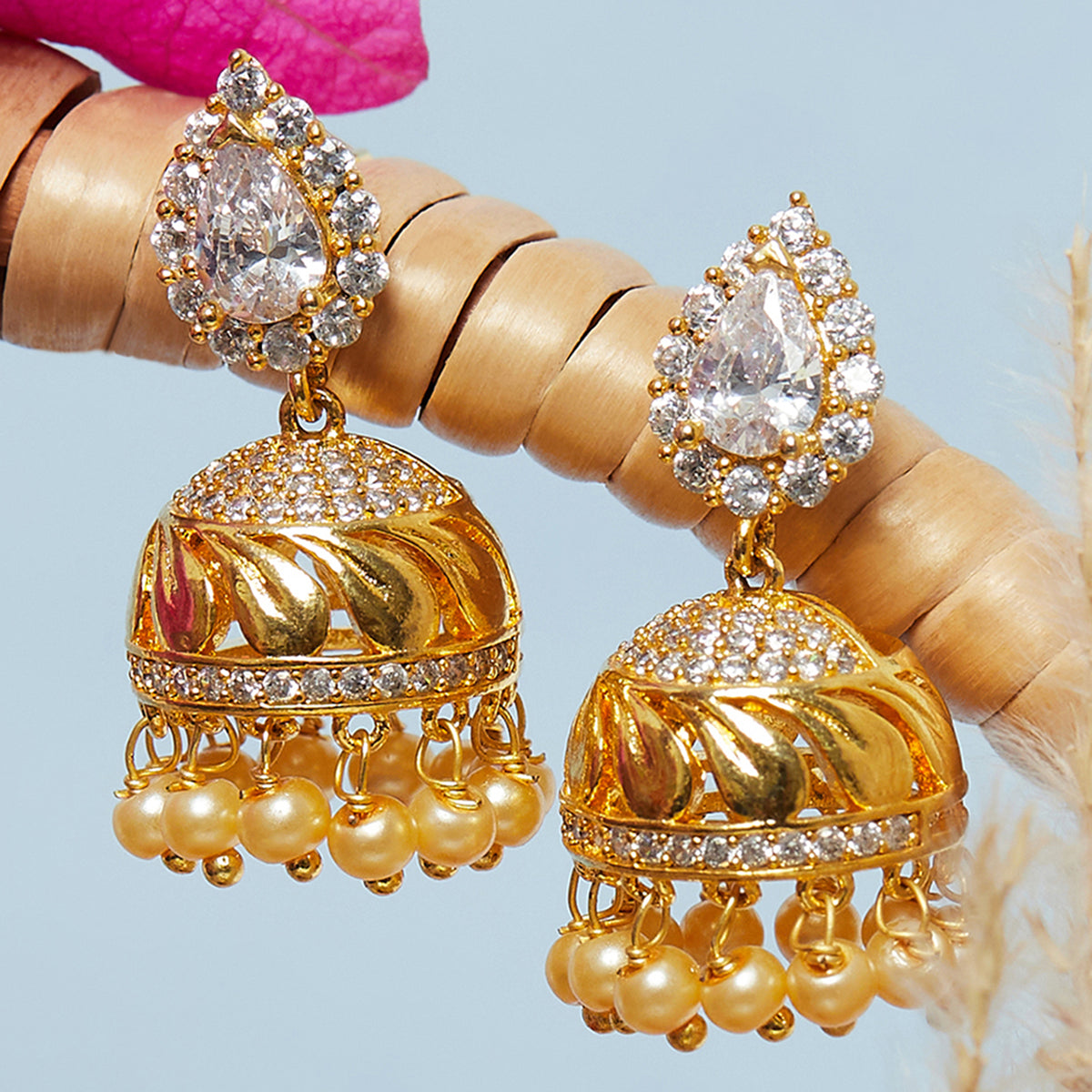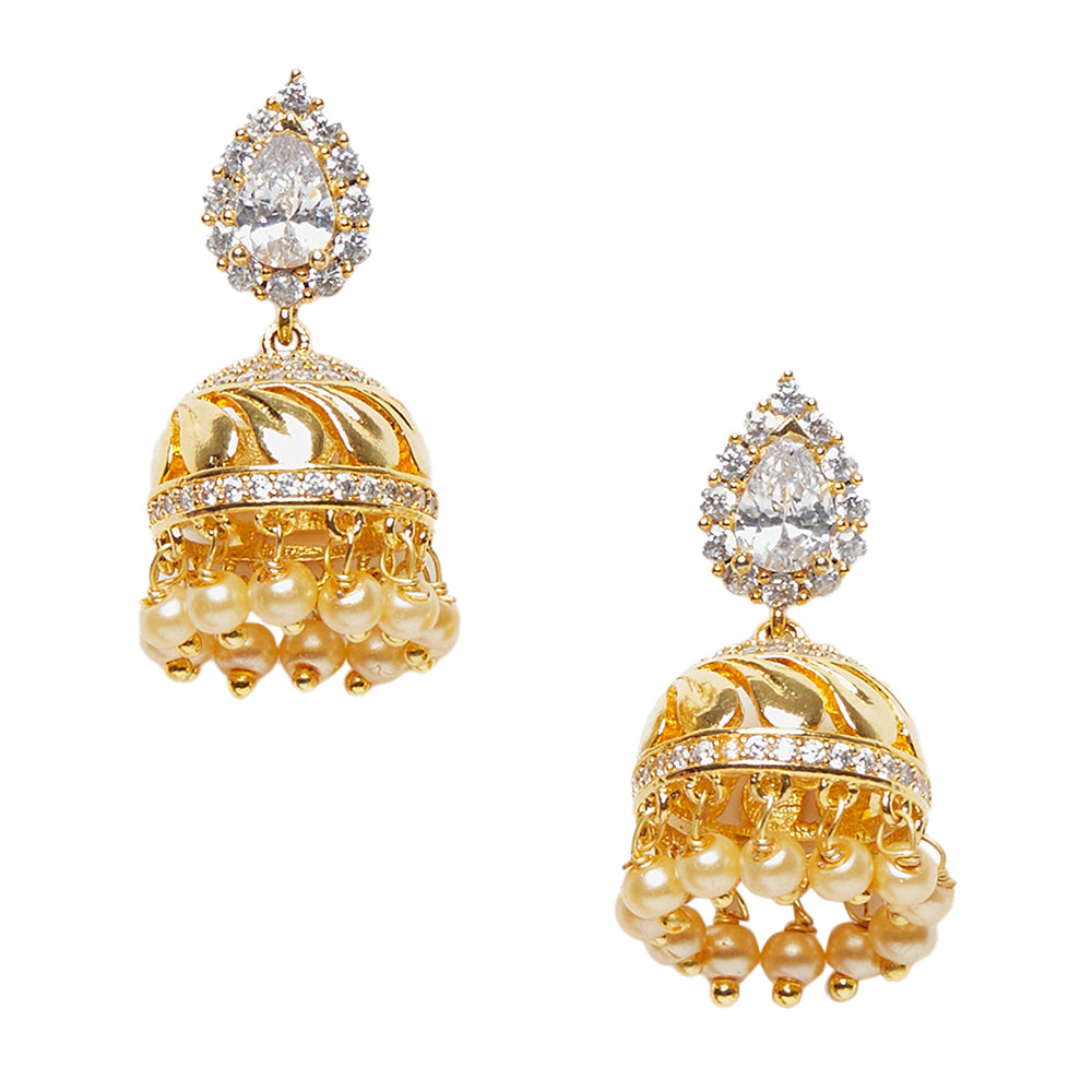American Diamond CZ Traditional Gold Plated White Brass Jhumka Earrings for Women
