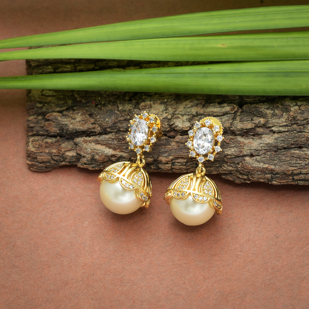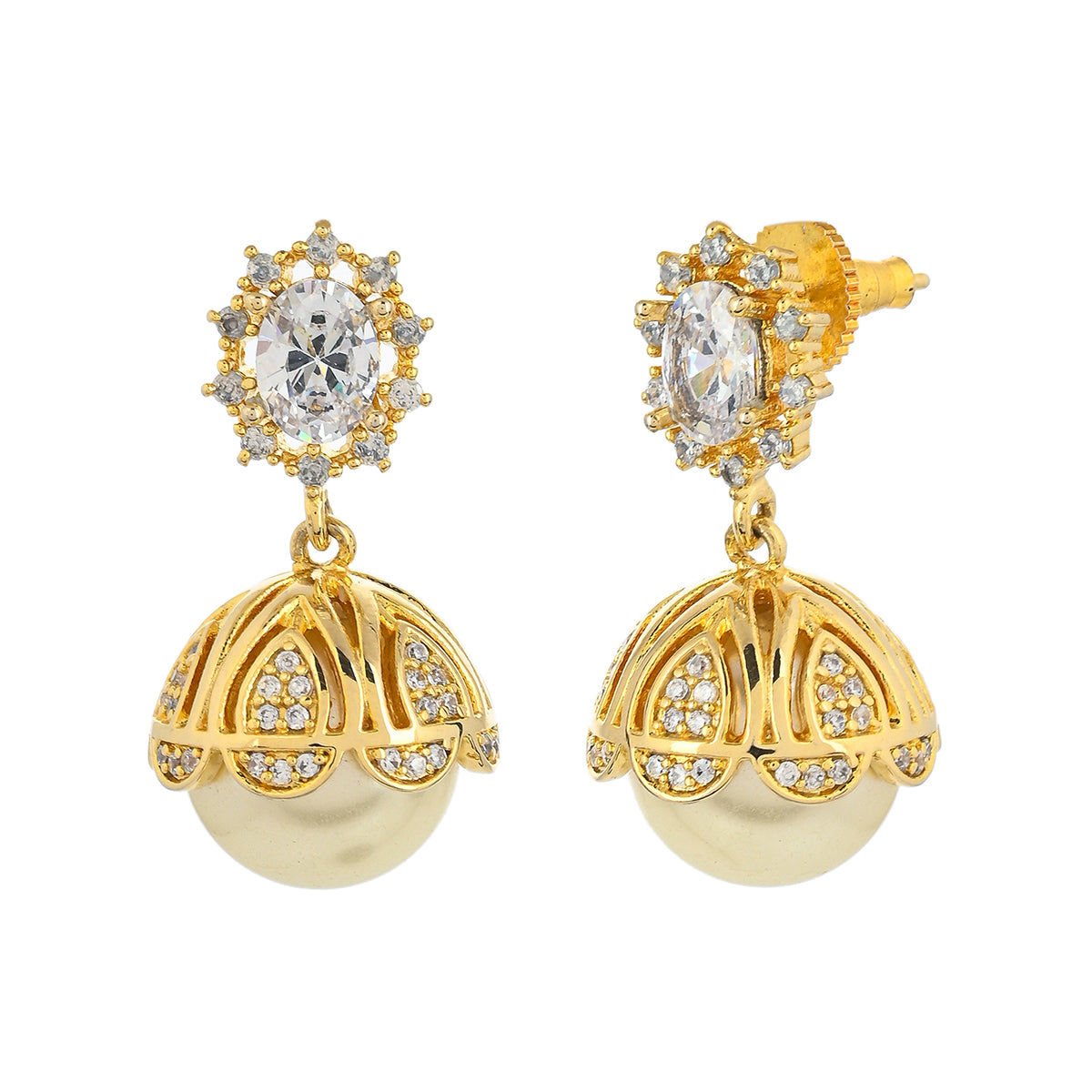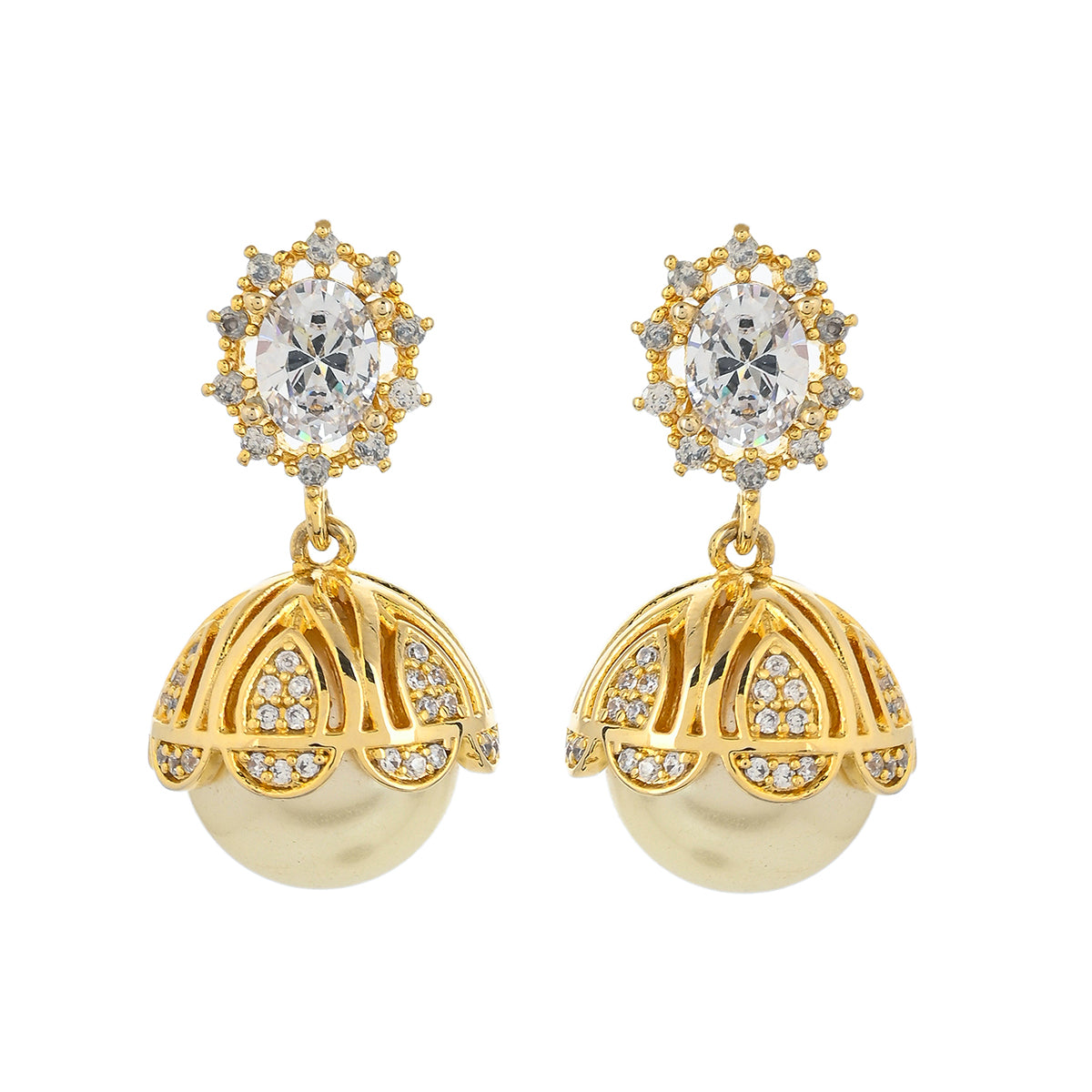 American Diamond CZ Traditional Gold Plated White Brass Jhumka Earrings for Women