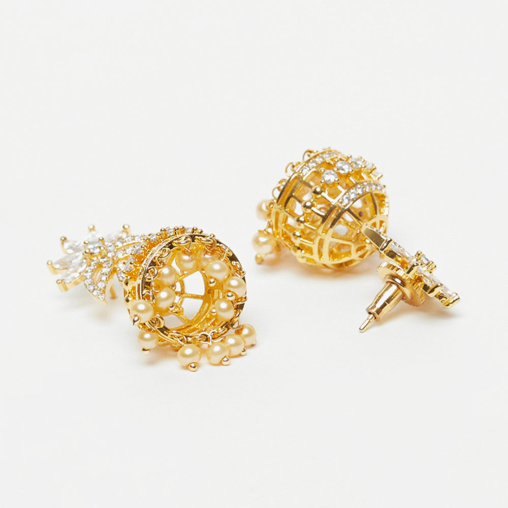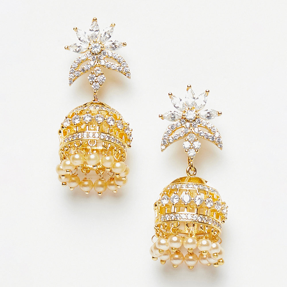 American Diamond CZ Traditional Gold Plated White Brass Jhumka Earrings for Women
