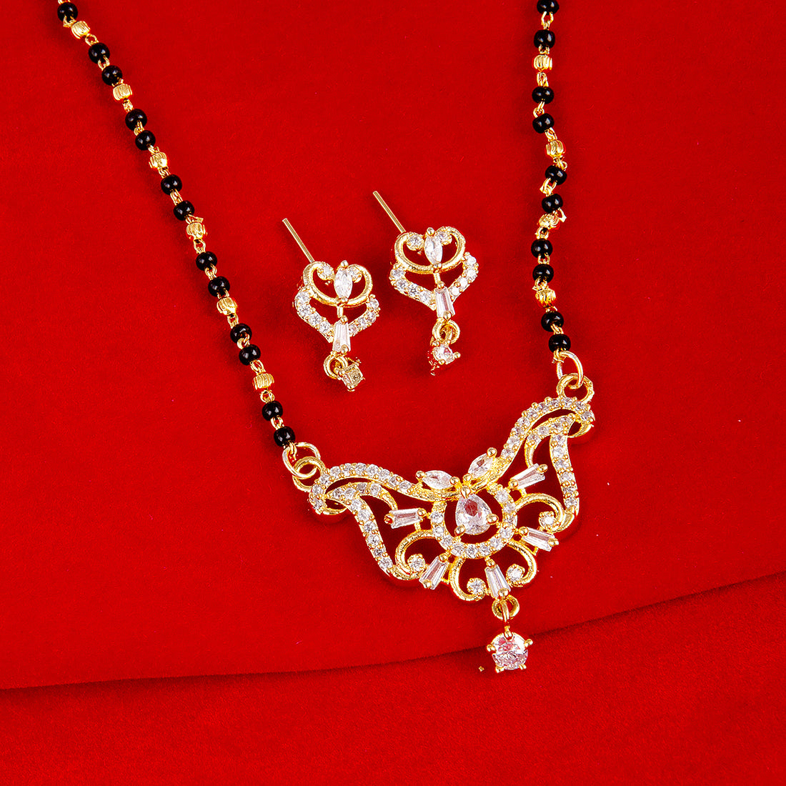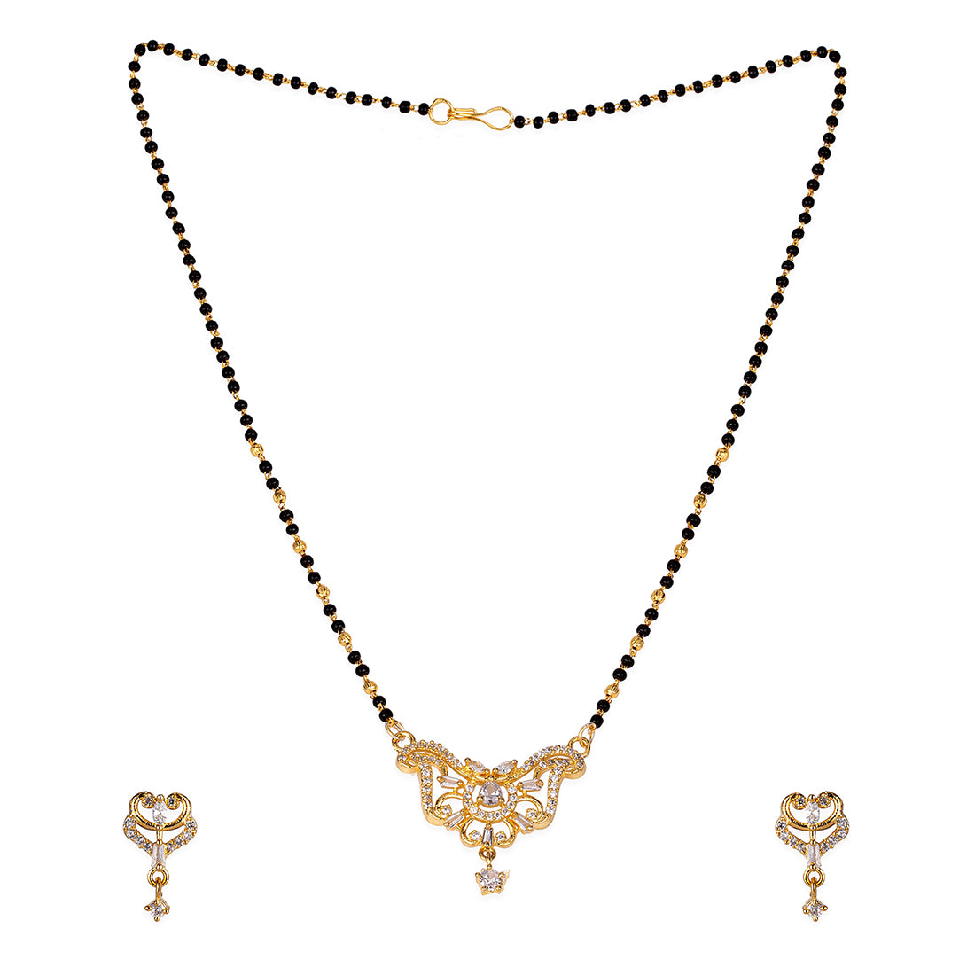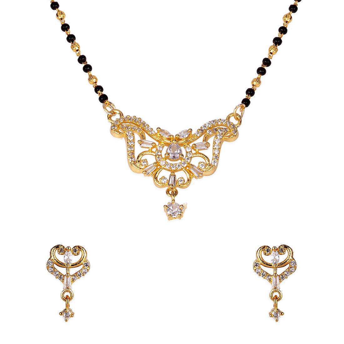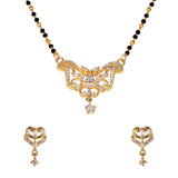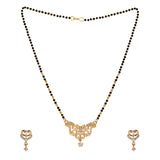 American Diamond CZ Traditional Golden Brass Black Beaded Mangalsutra with Earrings