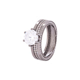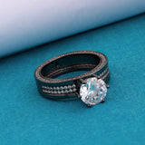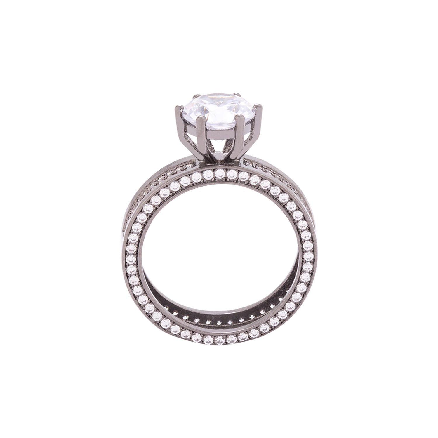 Black rhodium plated band ring, fashioned out of brass. CZ gem embellished. Good for formal looks.