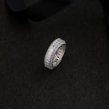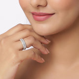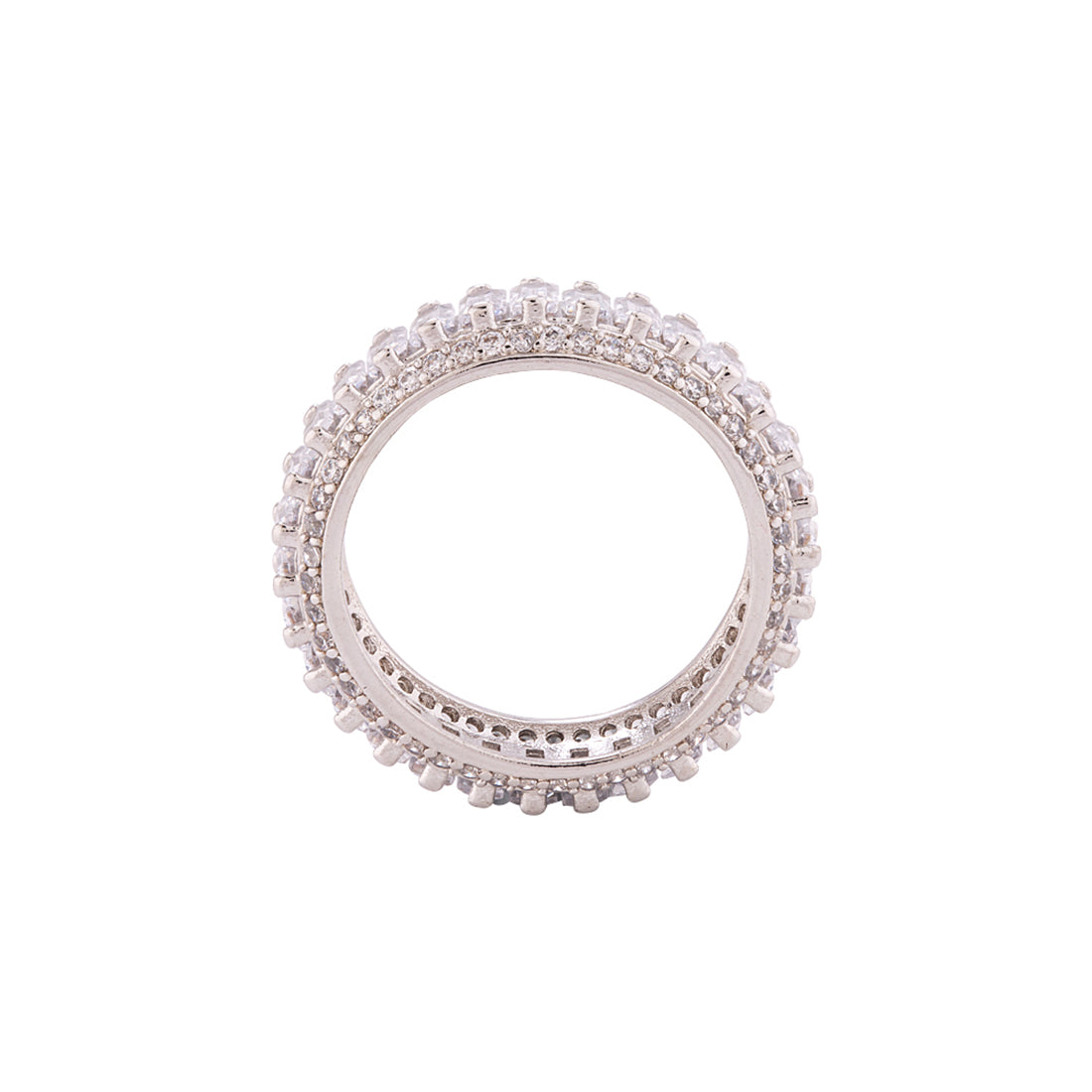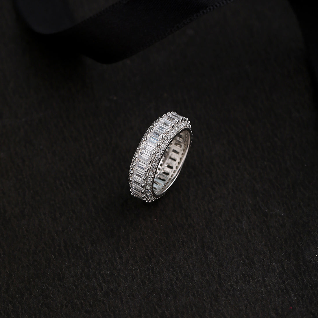 Band ring embellished with zircon gemstones. Made from brass and silver plated. Wear with formal attire.