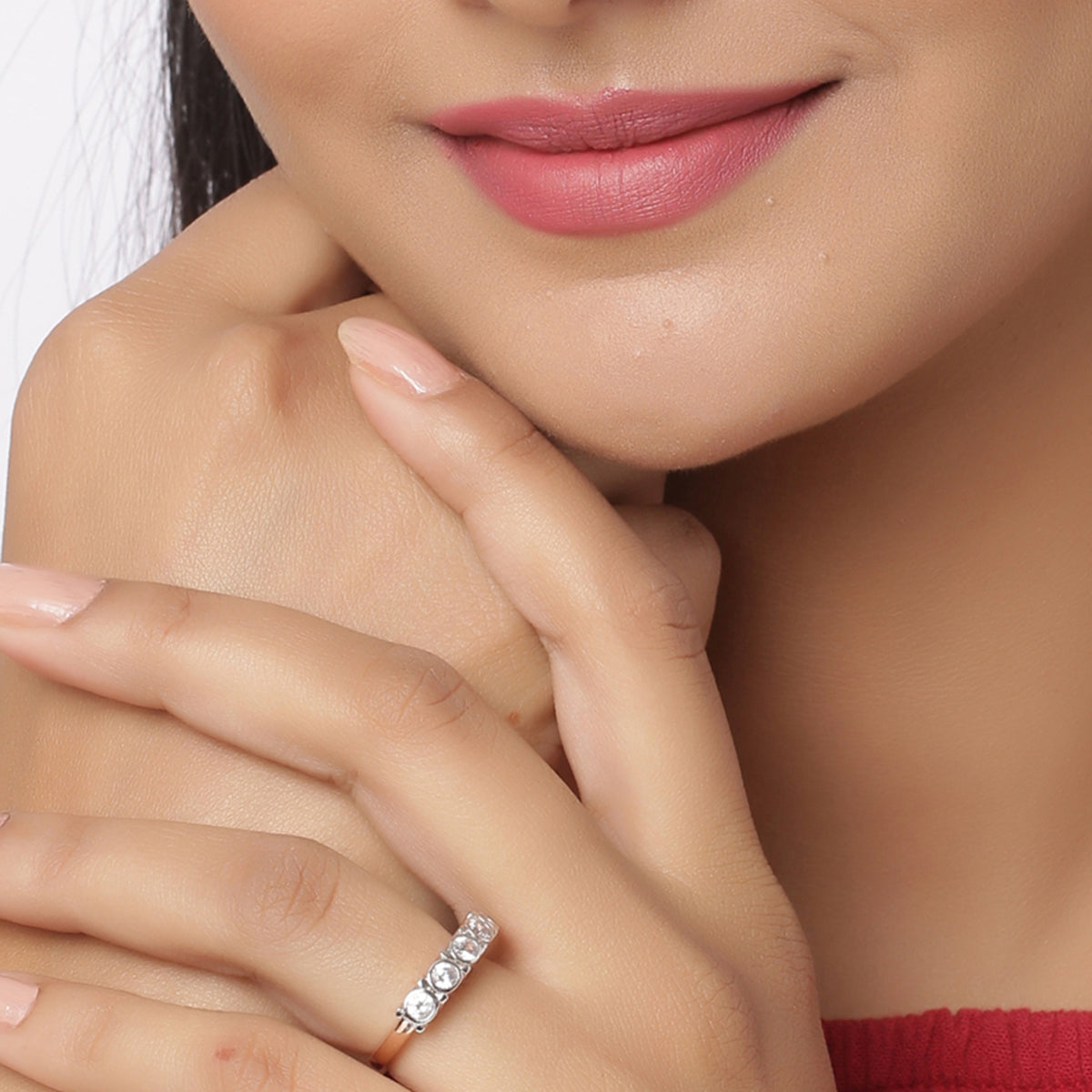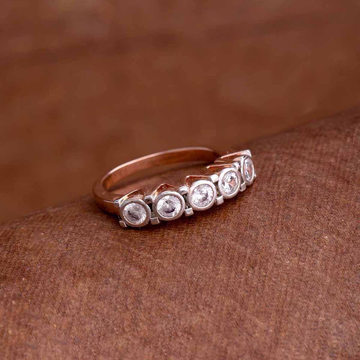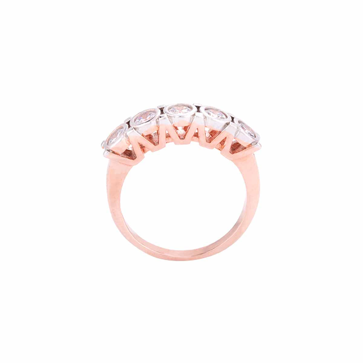 Women's band ring with CZ gemstones. Made from brass and rose gold plated. Wear with formal attire.