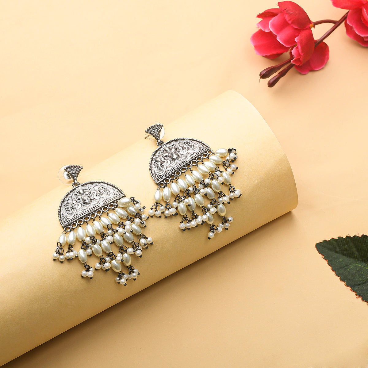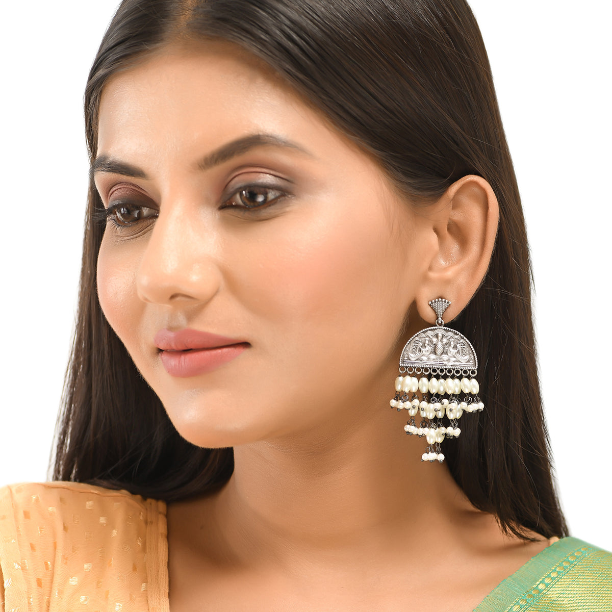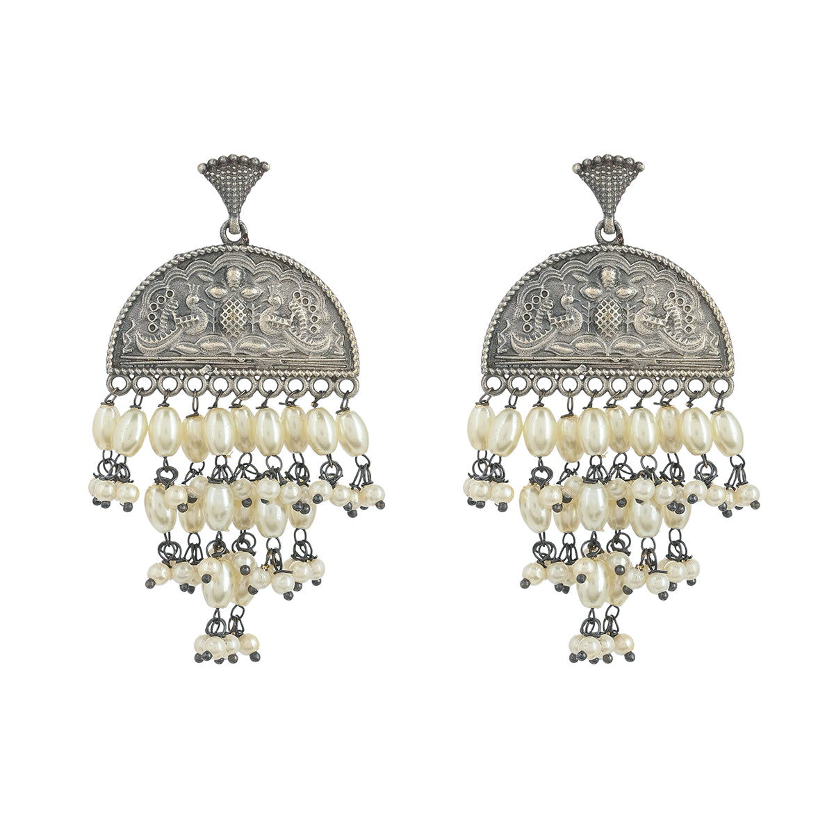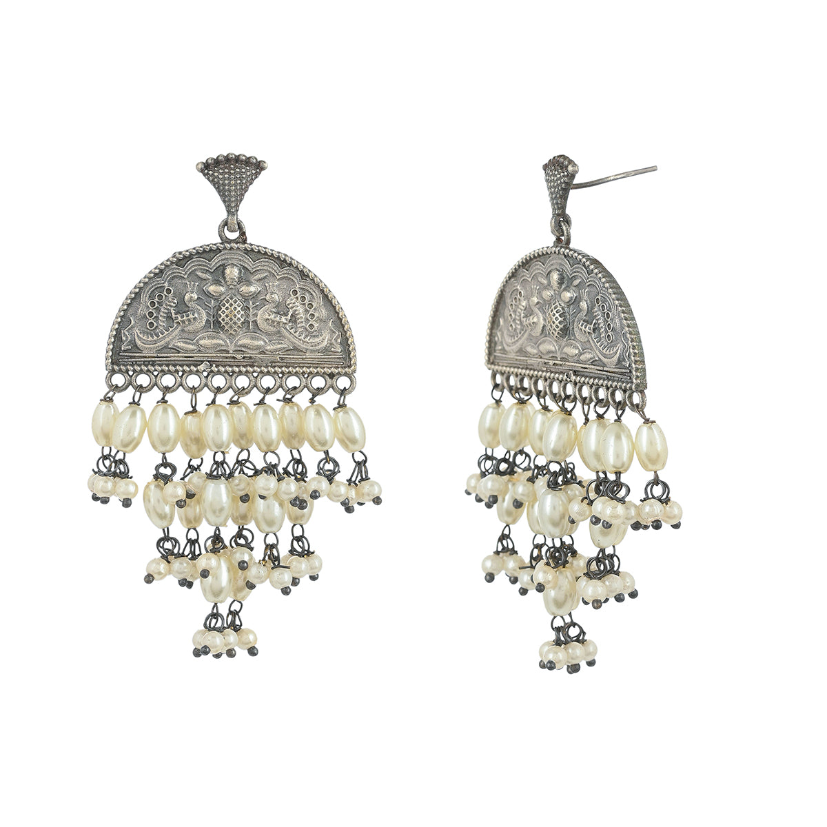 Lovely drop earrings, embellished with faux pearls and embossed with peacock motifs. Made from brass and oxidised silver plated, the earrings can be paired with ethnic looks of all kinds.