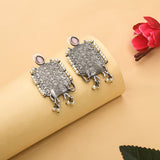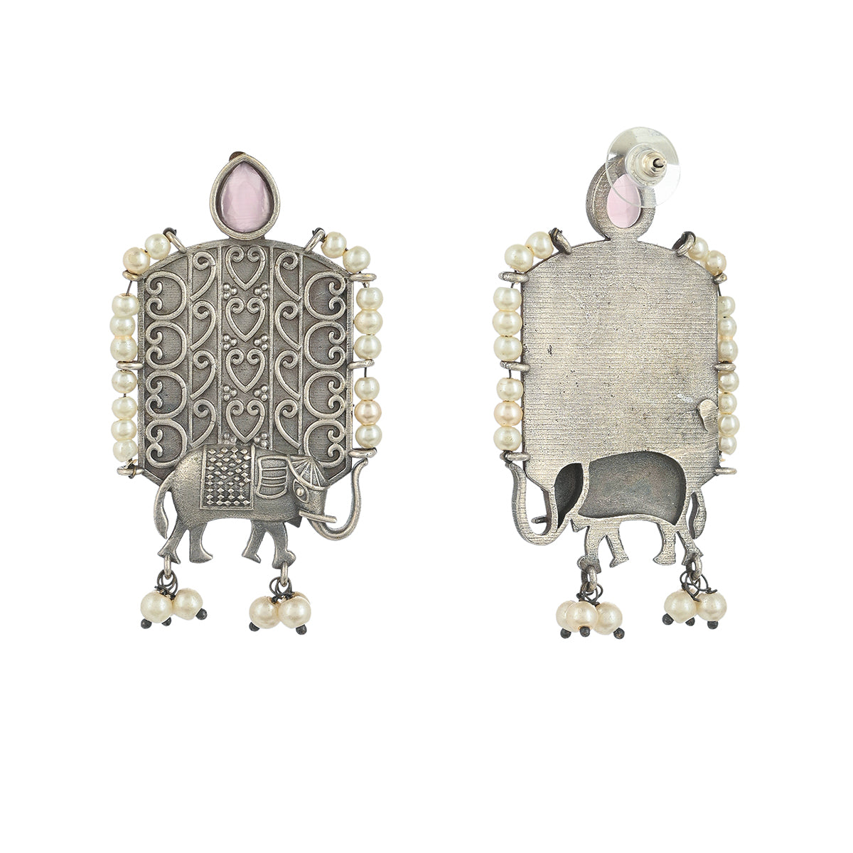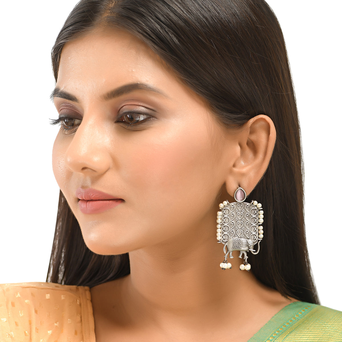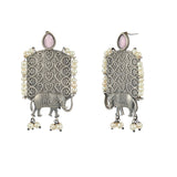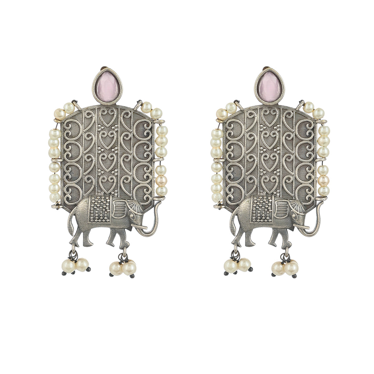 Ethnic earrings fashioned out of brass and featuring royal elephant motifs. Oxidised silver plating adds to the charm of this pair, which has been embellished with faux white pearls. The earrings will go really well with a traditional silk saree.