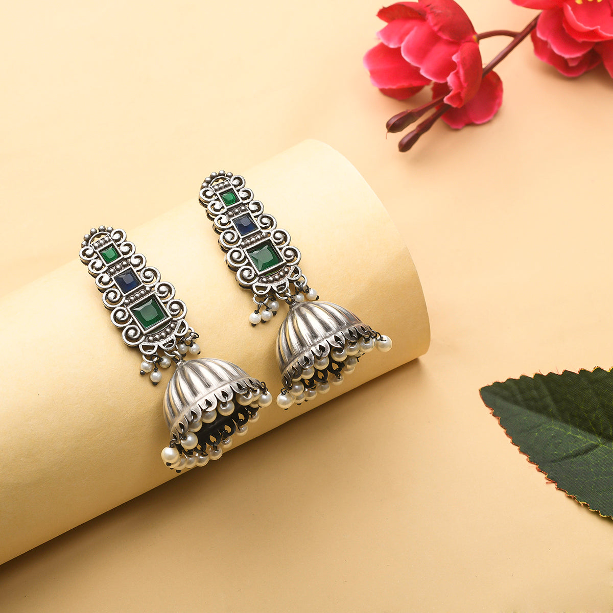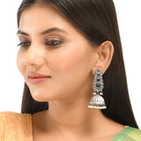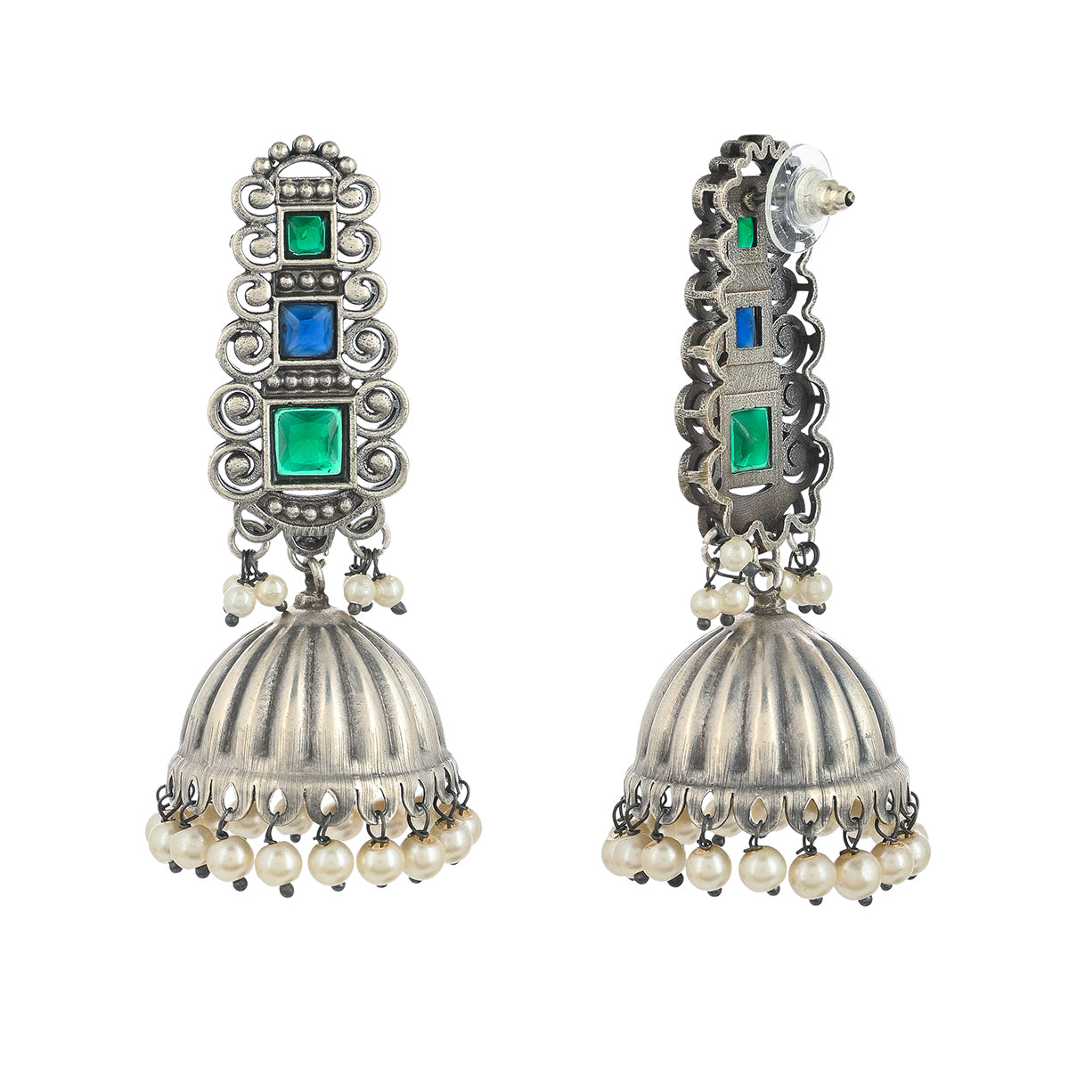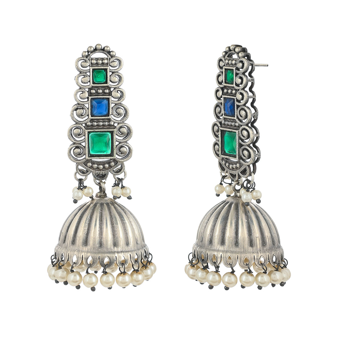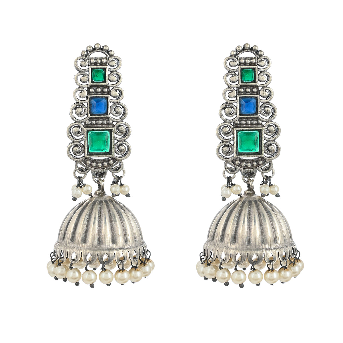 Antique inspired ethnic jhumka earrings, fashioned out of quality brass. Oxidised silver plated and embellished with emerald cut faux kundan gems and white faux pearls. Pair the earrings with a traditional silk saree.