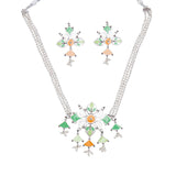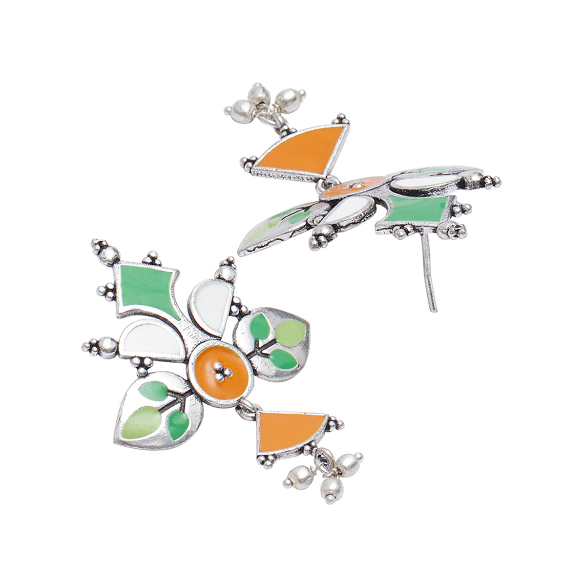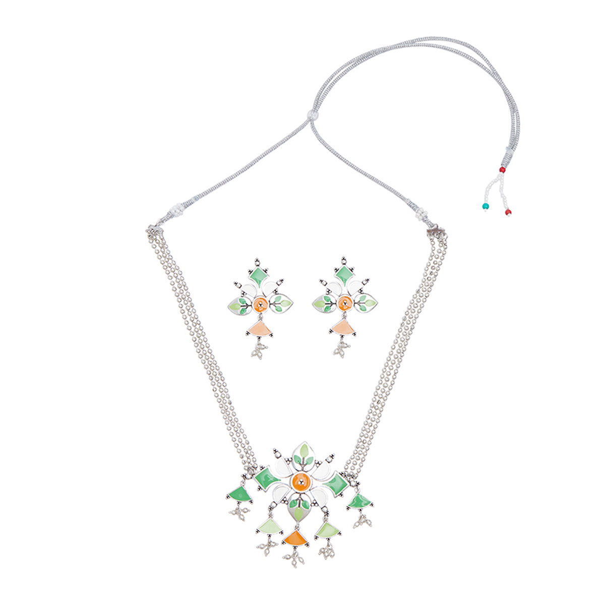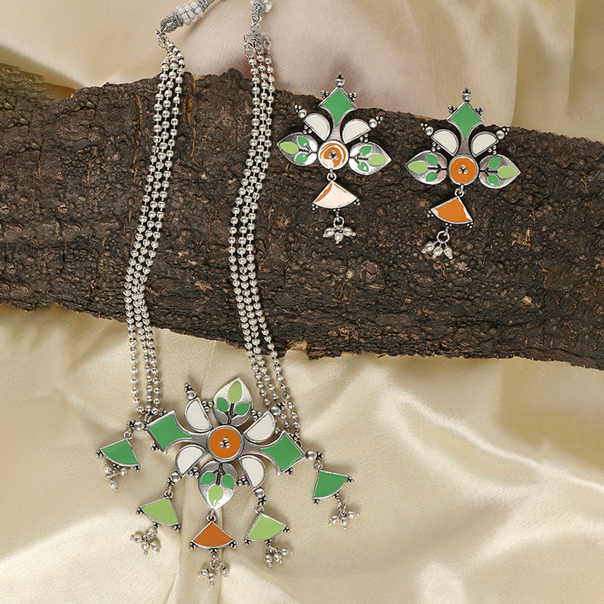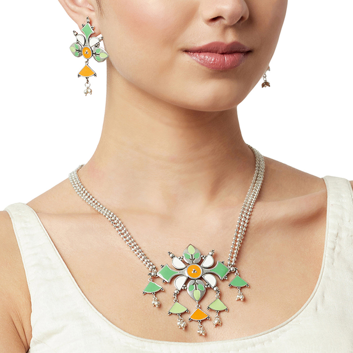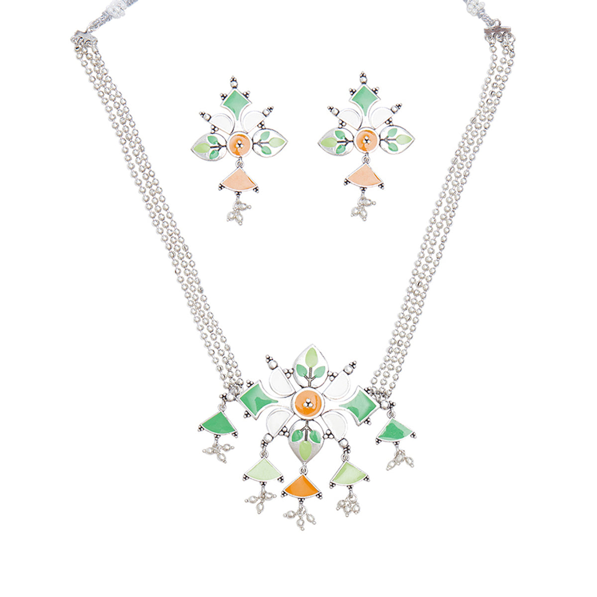 Festive Hues Enamelled Floral Patterns Silver Plated Jewellery Set