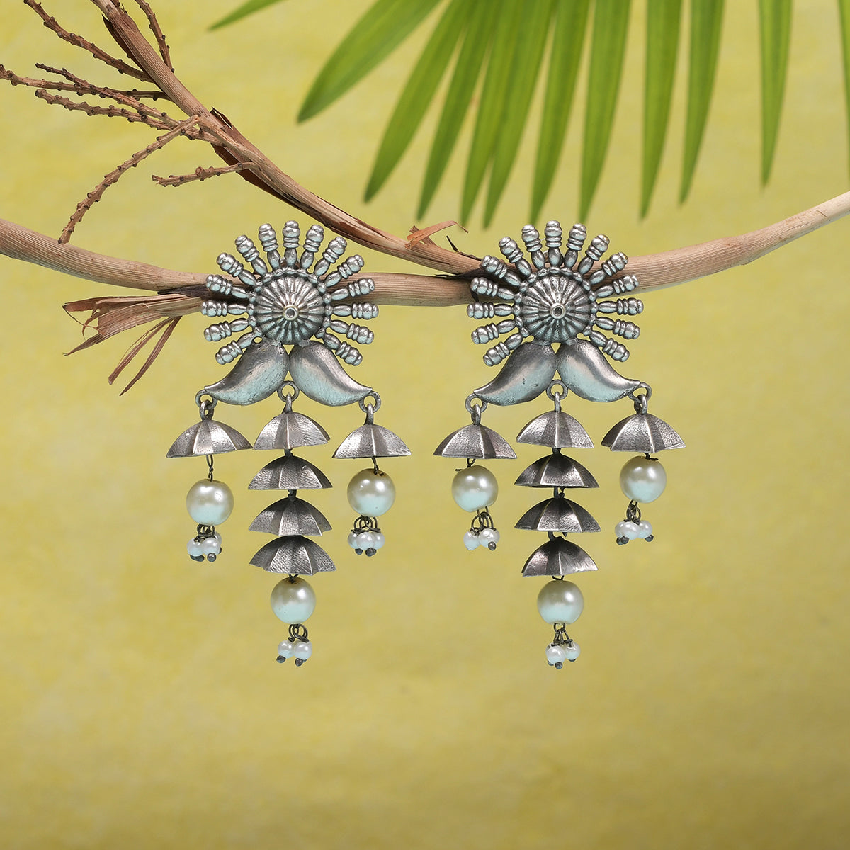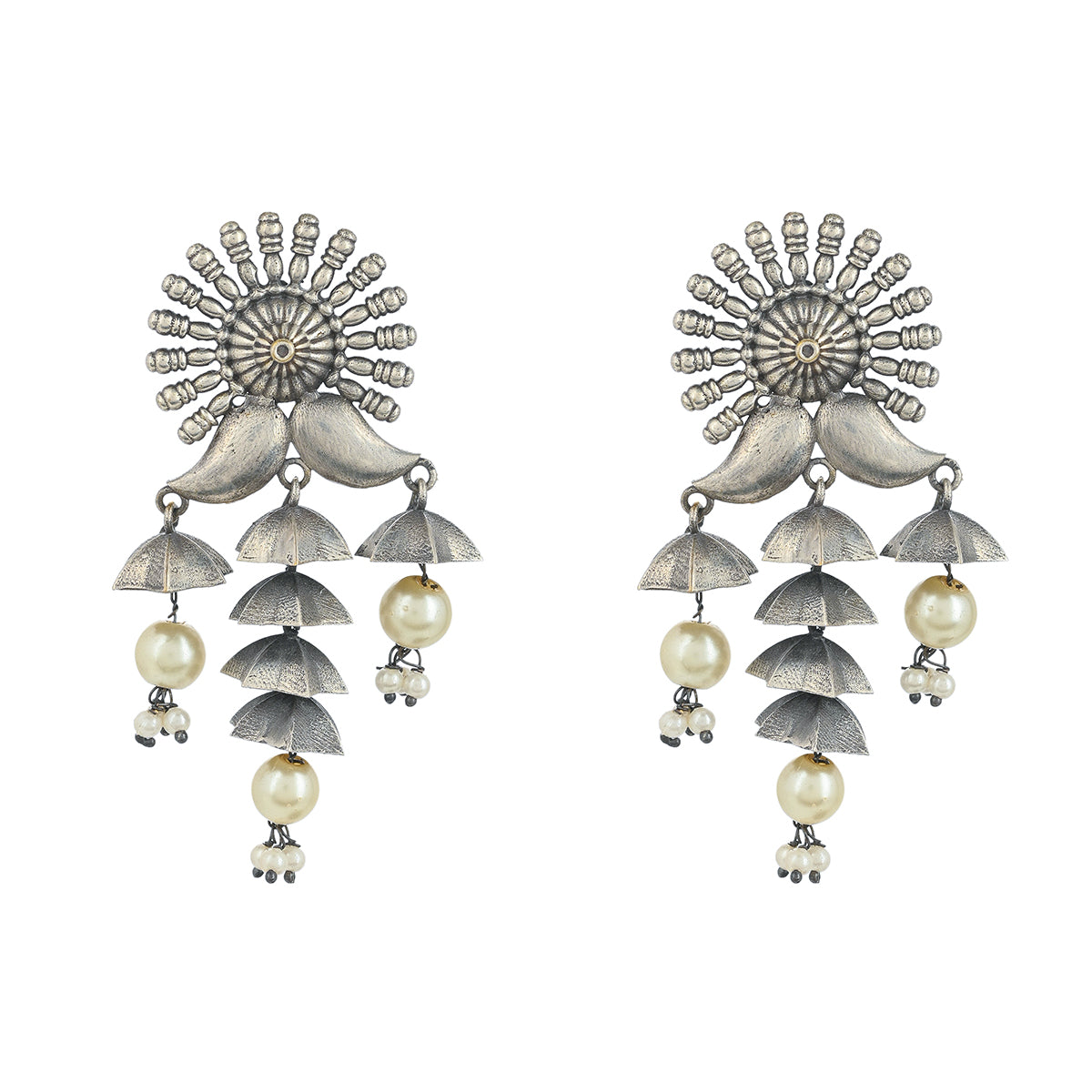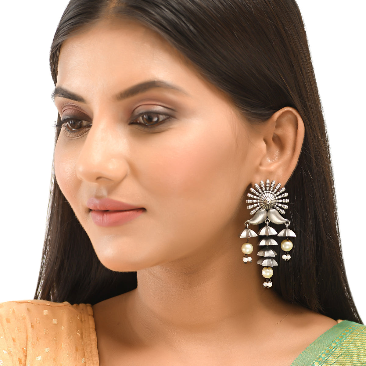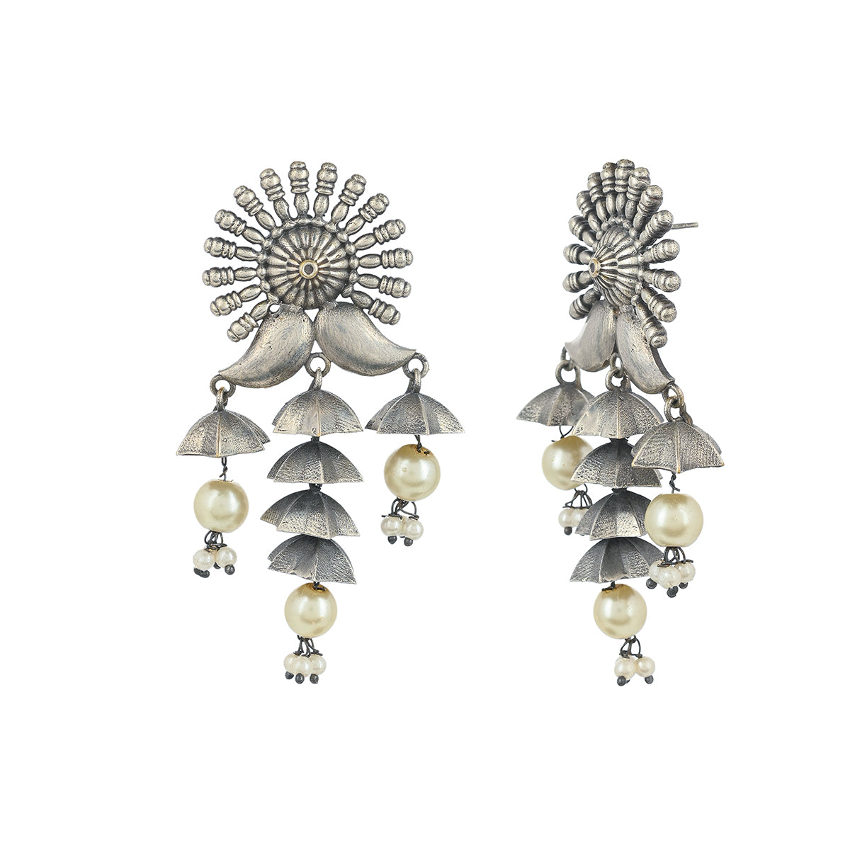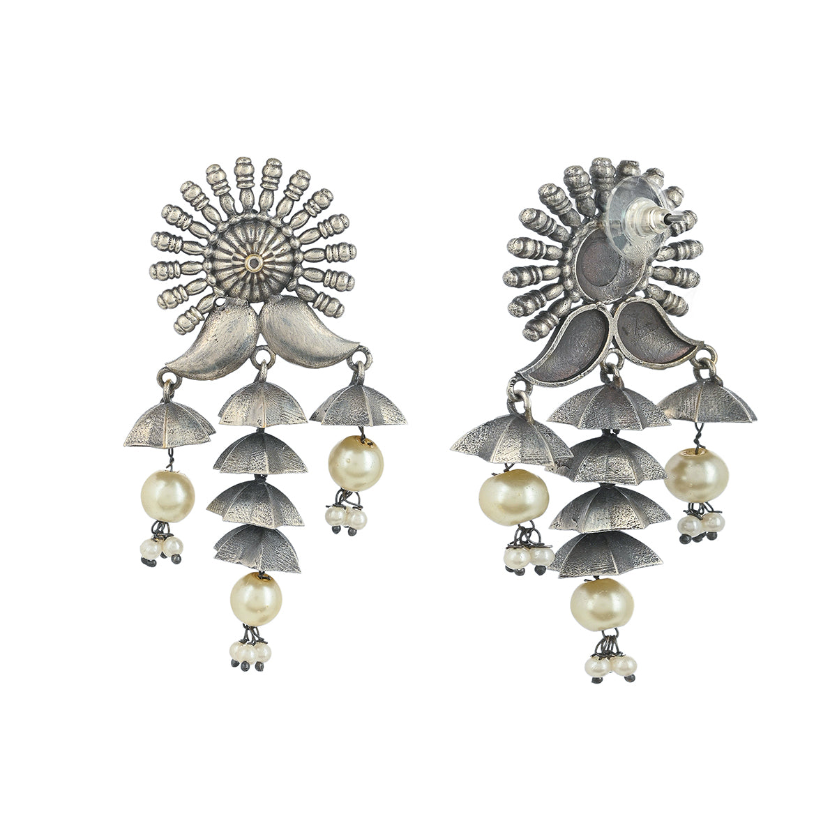 Antique Elegance Faux Pearls Adorned Silver Plated Brass Layered Drop Earrings