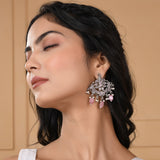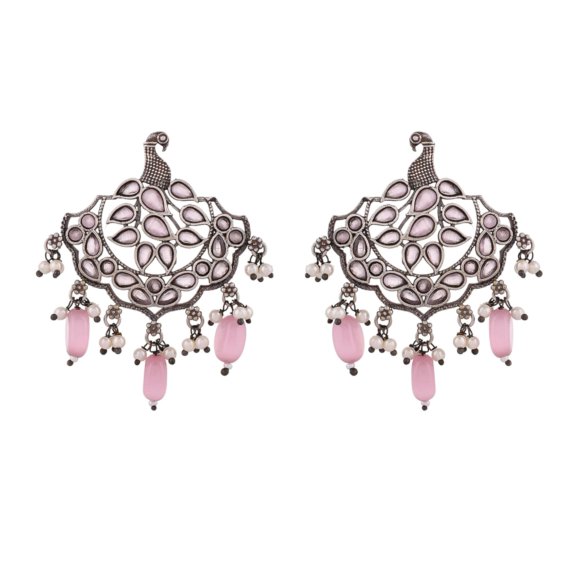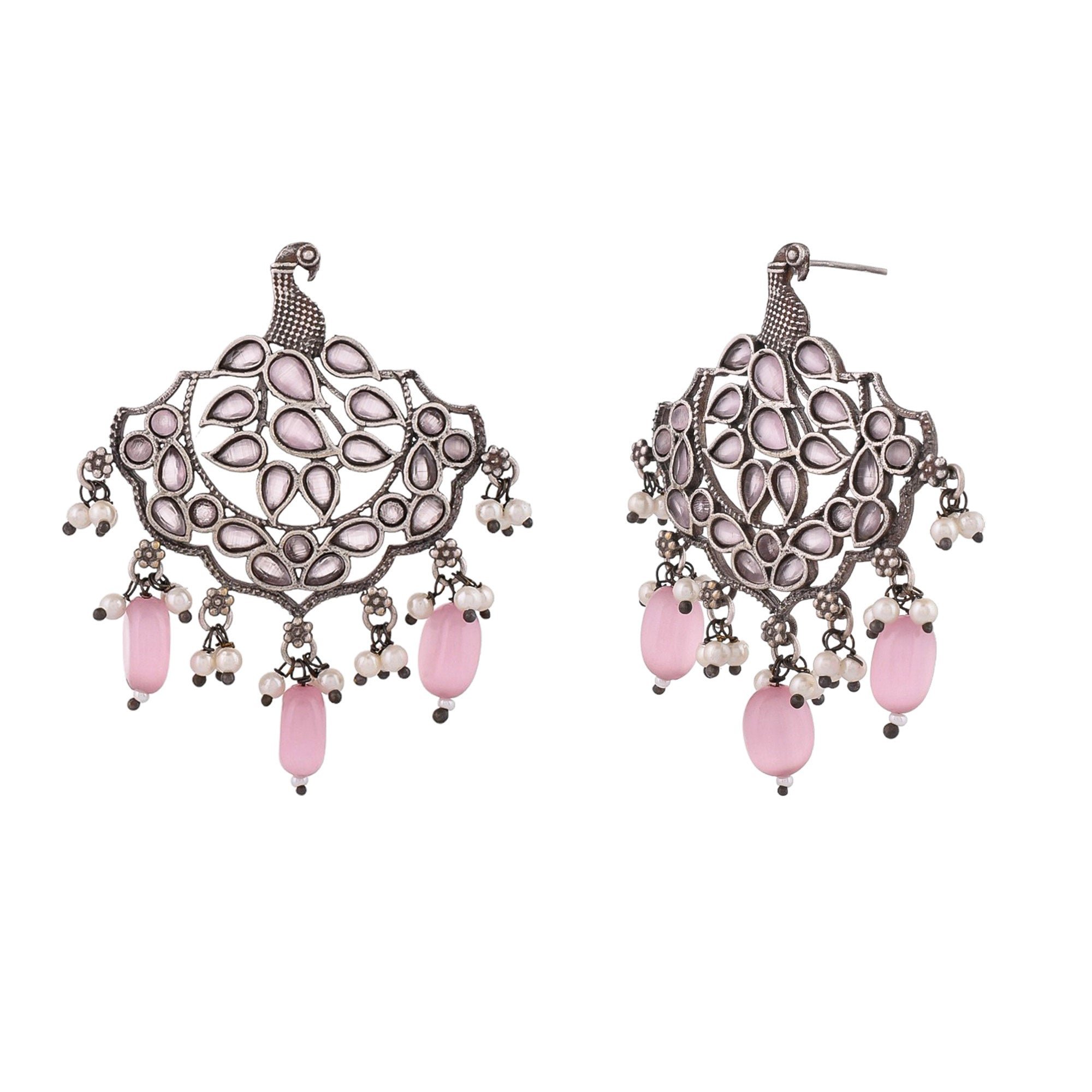Oxidized silver plated vintage inspired drop earrings, fashioned out of quality brass into a delicate design. Featuring heavy faux pearls and kundan gems embellishments, the lightweight pair promises to be a comfortable wear at all times. Wear the earrings with a saree or evening gown to add sparkle to the whole look.
