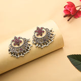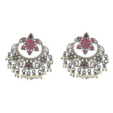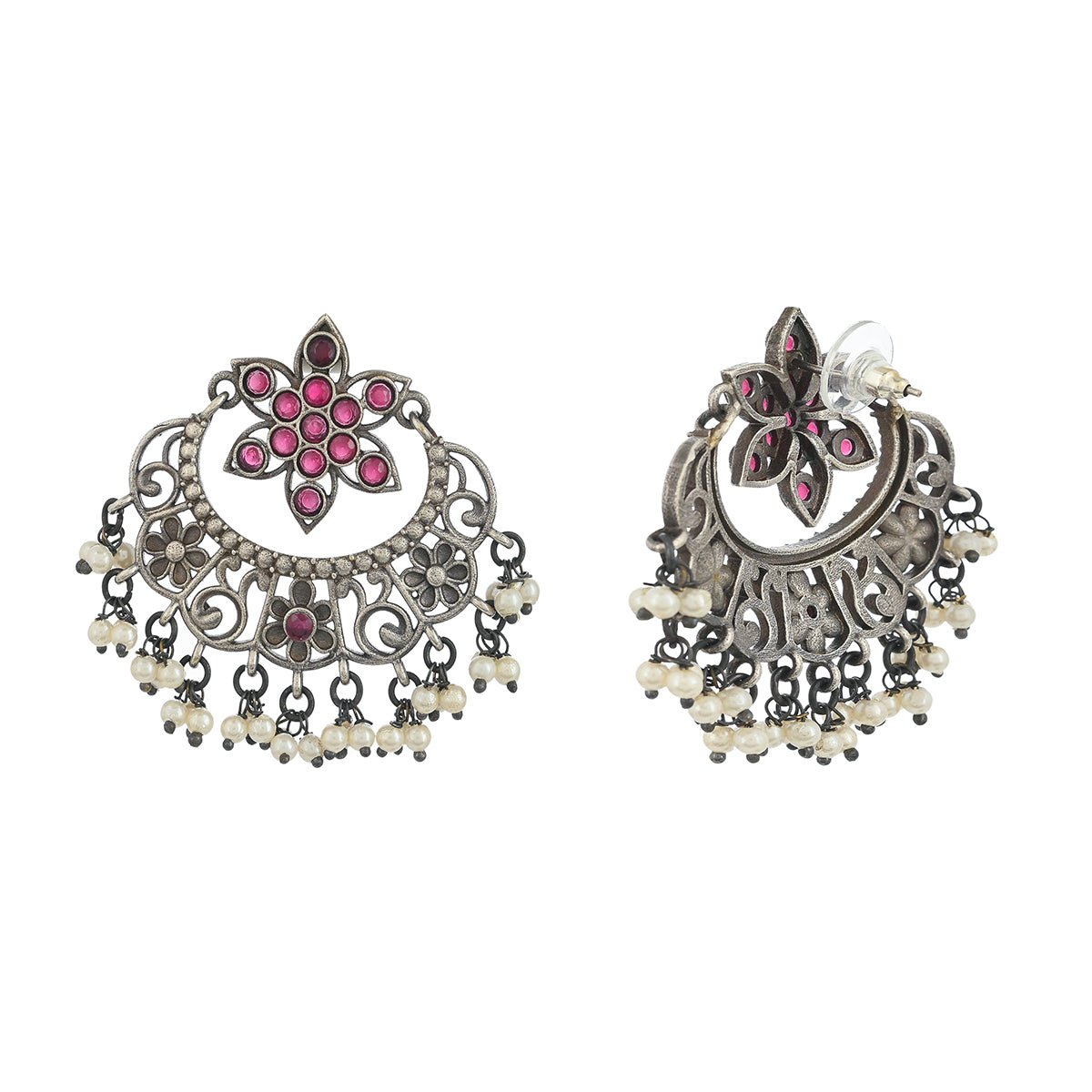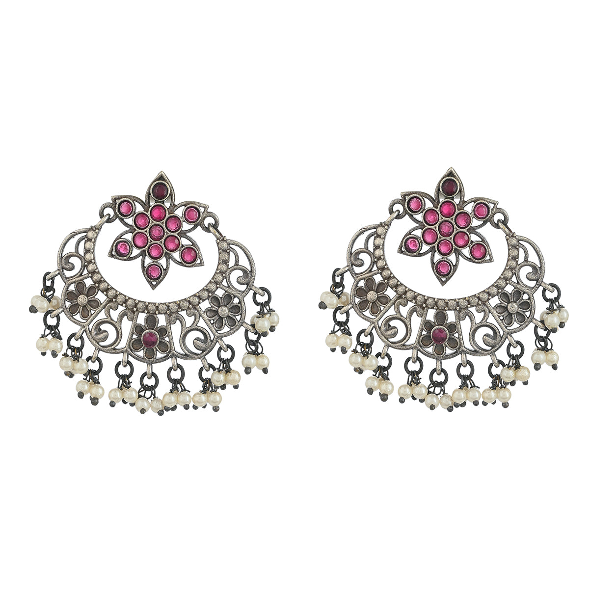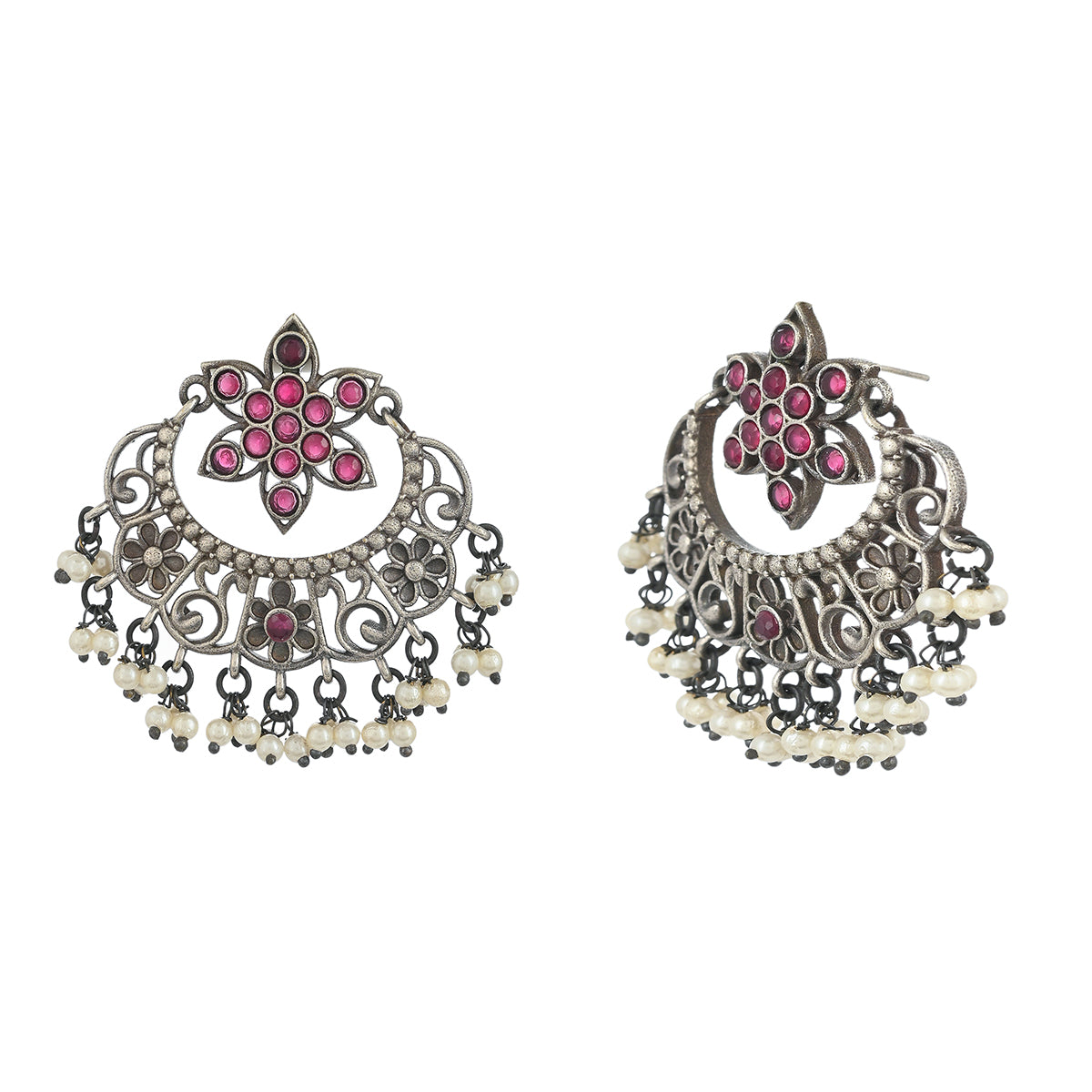 Fashioned from brass into a delicate filigree design, these earrings have been given an oxidised silver plating that adds to their antique charm. Embellished with faux pearls and kundan gems, the pair is lightweight, comfortable and versatile.