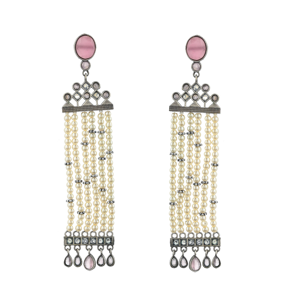 Classic long drop earrings, fashioned out of brass and oxidised silver plated for added charm. Embellished with stones and white faux pearls, the earrings are lightweight and comfortable. Pair with a formal kurta or traditional silk saree.